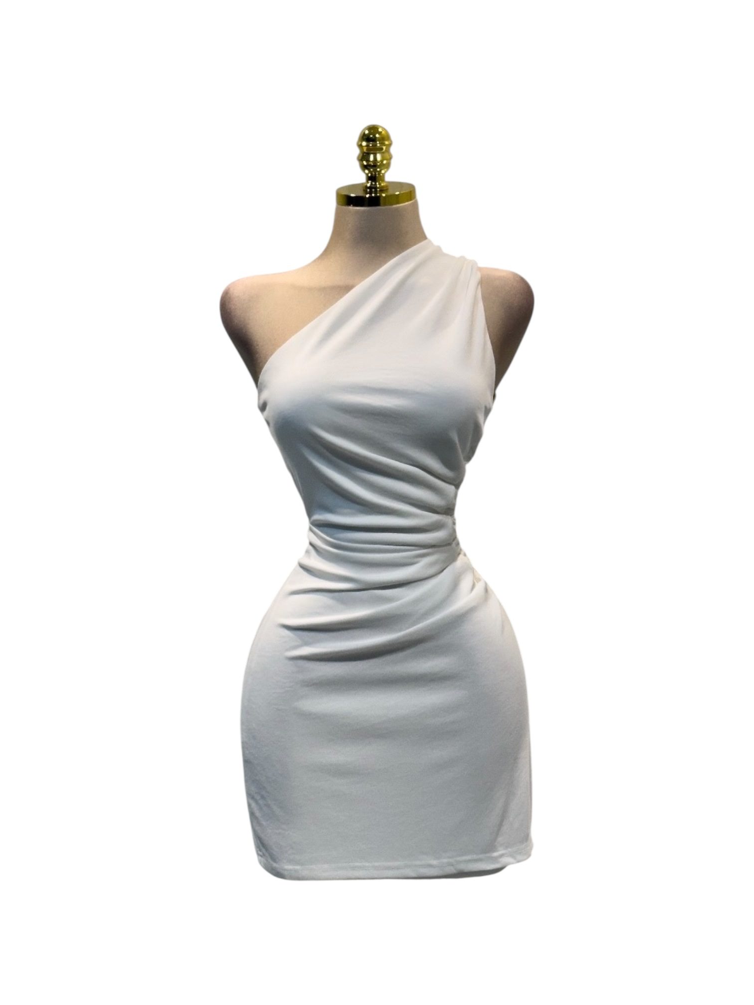 Vestido corto en tono blanco con escote asimétrico que deja un hombro al descubierto, aportando un aire moderno y sofisticado. Presenta diseño drapeado en la cintura que estiliza la silueta y resalta las curvas con delicadeza. Su corte entallado y femenino lo convierte en una opción ideal para cócteles, cenas o salidas nocturnas donde busques destacar con un look elegante y refinado.