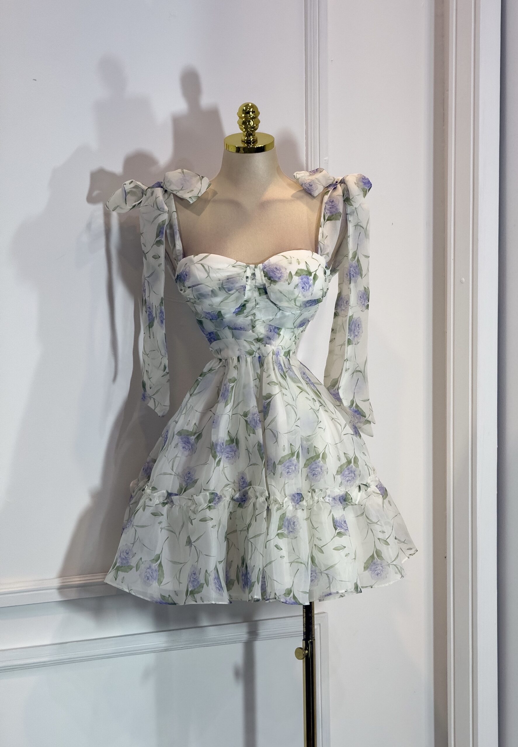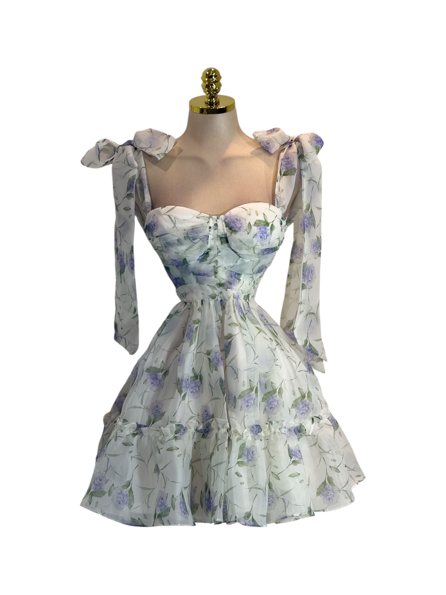 Vestido corto en tono claro con estampado floral en lila y verde. Diseño con escote corazón, tirantes anchos con lazo y falda con ligero vuelo. Ideal para eventos de día y ocasiones especiales.
