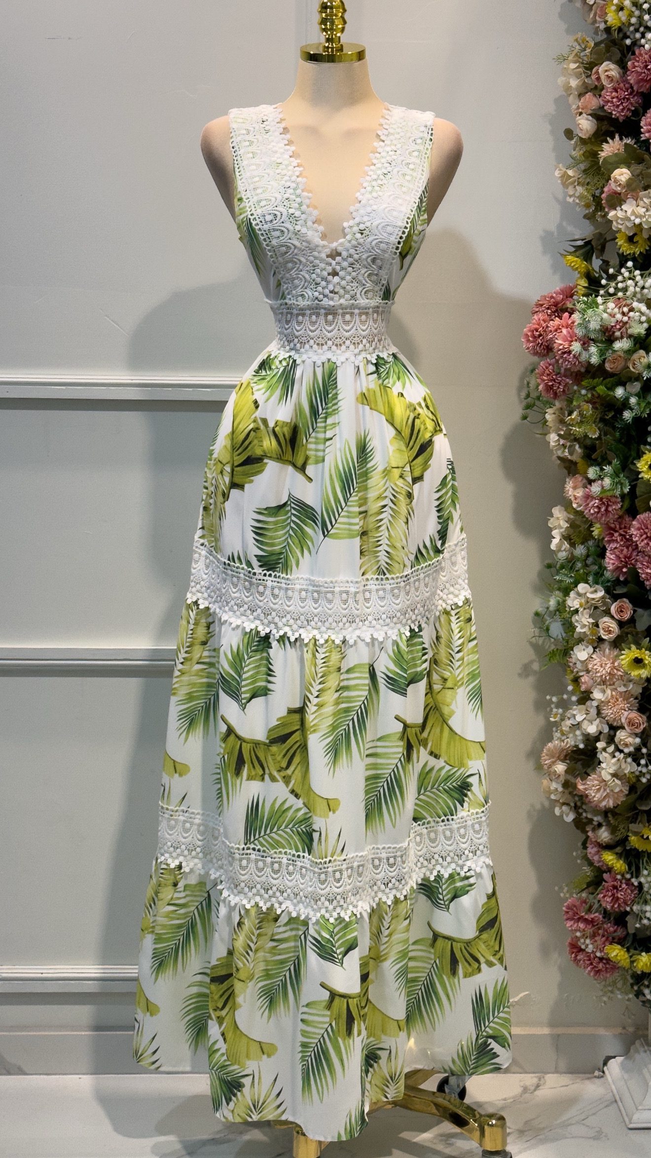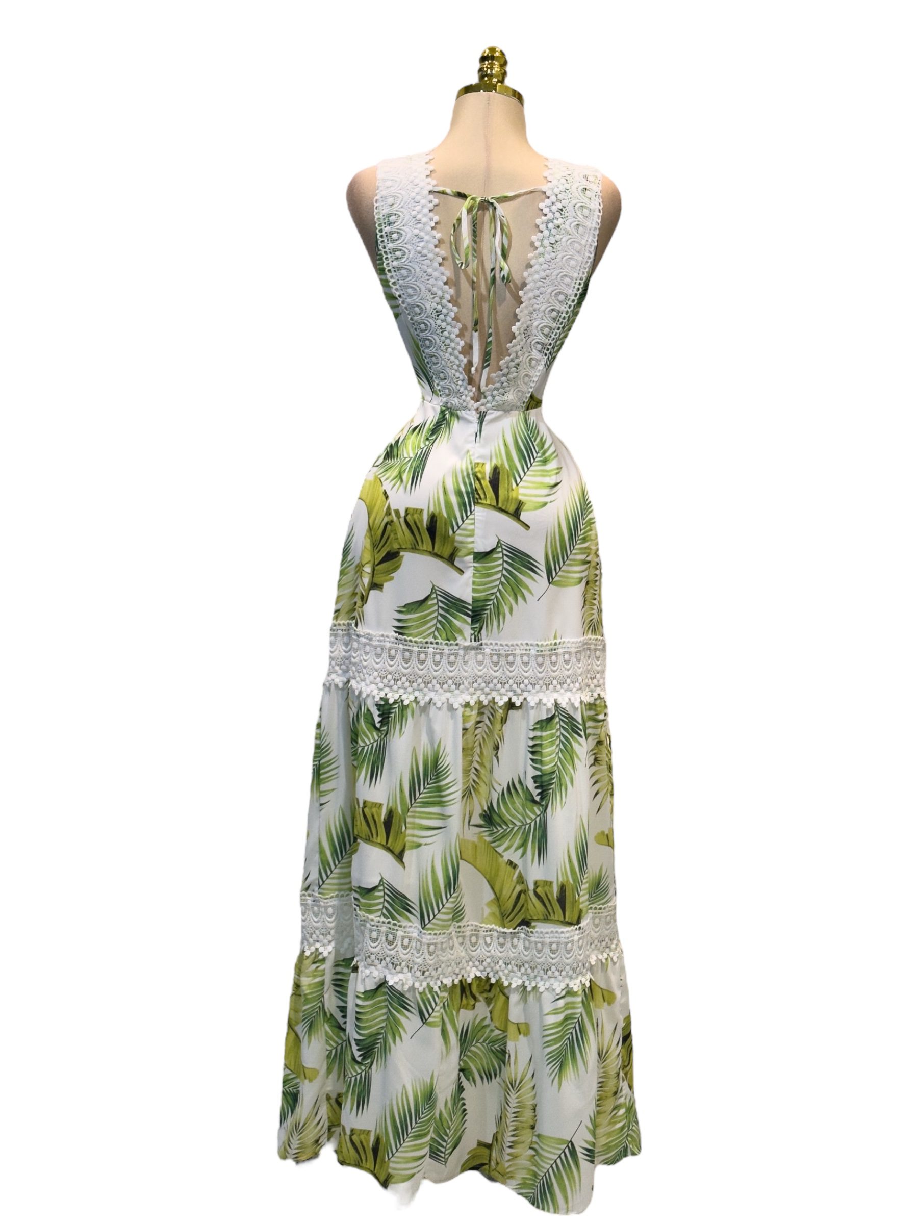 Vestido largo en tono blanco con parte superior de encaje y escote en V que resalta el busto con delicadeza. La falda presenta un alegre estampado de hojas y franjas de encaje que aportan frescura y feminidad. Ideal para eventos de día, celebraciones al aire libre o looks veraniegos con encanto.