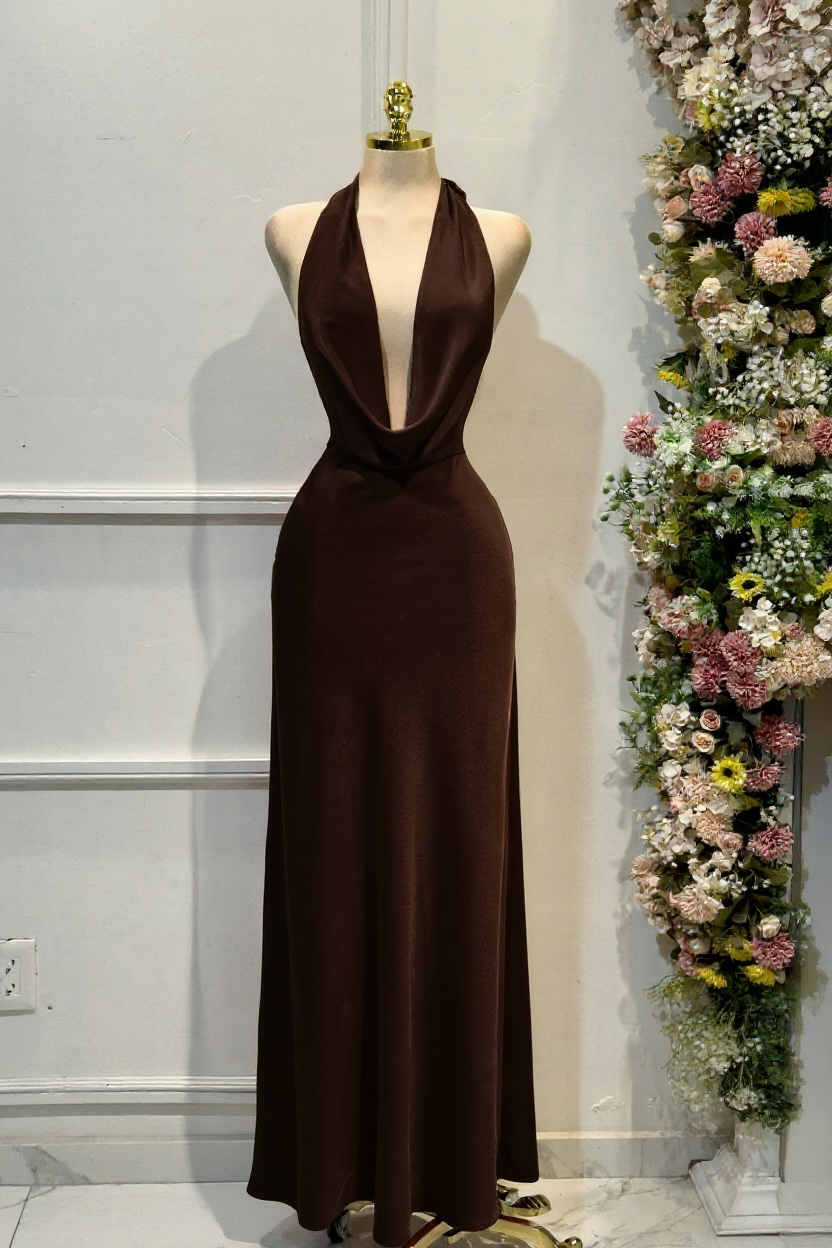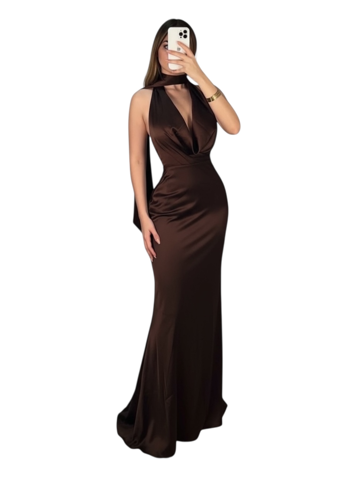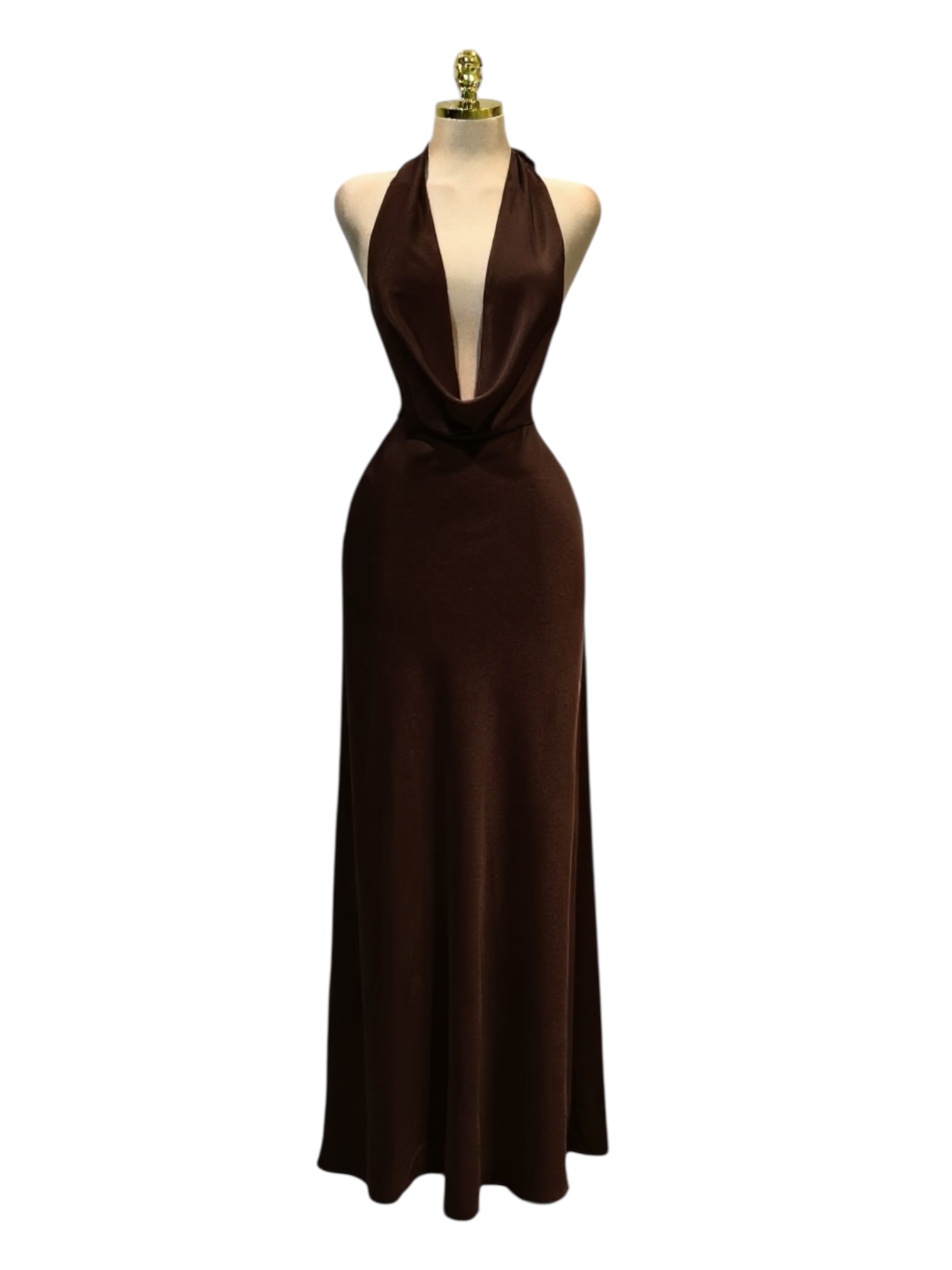 Vestido largo en tono café profundo, confeccionado en tejido suave y con una caída elegante. Destaca su escote pronunciado tipo halter con drapeado fluido, que aporta sensualidad y un efecto estilizado en la parte superior. La silueta entallada realza la figura y se prolonga en una falda larga de caída ligera, creando una línea limpia y sofisticada. Un diseño atractivo, moderno y refinado, ideal para cenas formales, galas o eventos nocturnos donde busques un look poderoso, elegante y lleno de presencia.