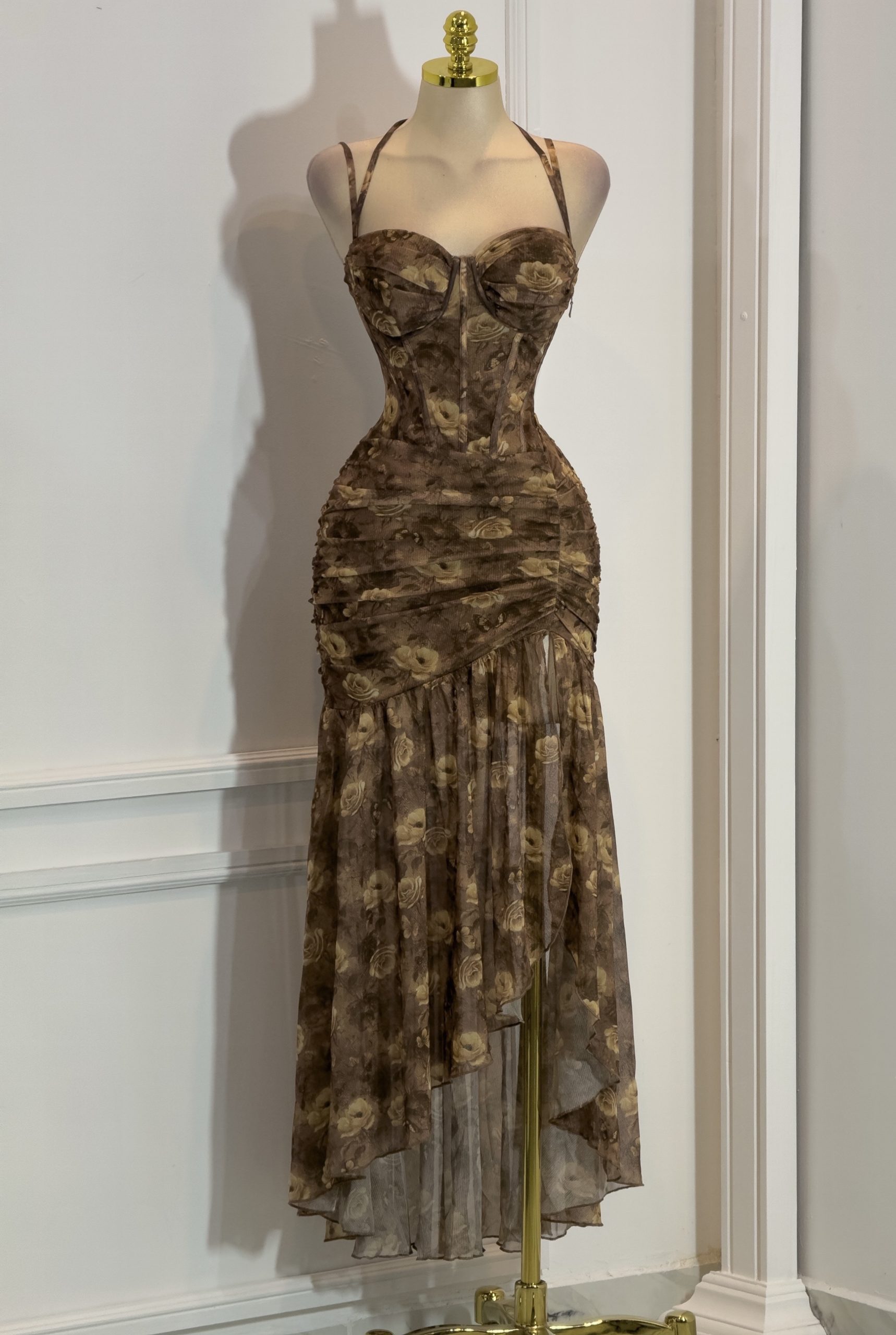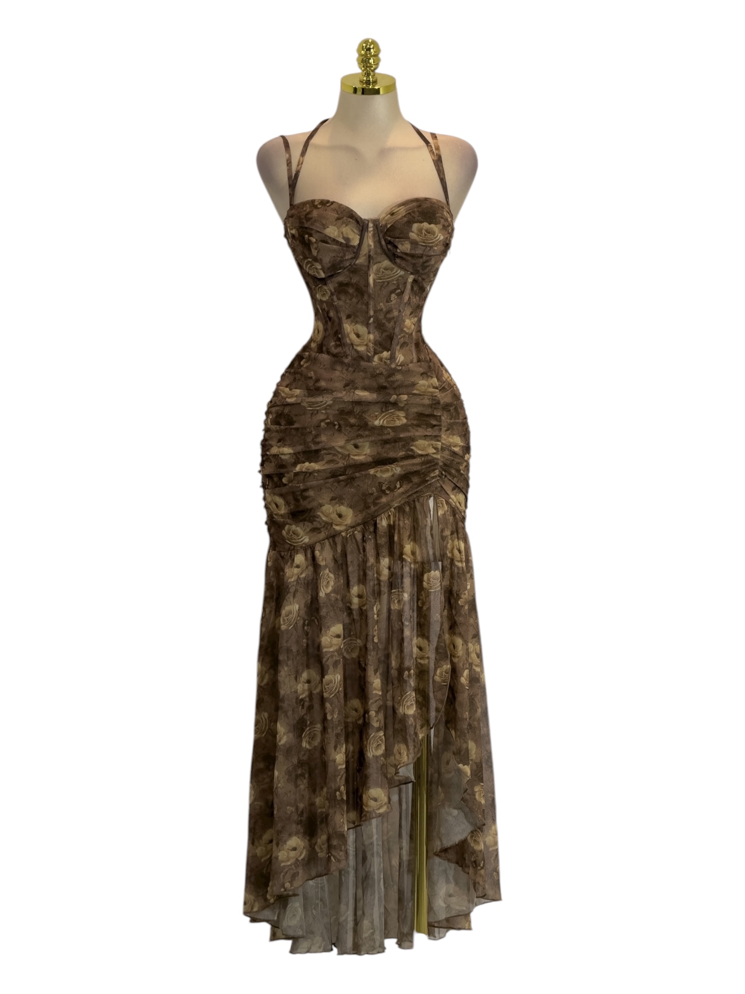 VESTIDO: LARGO CAFE CON ESTAMPADO FLORAL Y CORSET ESTRUCTURADO