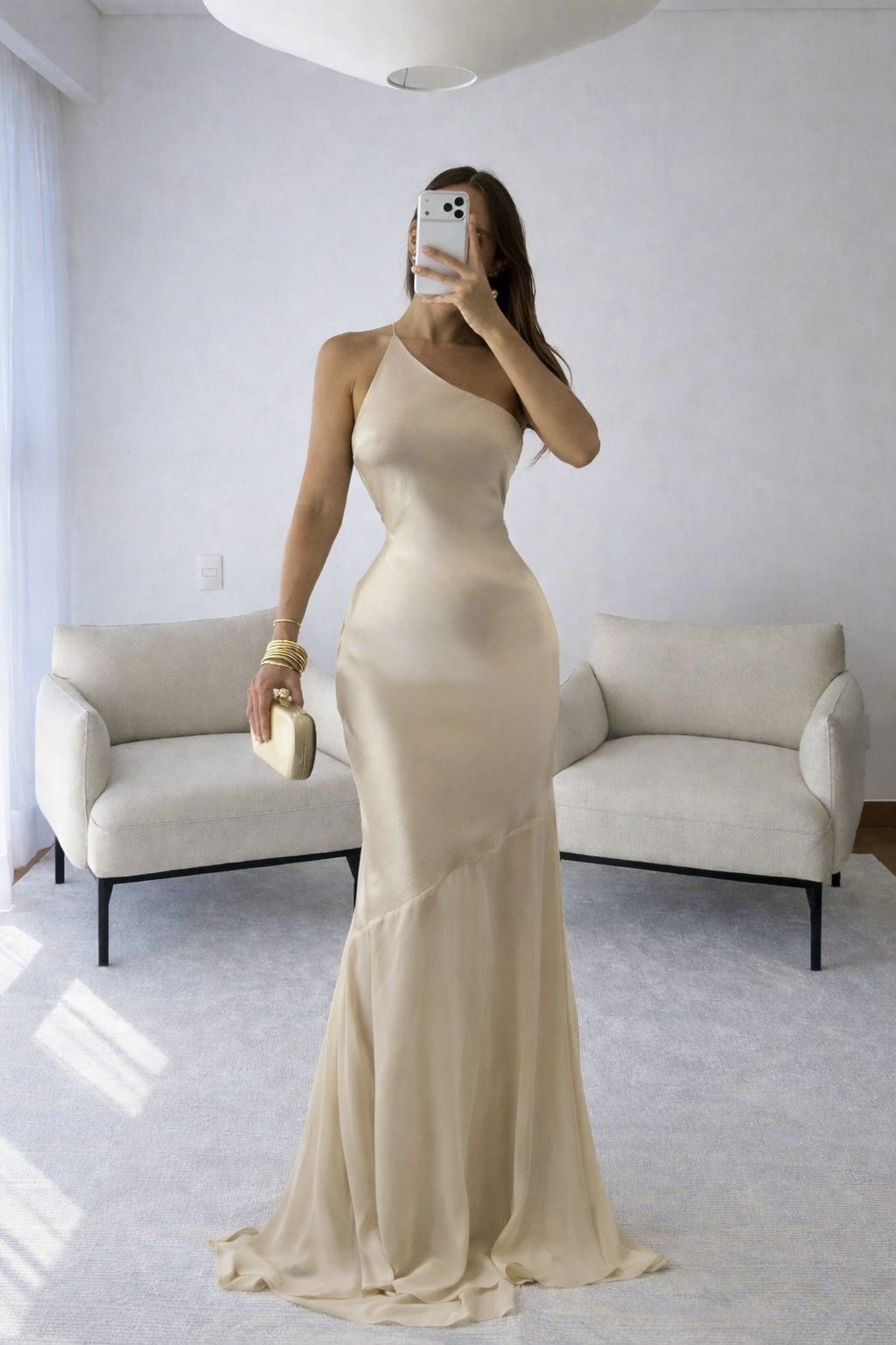 Vestido Champagne Satinado De Un Hombro Con Caída Fluida