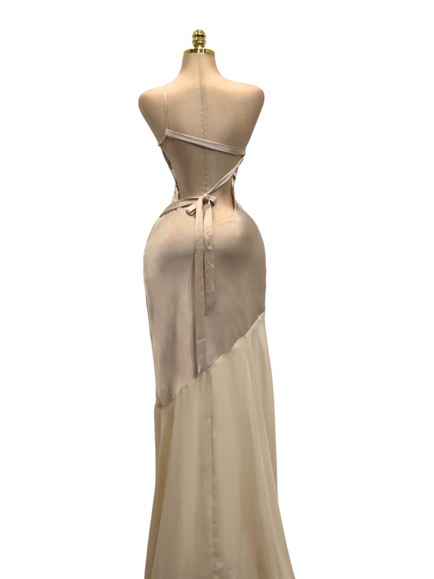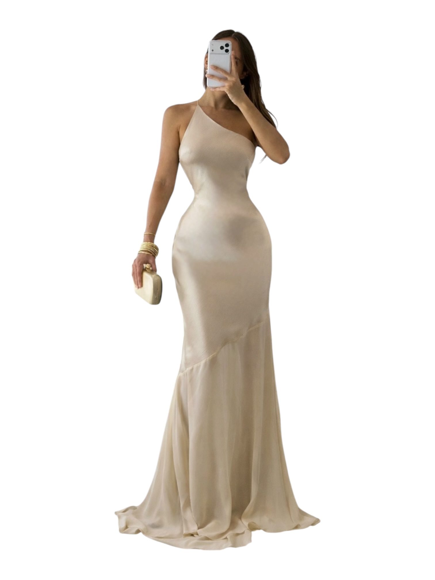 Vestido largo en tono champagne con escote asimétrico de un solo hombro. Diseño entallado que estiliza la silueta con falda de caída fluida y ligera transparencia en la parte inferior. Ideal para eventos formales o de noche.