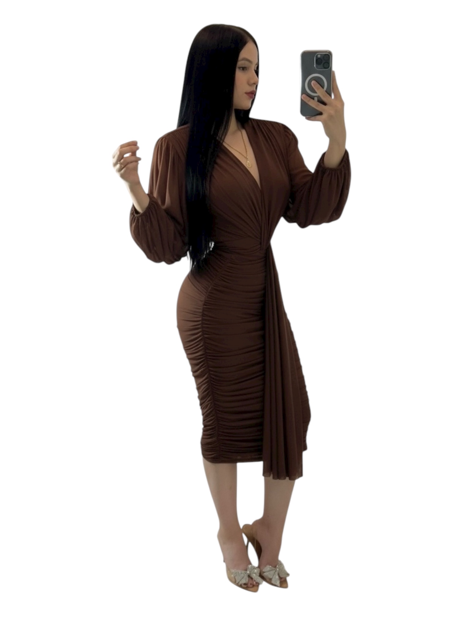 Vestido midi en tono chocolate con acabado ligeramente brillante que aporta elegancia y distinción. Presenta escote cruzado en “V” que realza el busto con sutileza y mangas largas tipo globo que añaden volumen y un toque romántico. El frunce a lo largo de la falda define la figura y crea un efecto visual favorecedor, mientras que la caída central al frente aporta movimiento y sofisticación. Ideal para cenas, cocteles o eventos donde busques un look refinado, moderno y lleno de estilo.