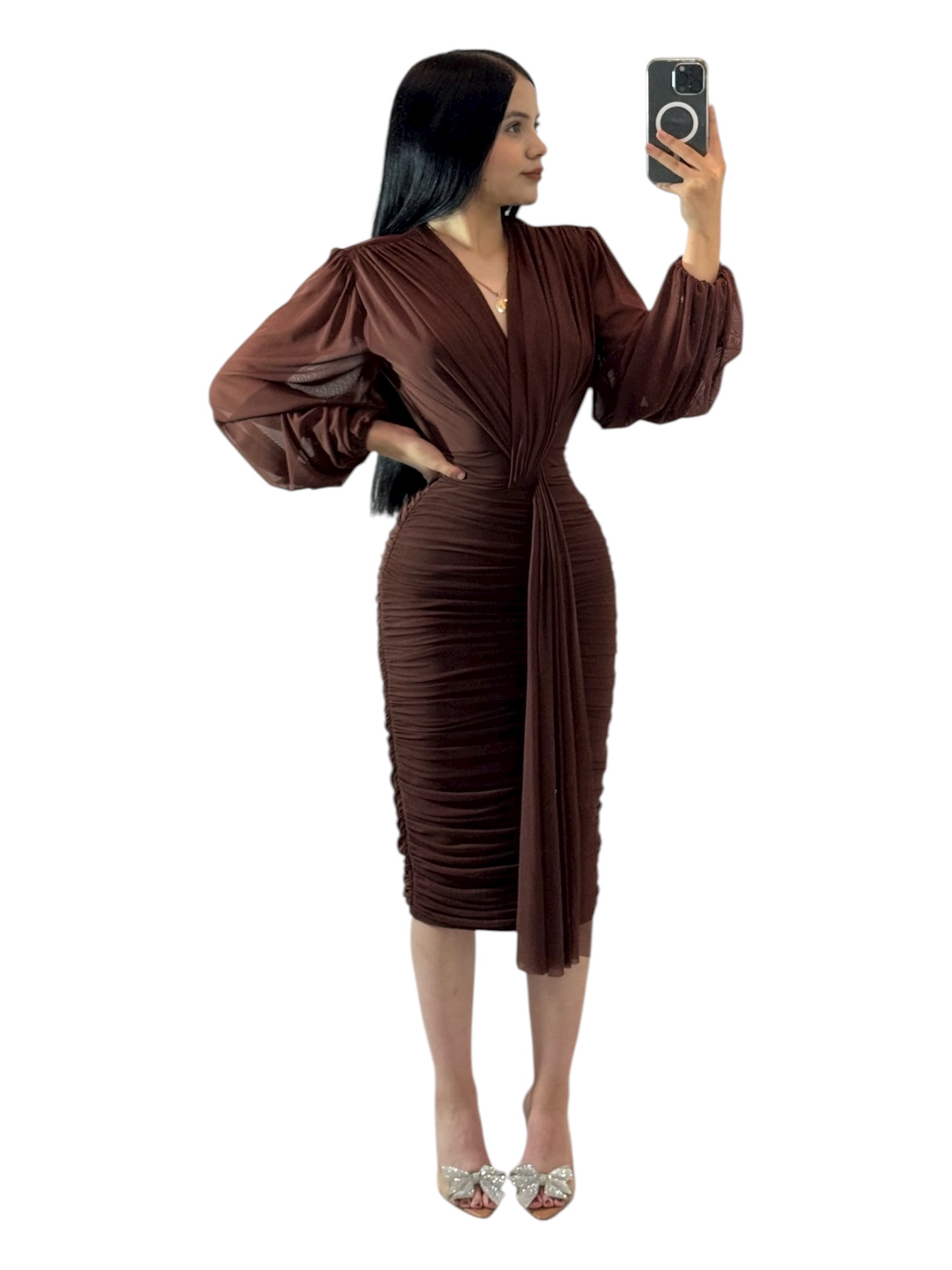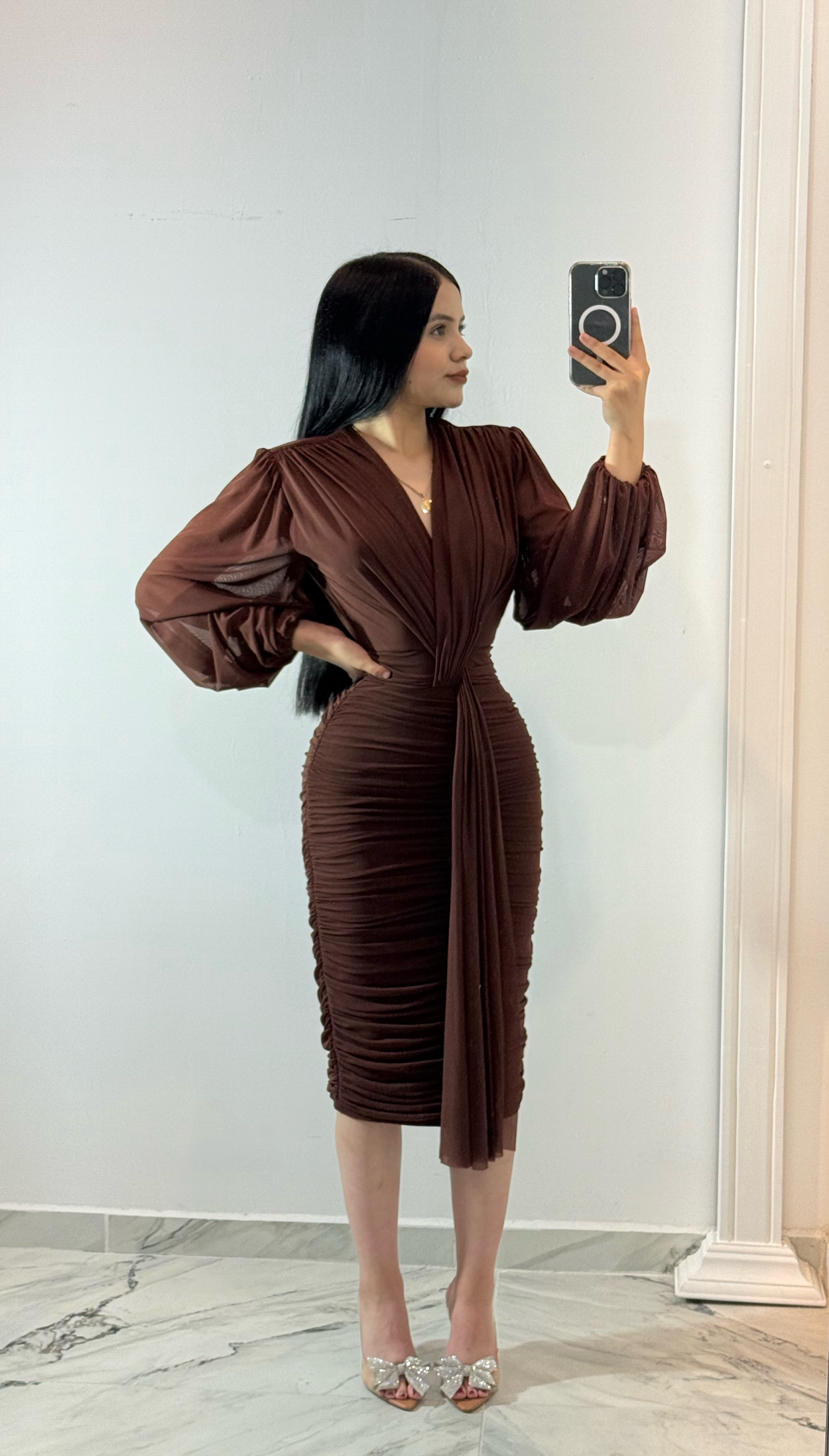 VESTIDO: MIDI CHOCOLATE CON ESCOTE CRUZADO Y MANGAS GLOBO