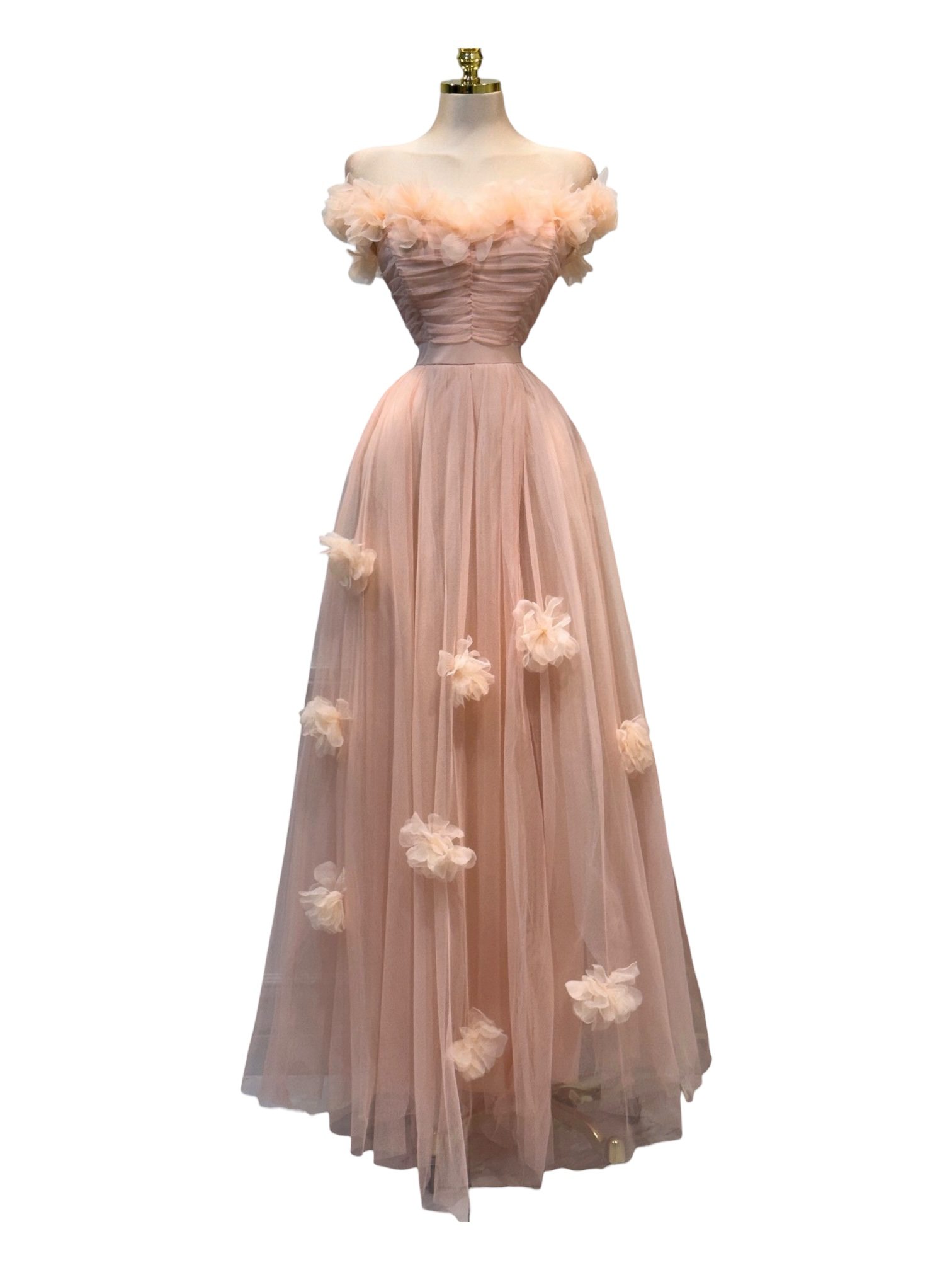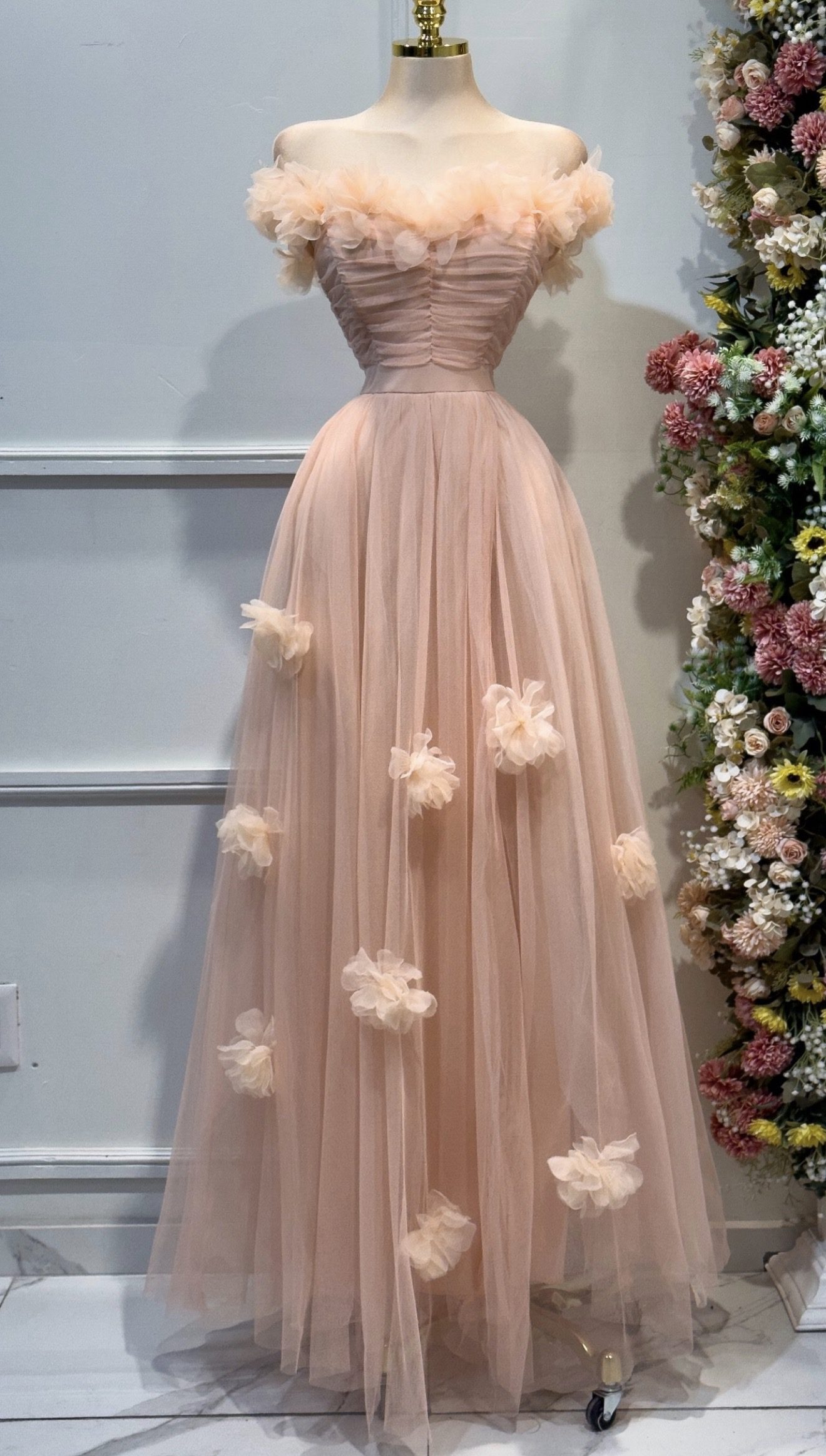 Vestido largo en delicado tono durazno con diseño romántico y elegante. Presenta escote off shoulder con olán de tul que realza los hombros y un corset fruncido que define la silueta. La falda de tul fluido con aplicaciones florales aporta movimiento y un acabado etéreo. Ideal para bodas, eventos formales y ocasiones especiales.