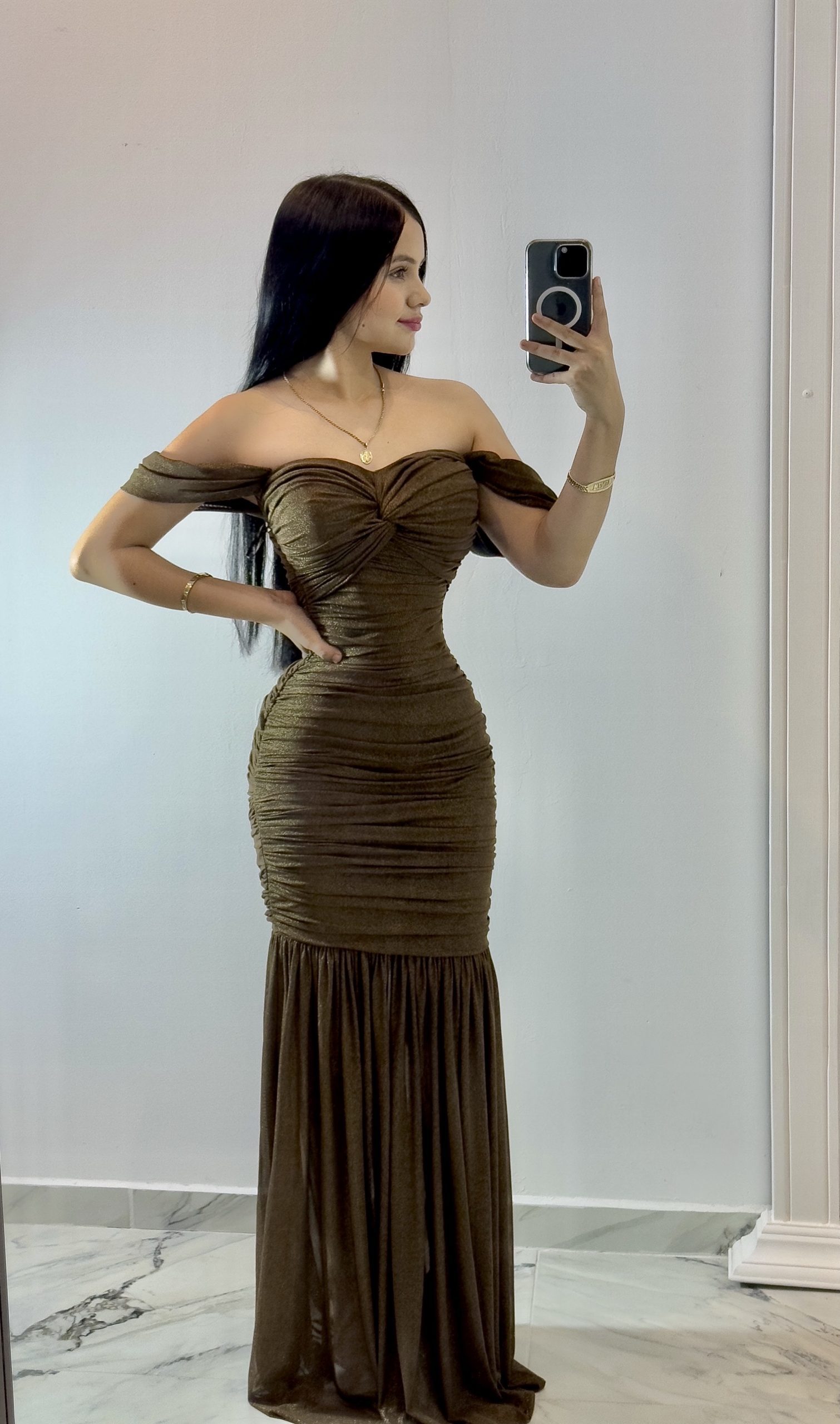 Vestido largo en tono moka confeccionado con sutil brillo dorado que resalta la figura con elegancia. Presenta escote bardot que deja los hombros al descubierto, acompañado de un delicado drapeado en el busto que aporta un toque romántico y sofisticado. La cintura entallada moldea la silueta, mientras que la falda plisada con caída fluida añade movimiento y un aire refinado. Ideal para galas, cenas o eventos de noche donde busques un look glamuroso, femenino y lleno de distinción.