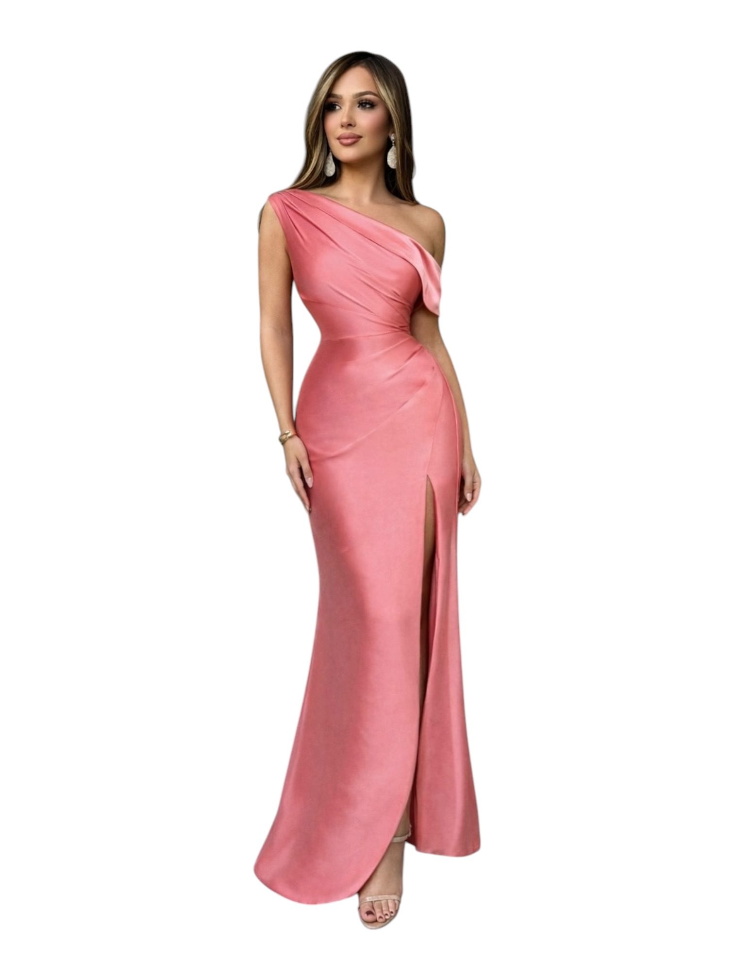 Vestido Coral Satinado De Un Hombro Con Abertura Y Corte Elegante