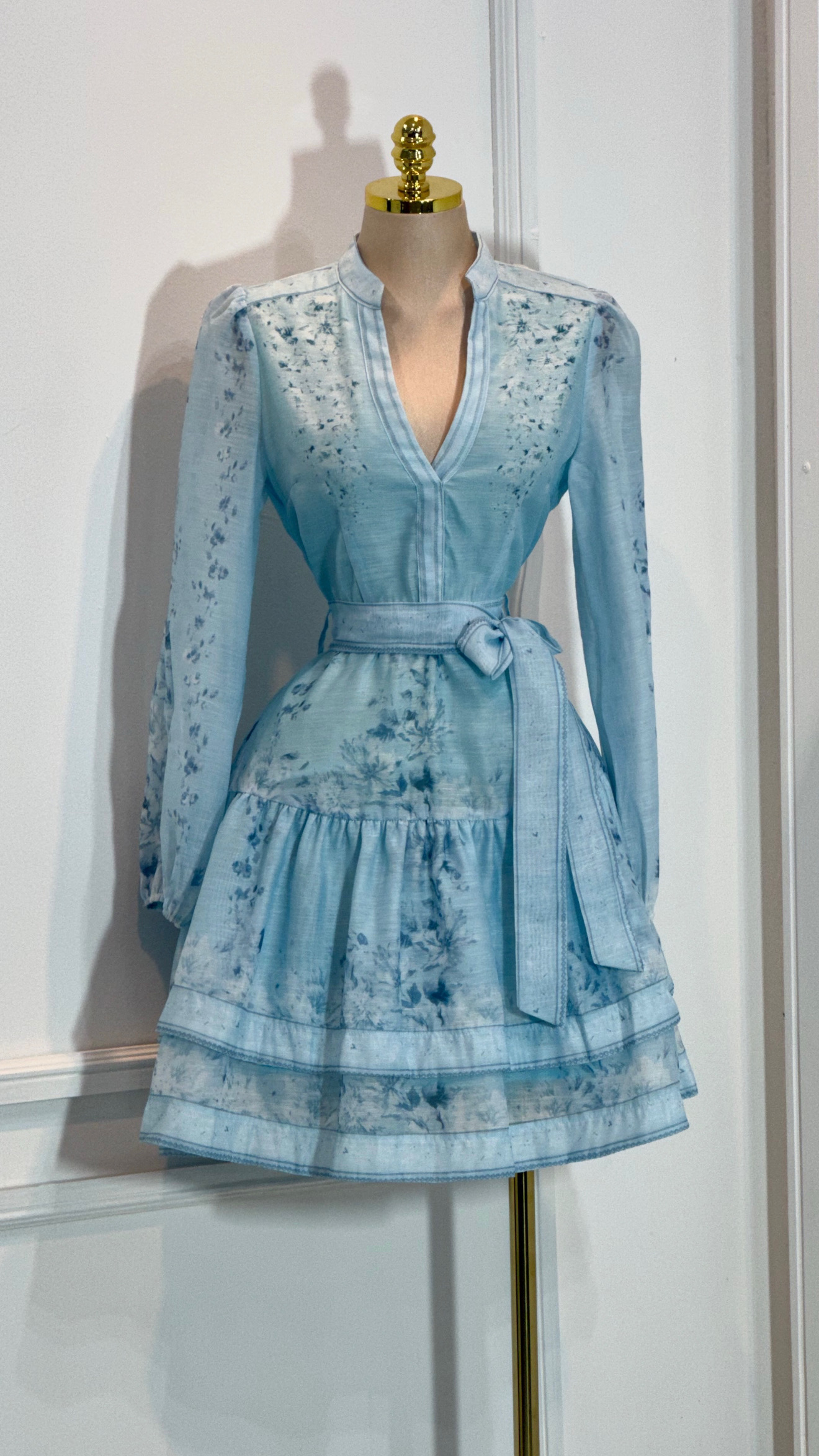 Vestido corto en tono azul claro con delicado estampado floral. Presenta escote en V con cuello tipo mao y mangas largas que aportan un estilo femenino y elegante. El cuerpo entallado define la cintura e incorpora cinturón a juego, mientras que la falda corta con volantes añade movimiento y un acabado romántico. Ideal para eventos de día, celebraciones y ocasiones especiales.