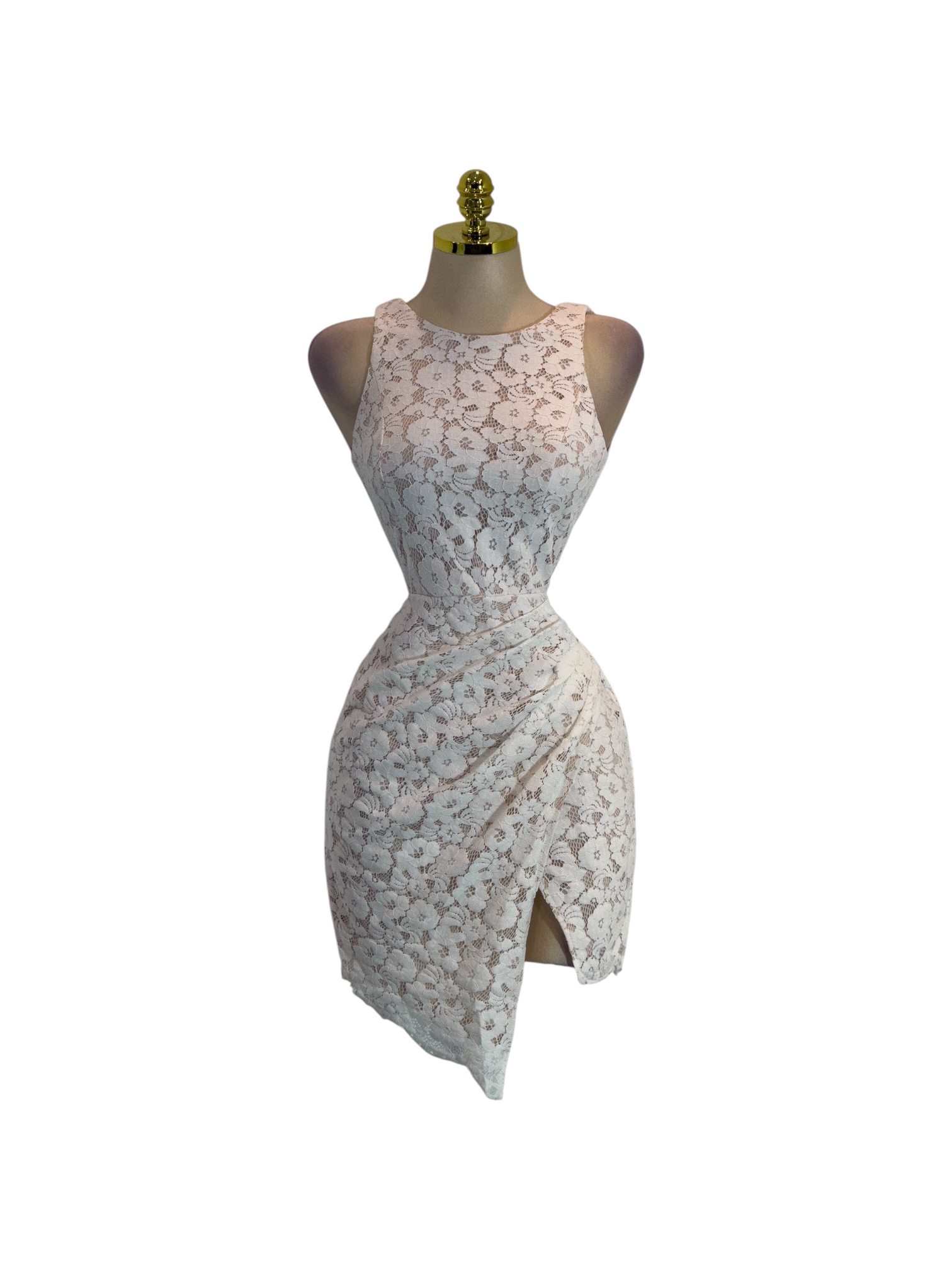 Vestido Corto Blanco De Encaje Con Corte Asimétrico