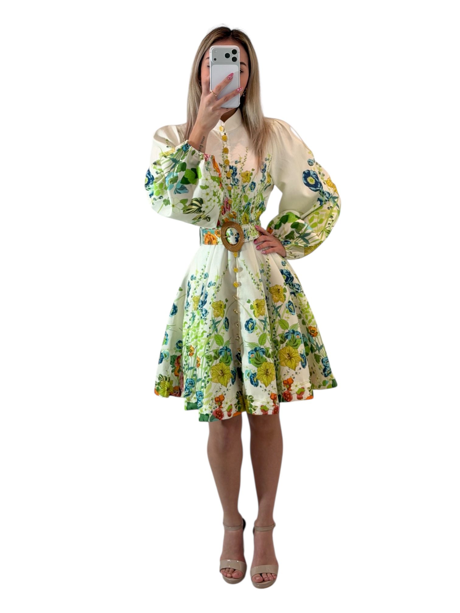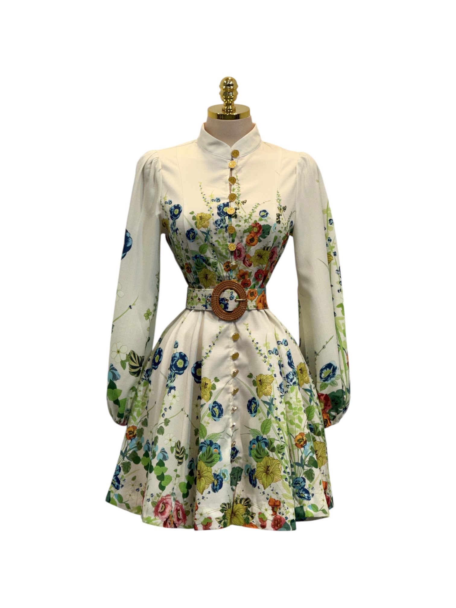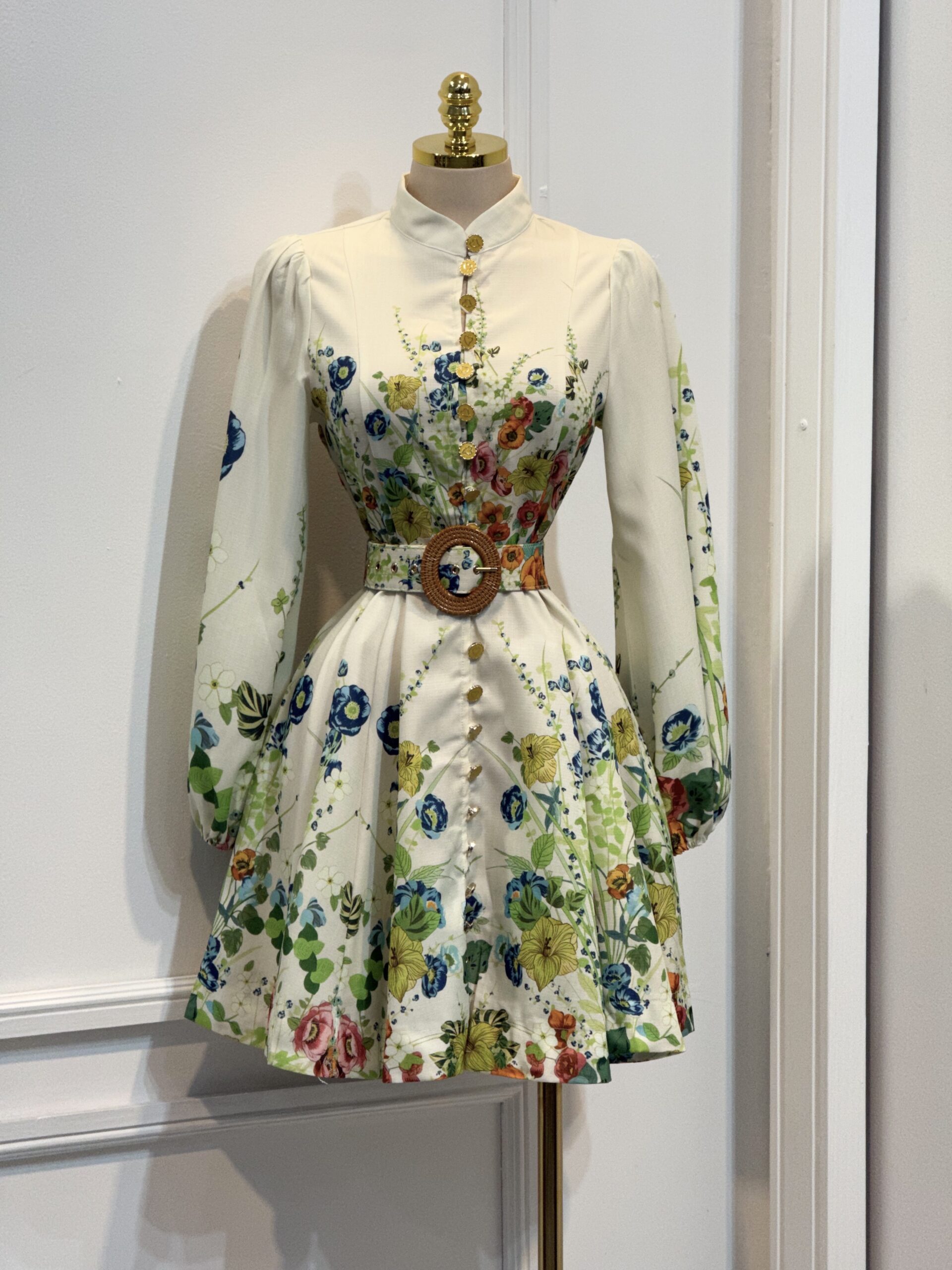 Vestido corto con estampado floral multicolor, cuello alto tipo camisero y botones frontales. Mangas largas abullonadas y cinturón que define la cintura. Femenino y elegante, ideal para eventos de día y ocasiones especiales.