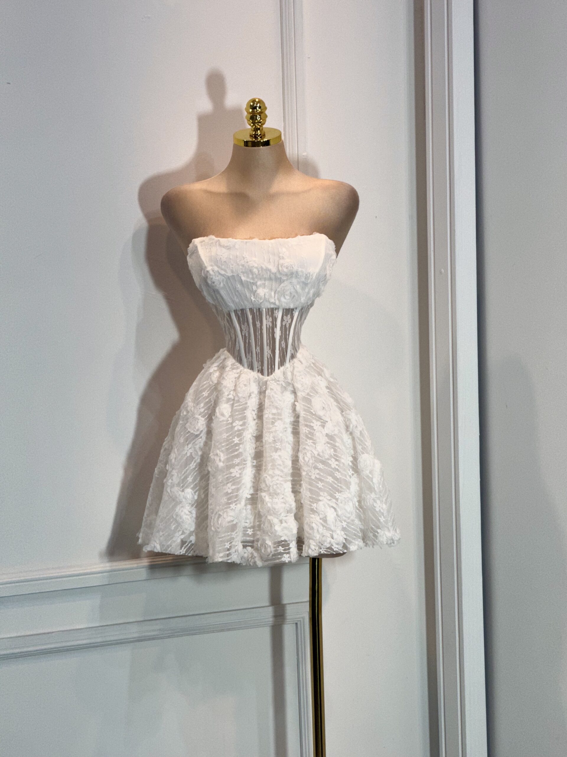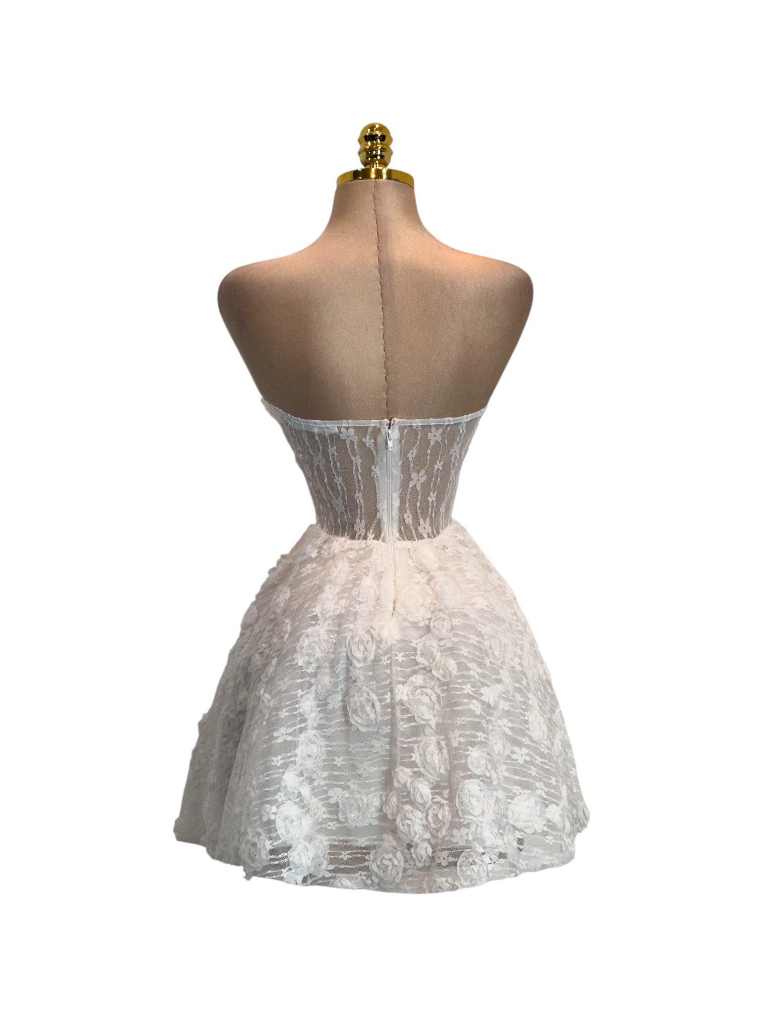 Vestido corto strapless con encaje floral y diseño tipo corset que realza la silueta. Elegante y femenino, ideal para eventos y ocasiones especiales.