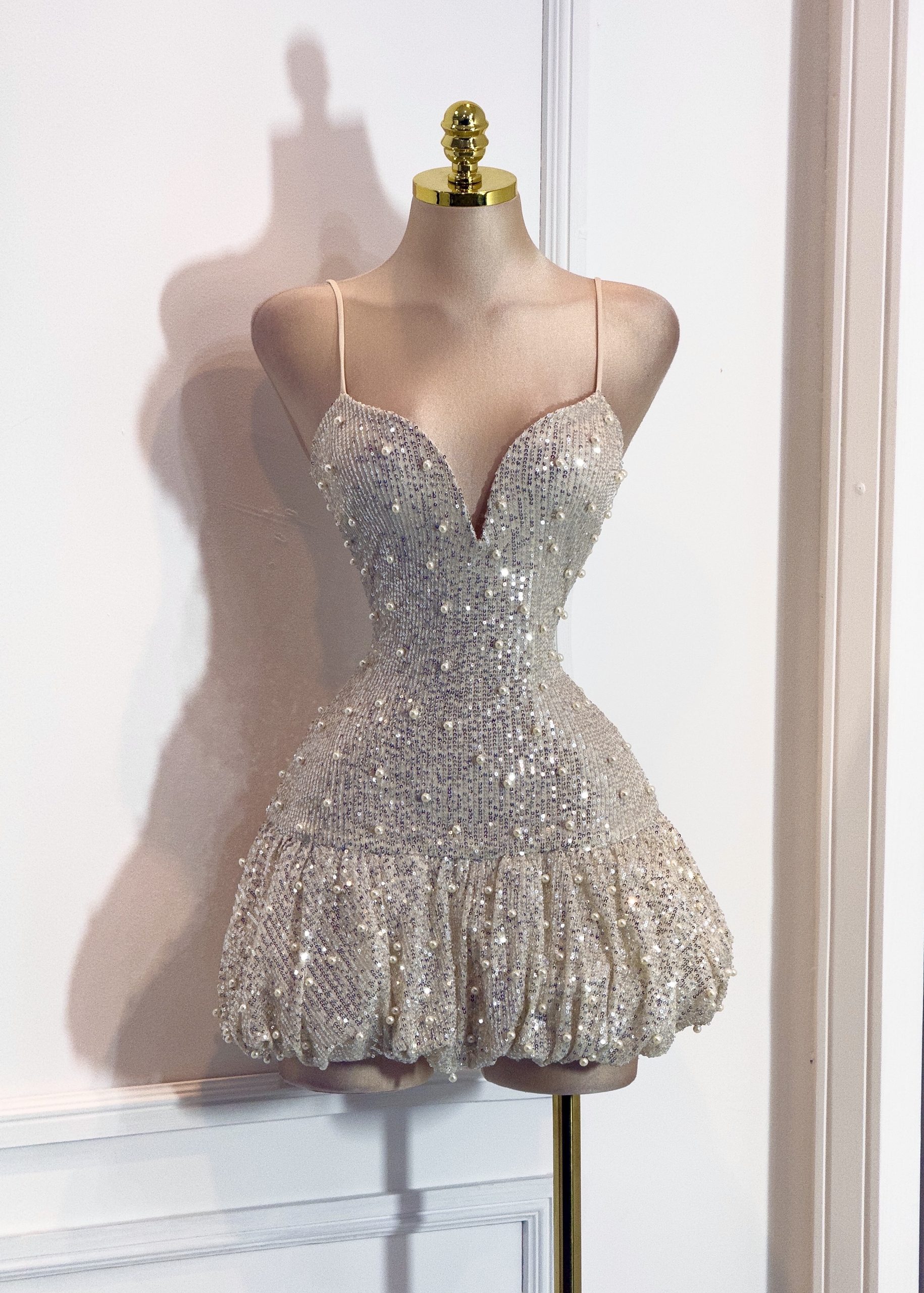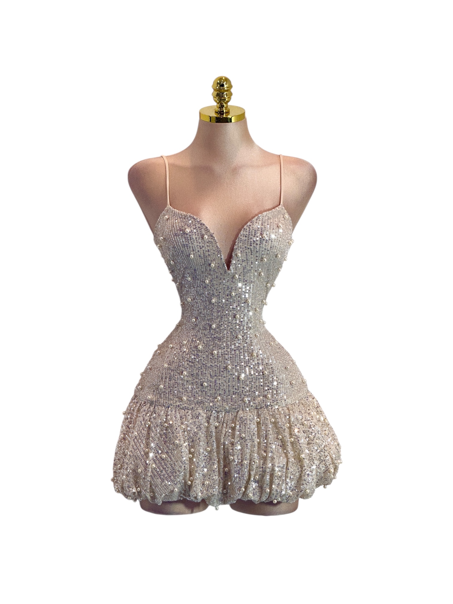 Vestido corto en tono champagne con un diseño totalmente brillante, glamuroso y de alto impacto visual. Presenta tirantes delgados y un escote pronunciado en “V” que realza el busto con un acabado sensual y elegante. El cuerpo entallado está cubierto de lentejuelas que aportan textura y luminosidad en cada movimiento. La falda corta tipo globito incorpora un volumen sutil y un acabado completamente bordado en brillos, creando un efecto llamativo y exquisito.