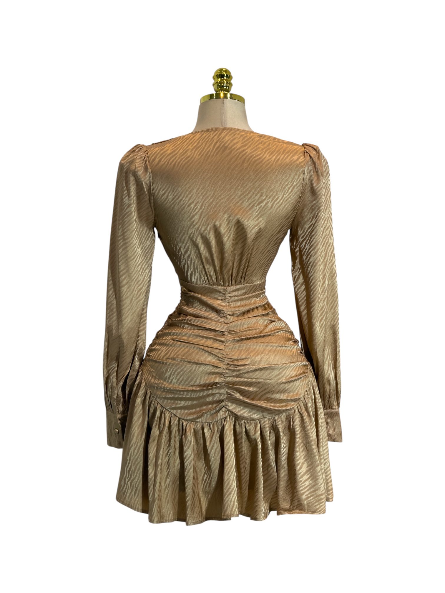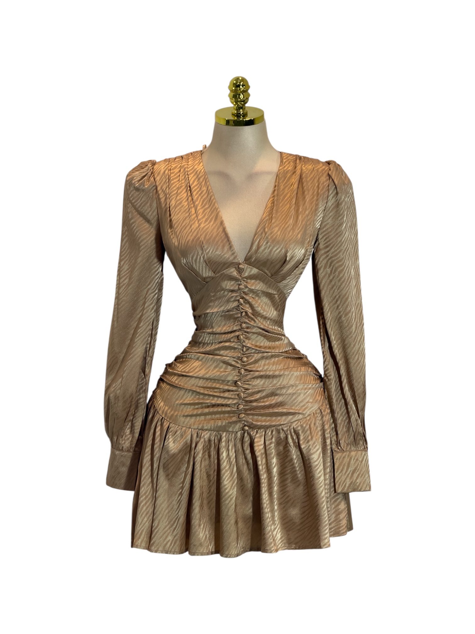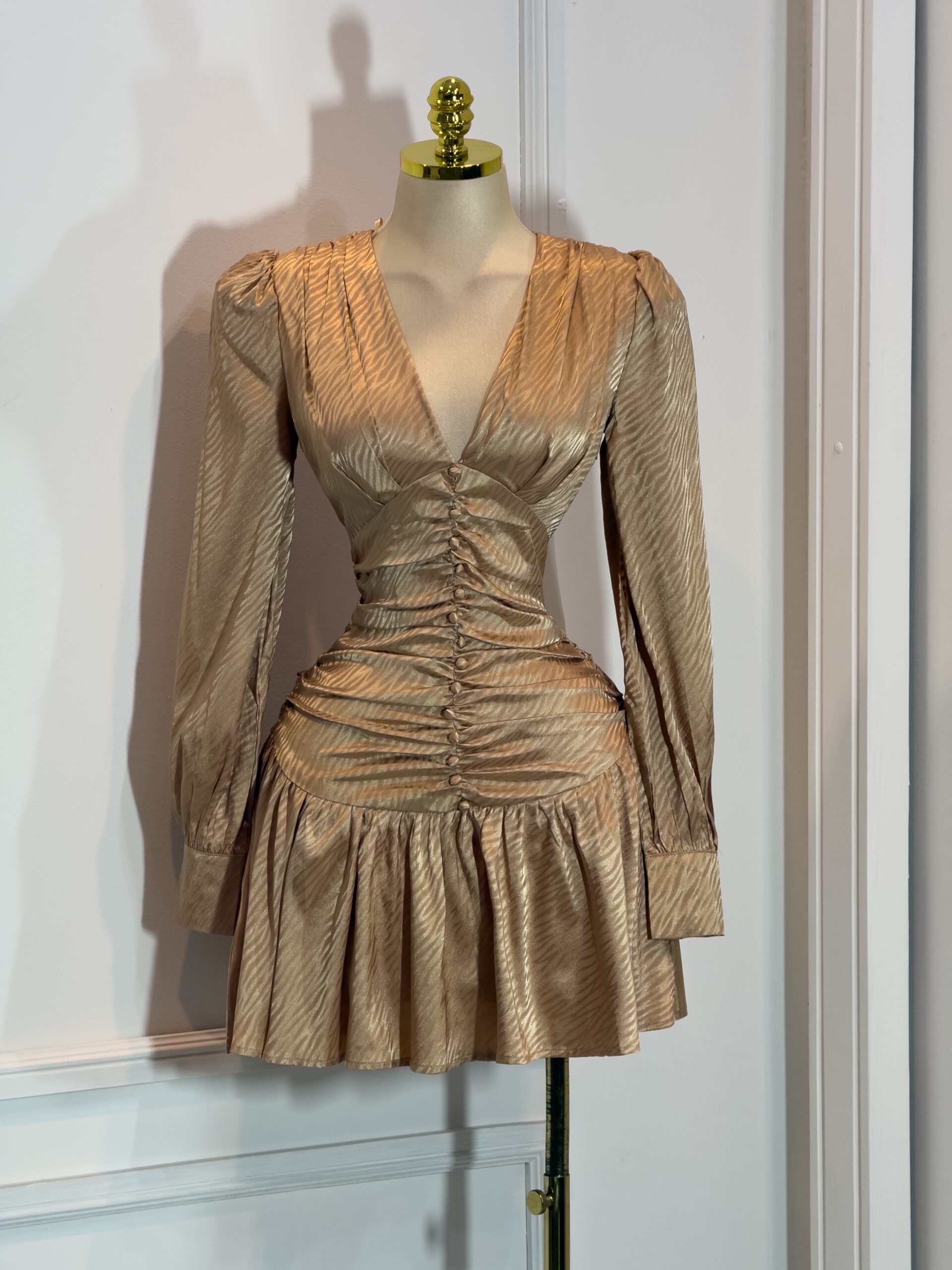 Vestido corto en tono dorado satinado con escote en V y manga larga. Diseño entallado con fruncido frontal y botones decorativos que estilizan la figura. Falda con ligero vuelo para un acabado femenino y sofisticado. Ideal para fiestas y eventos especiales.