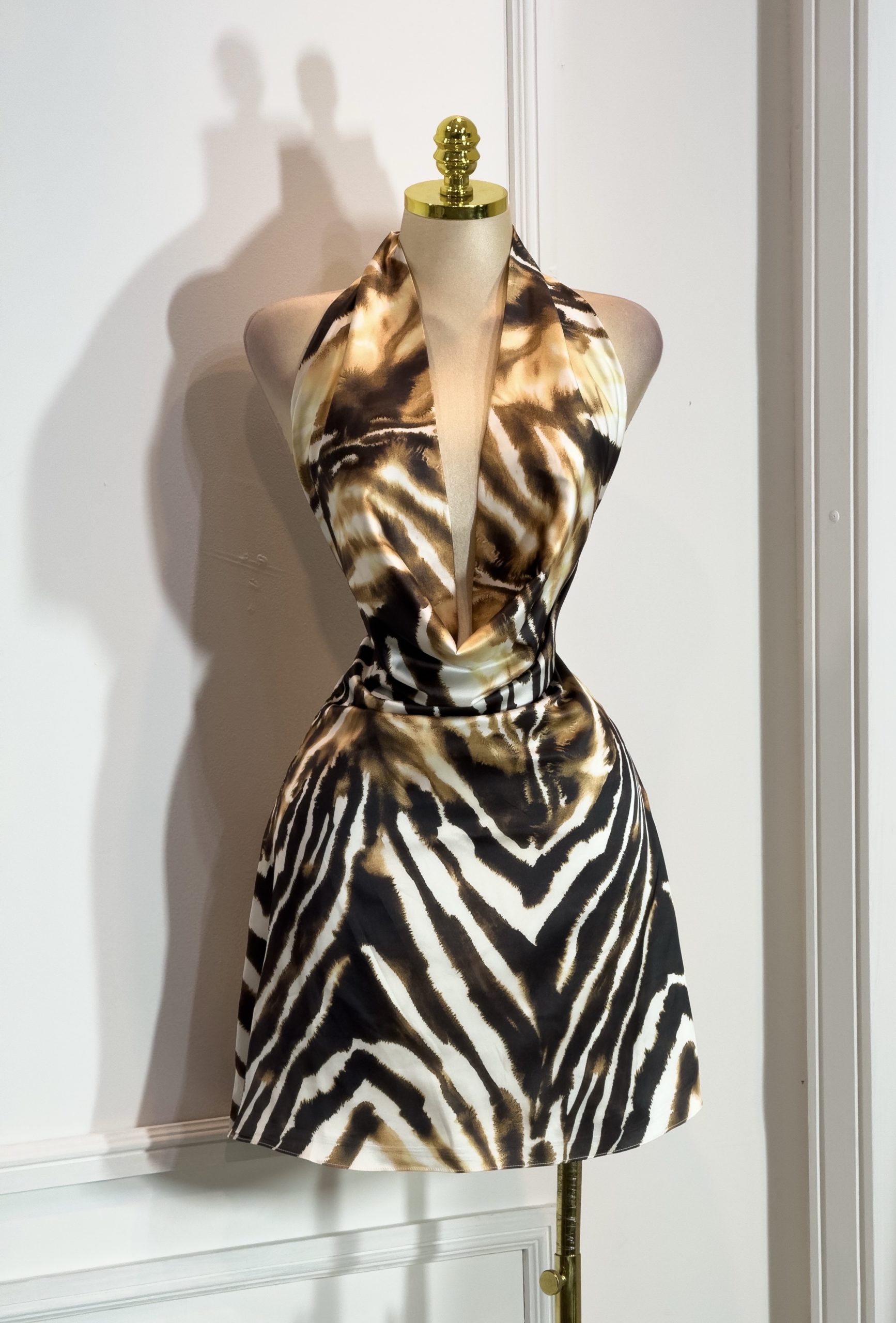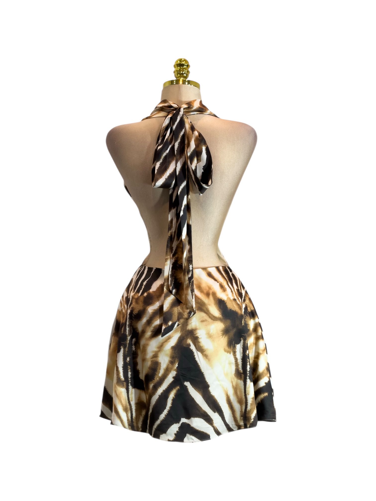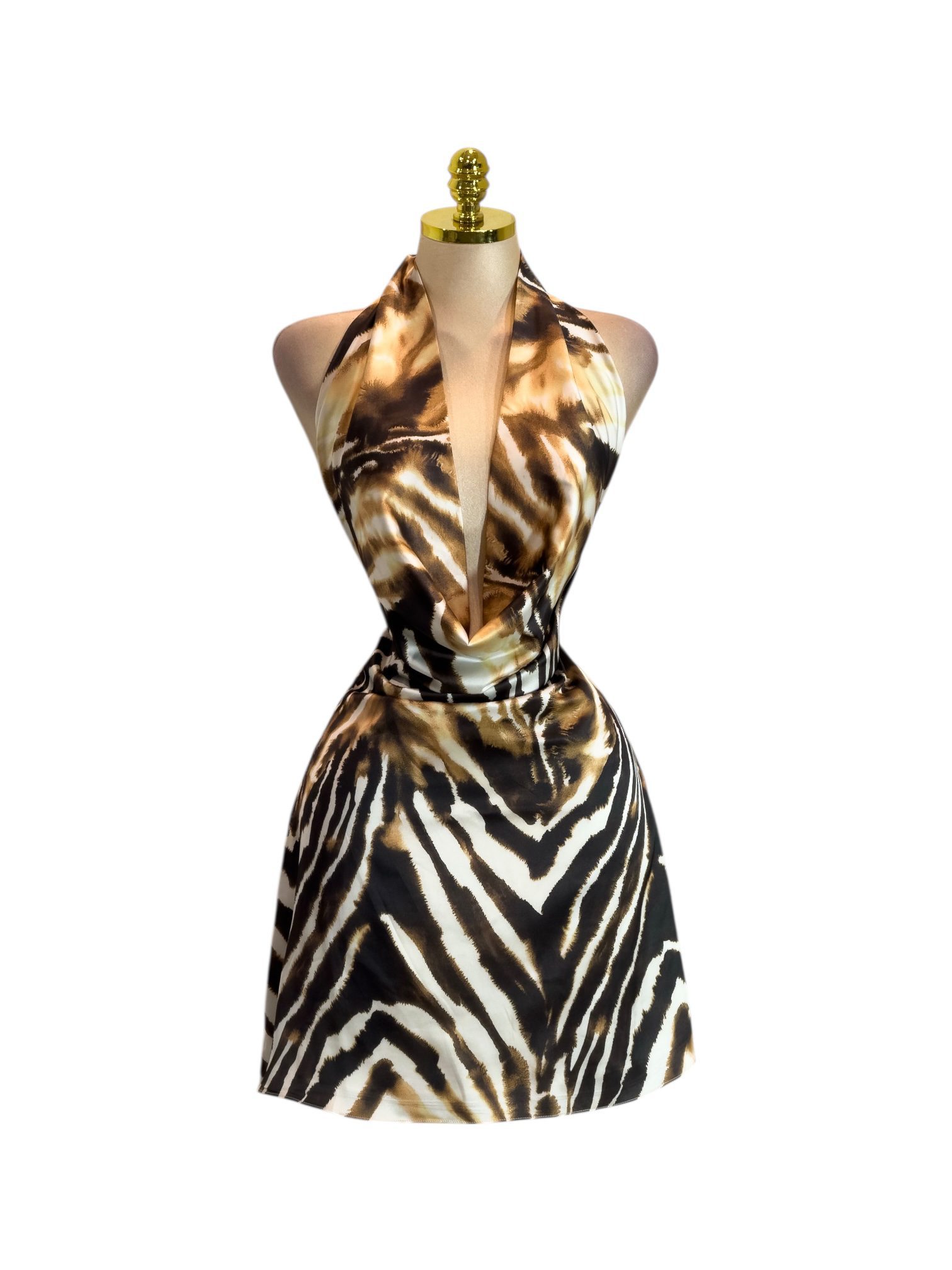 VESTIDO: CORTO ESTAMPADO ANIMAL PRINT CON ESCOTE HALTER Y DRAPEADO