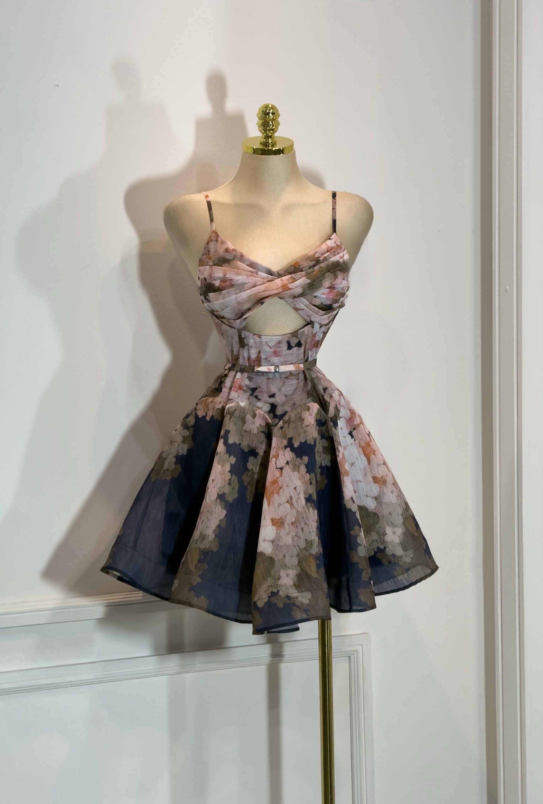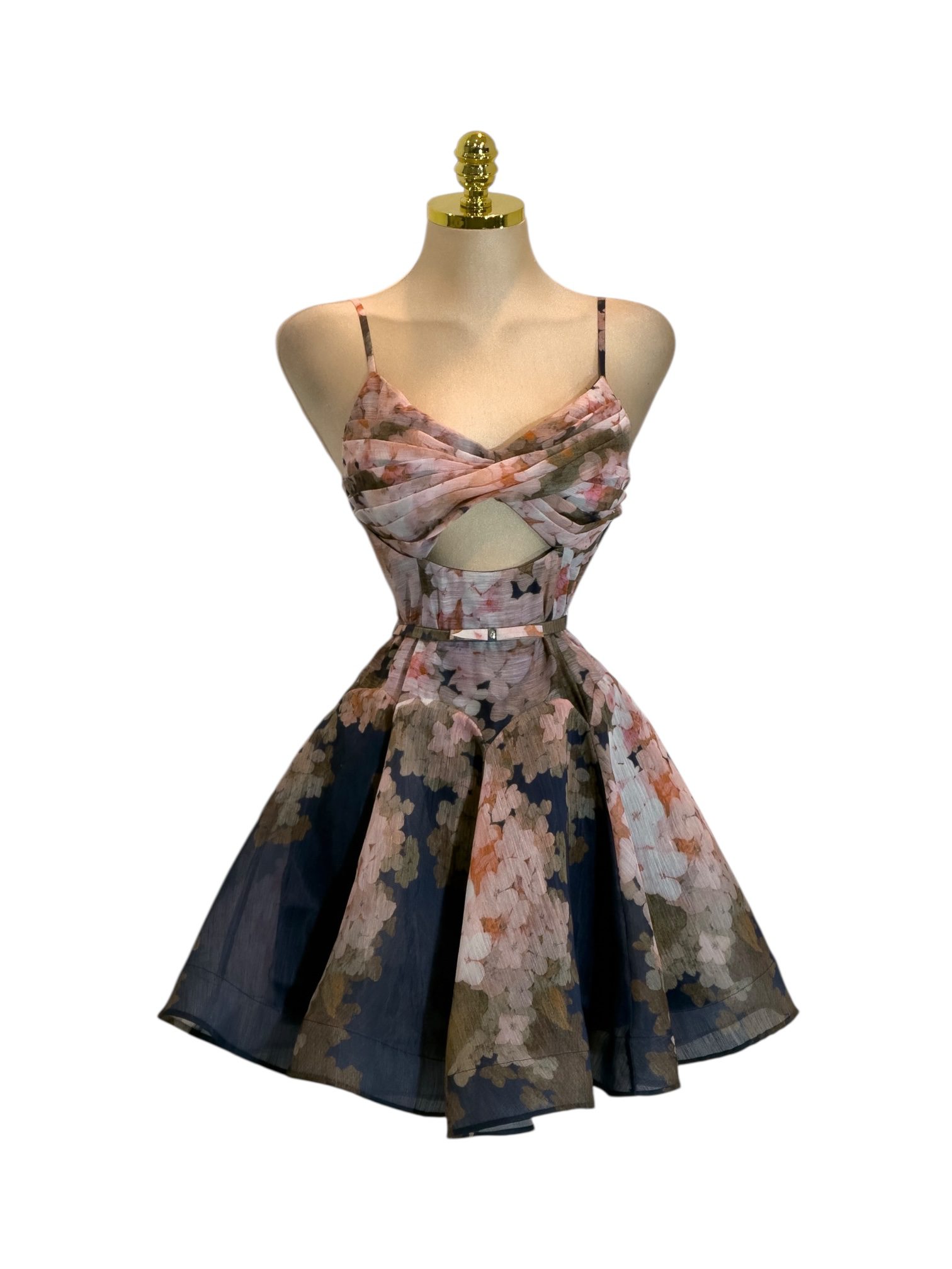 Vestido corto con estampado floral en tonos oscuros. Presenta tirantes delgados, escote drapeado, cut out frontal, cintura definida con cinturón delgado y falda con volumen que aporta movimiento. Ideal para fiestas, eventos y ocasiones especiales.