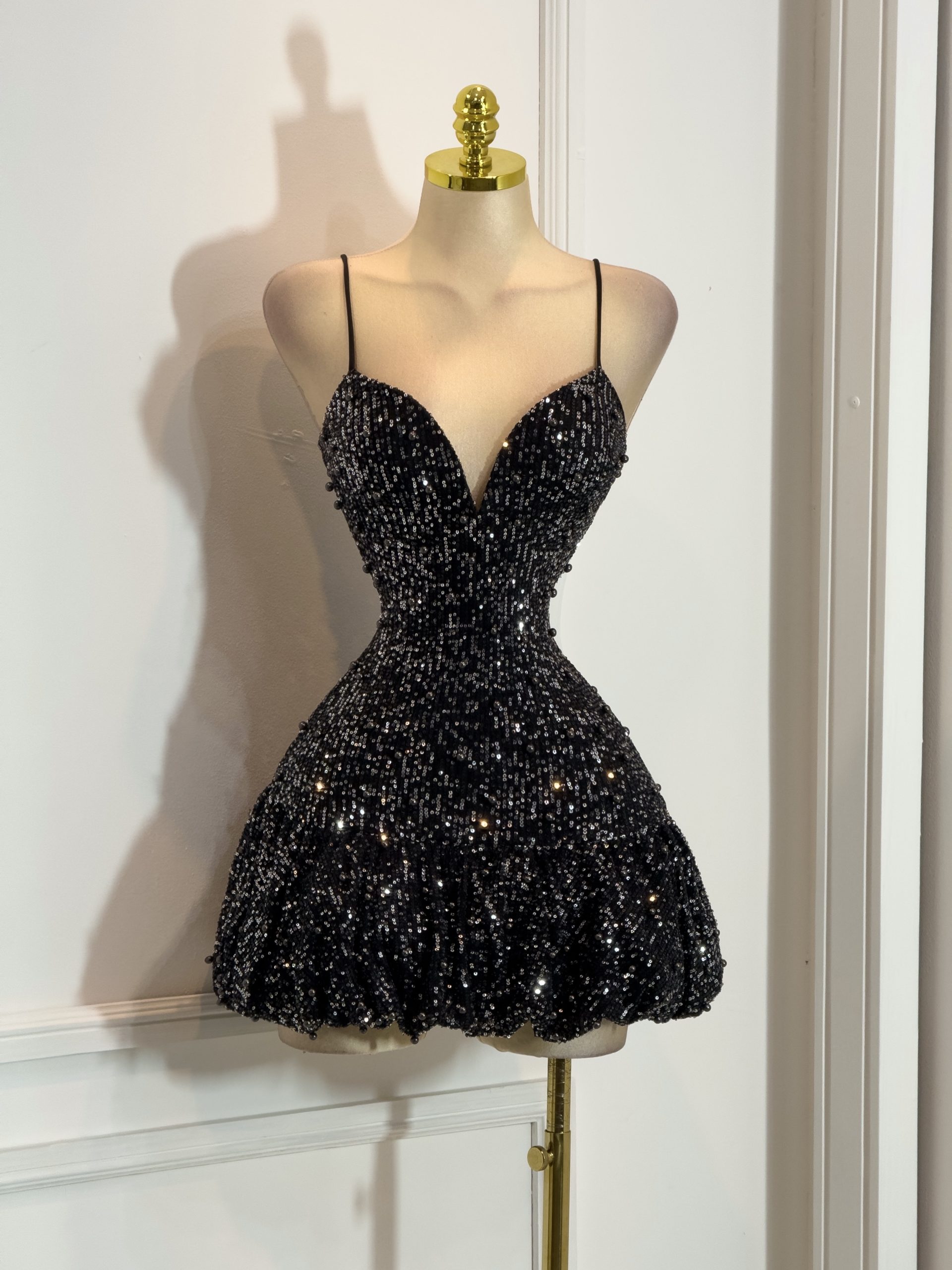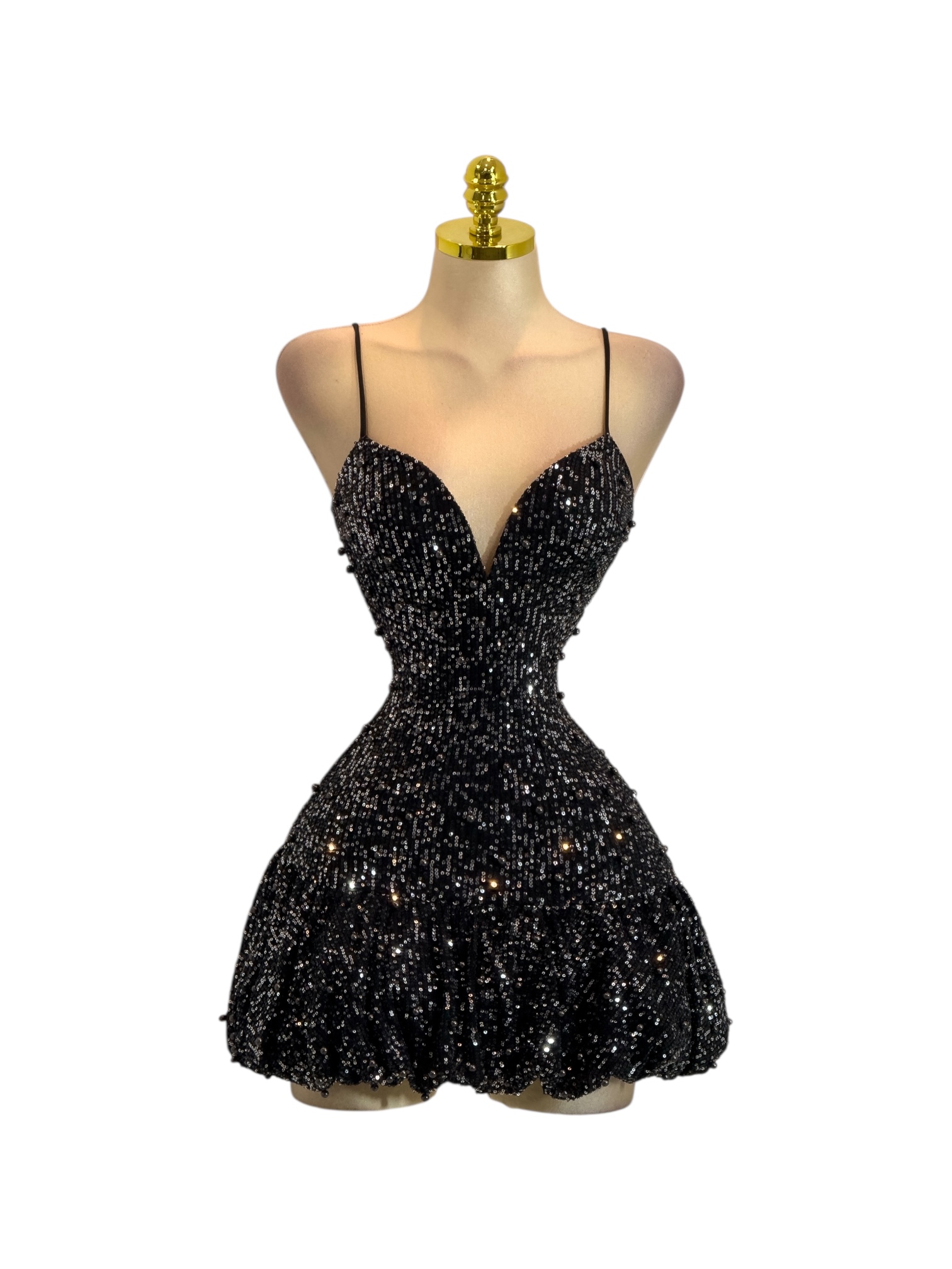 Vestido corto en tono negro totalmente cubierto de lentejuela que aportan un acabado glamuroso y de alto impacto visual. Presenta un escote pronunciado en “V” con tirantes delgados que realzan la parte superior de manera elegante y sensual. El corset entallado moldea la cintura y define la silueta, mientras que la falda corta tipo globo crea volumen y un efecto estructurado muy llamativo. Ideal para fiestas, eventos nocturnos o celebraciones donde busques lucir un look sofisticado, brillante y completamente protagonista.