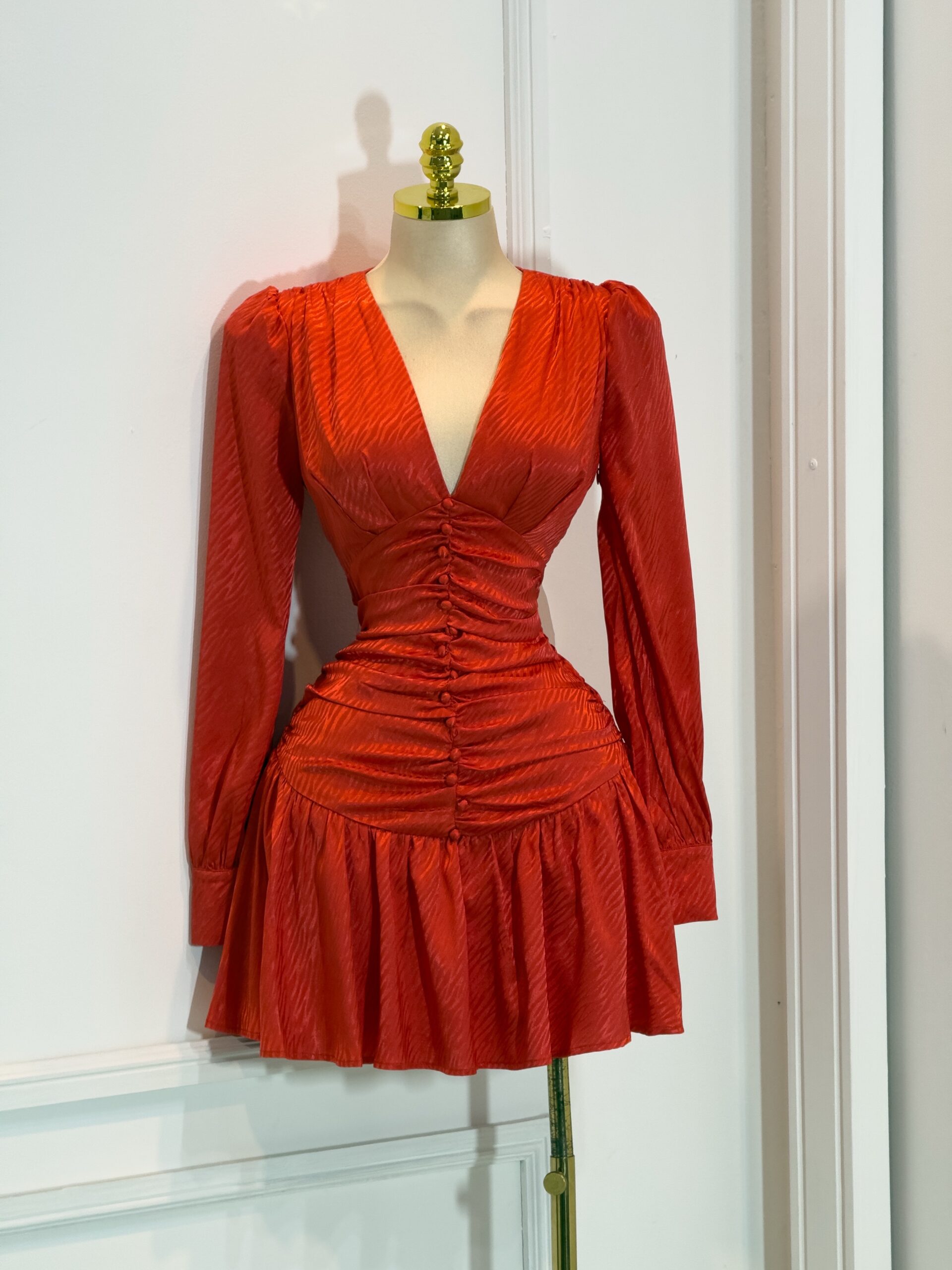 Vestido corto en intenso tono rojo con diseño sensual y sofisticado. Presenta escote profundo en V que realza el busto y estiliza el torso, acompañado de mangas largas que equilibran el diseño con un aire elegante. El cuerpo cuenta con fruncido central continuo y botonadura decorativa al frente, definiendo la cintura y realzando la silueta de forma favorecedora. La falda corta de ligero vuelo aporta movimiento y un acabado femenino. Ideal para fiestas, eventos nocturnos, cenas elegantes y ocasiones especiales donde se busca un look llamativo, moderno y refinado.