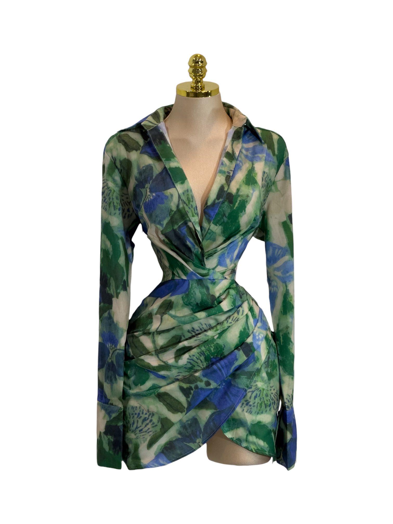 Vestido corto en estampado verde y azul. Diseño con escote en V tipo cruzado, manga larga y drapeado frontal que estiliza la figura. Corte entallado con acabado moderno y femenino. Ideal para salidas nocturnas y eventos especiales.