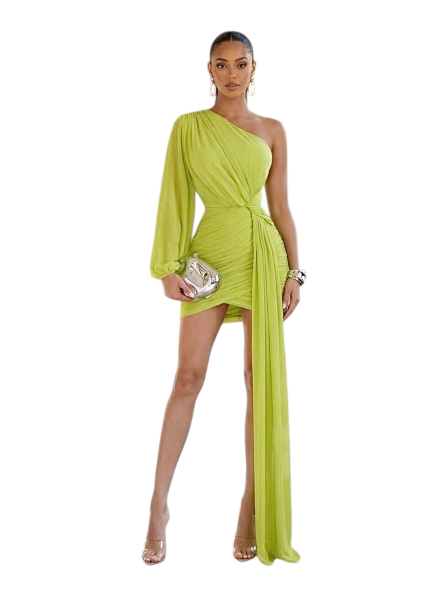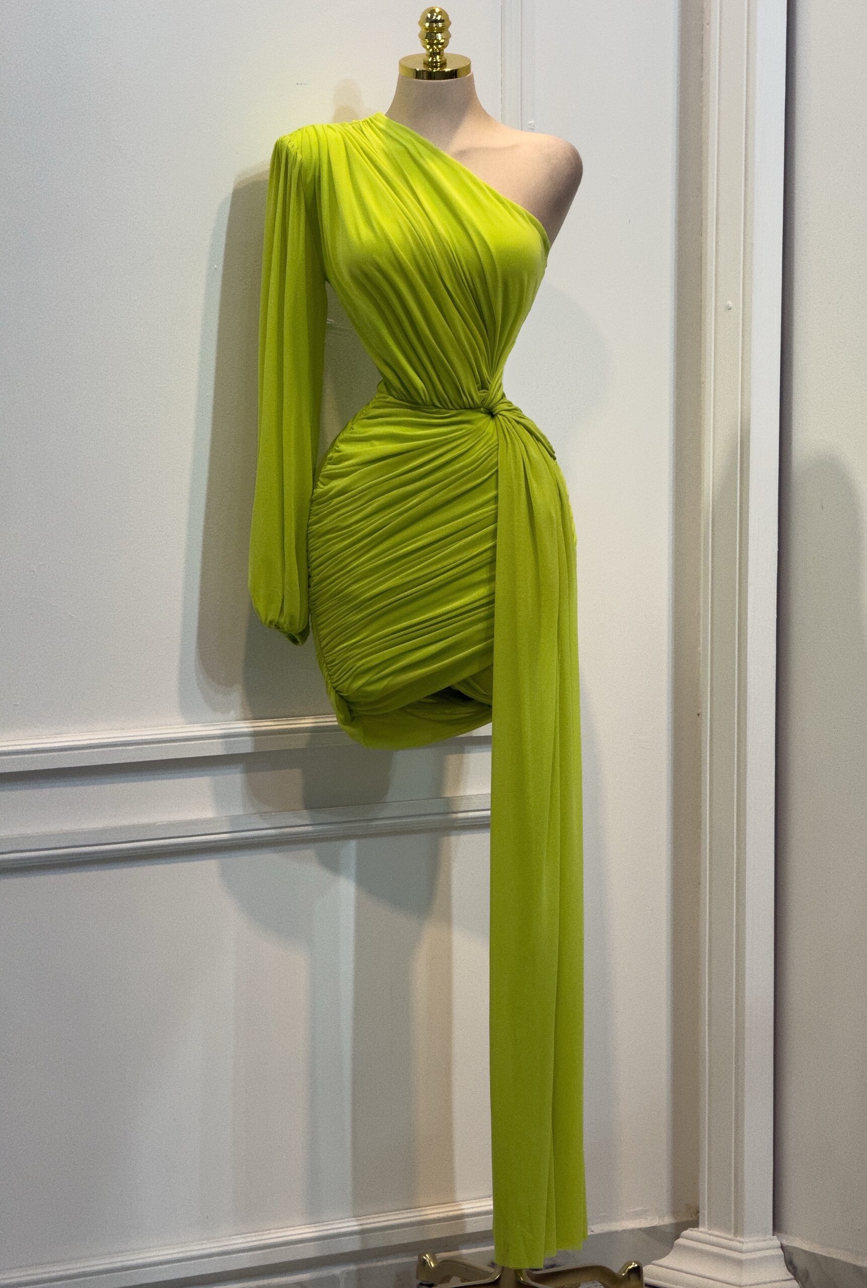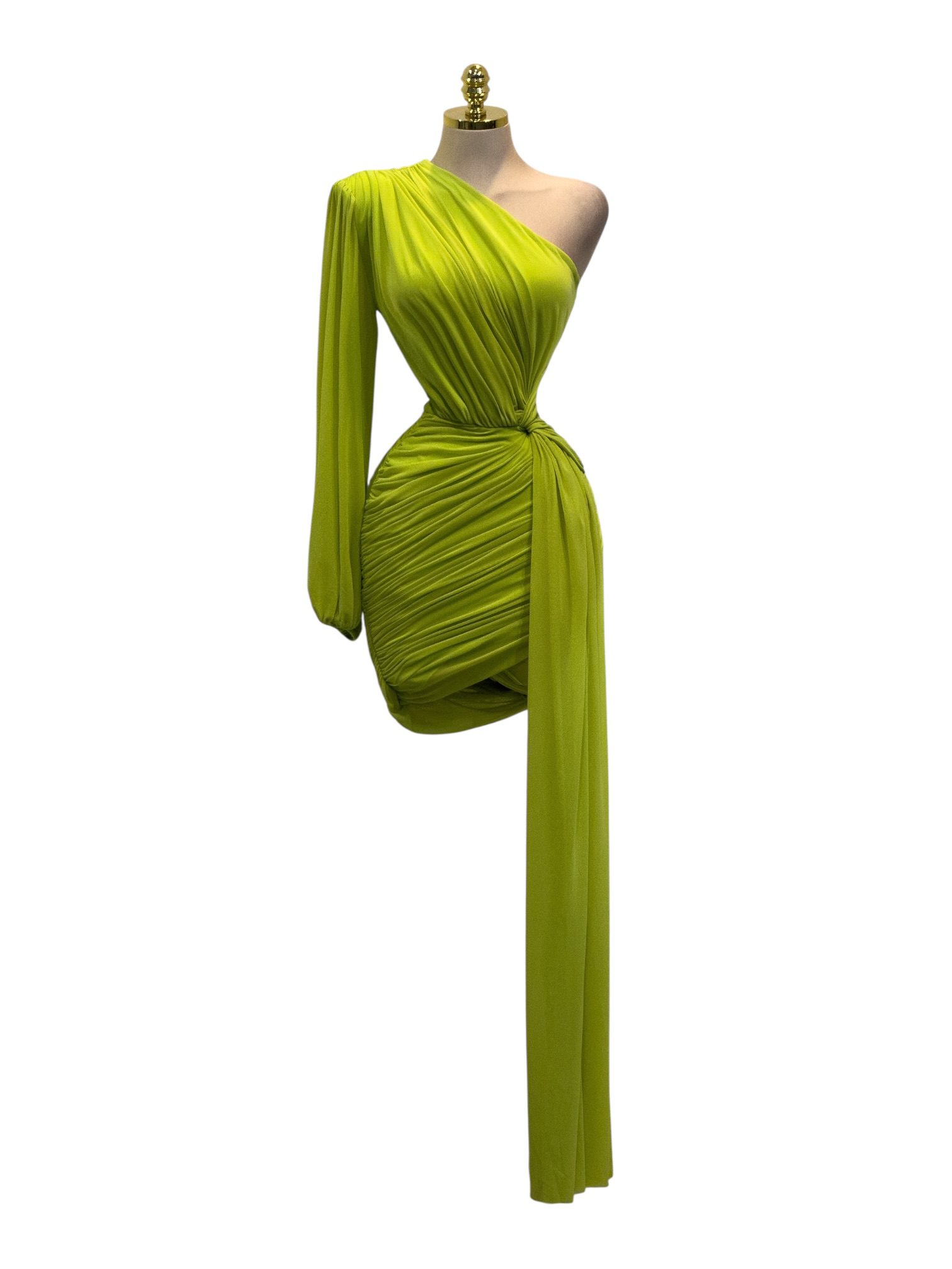 Vestido corto en tono verde lima con escote asimétrico de un solo hombro y manga larga. Diseño drapeado que estiliza la silueta con detalle de caída lateral tipo capa. Ajuste entallado con acabado suave. Ideal para eventos formales o de noche.