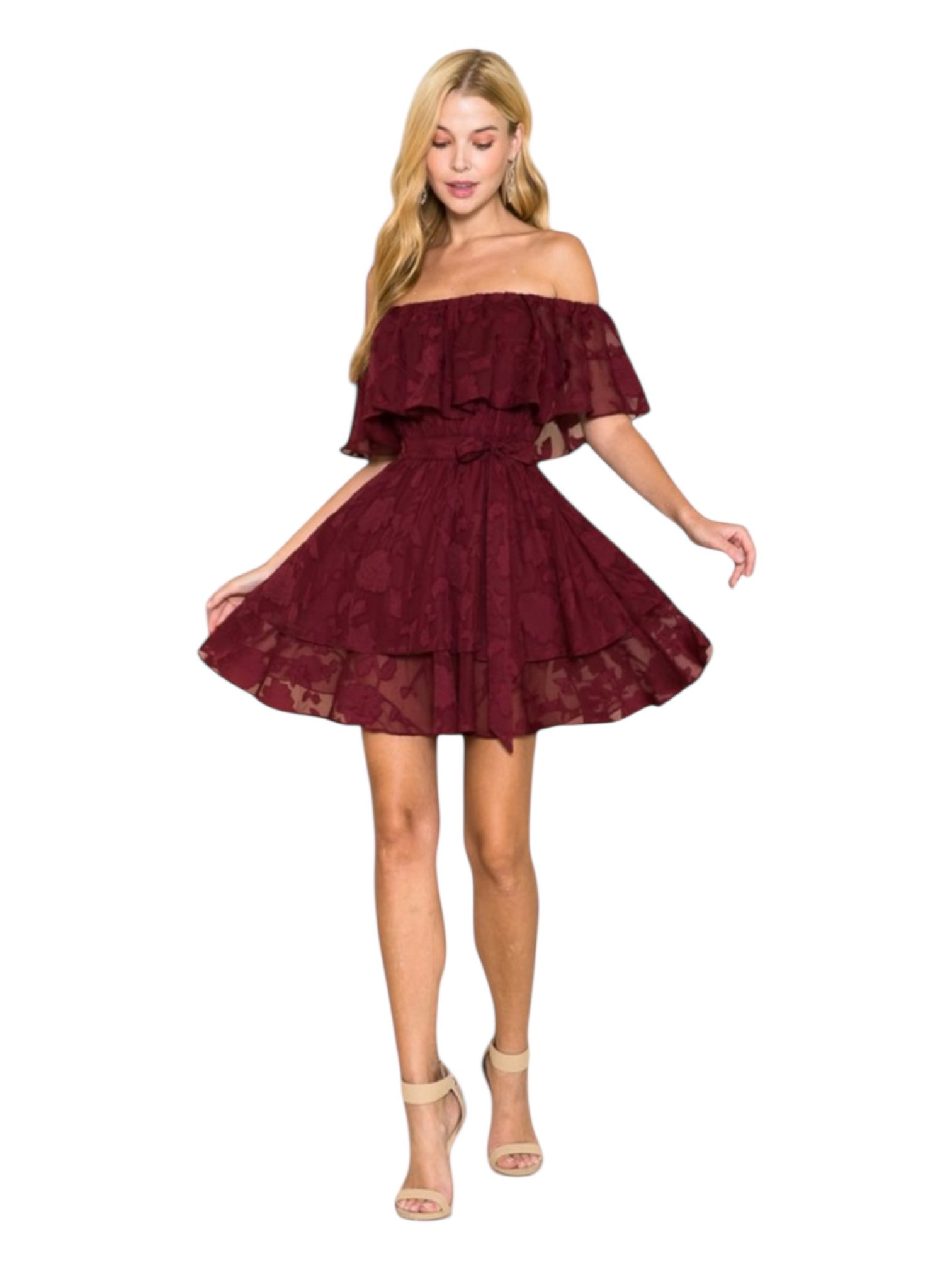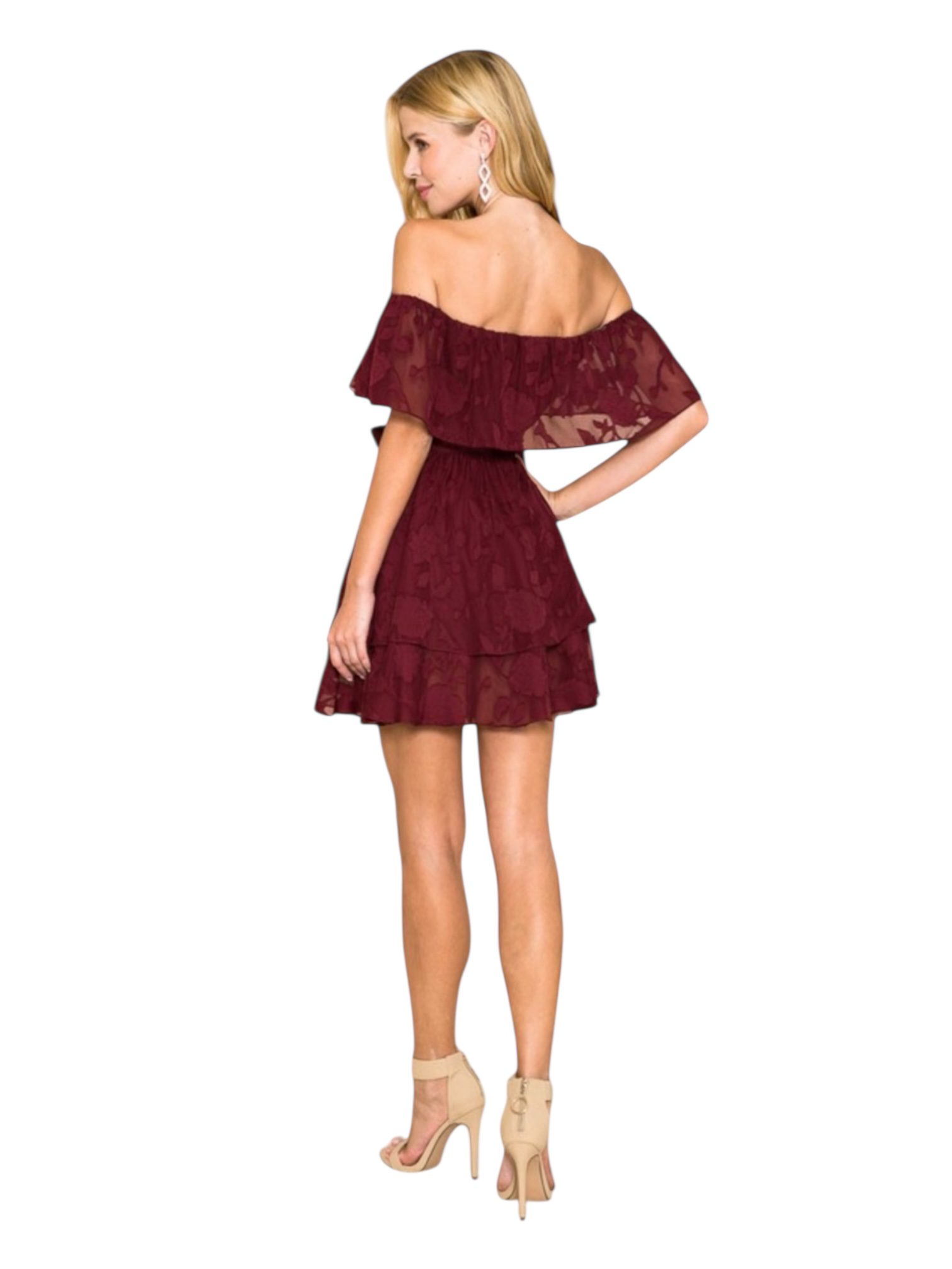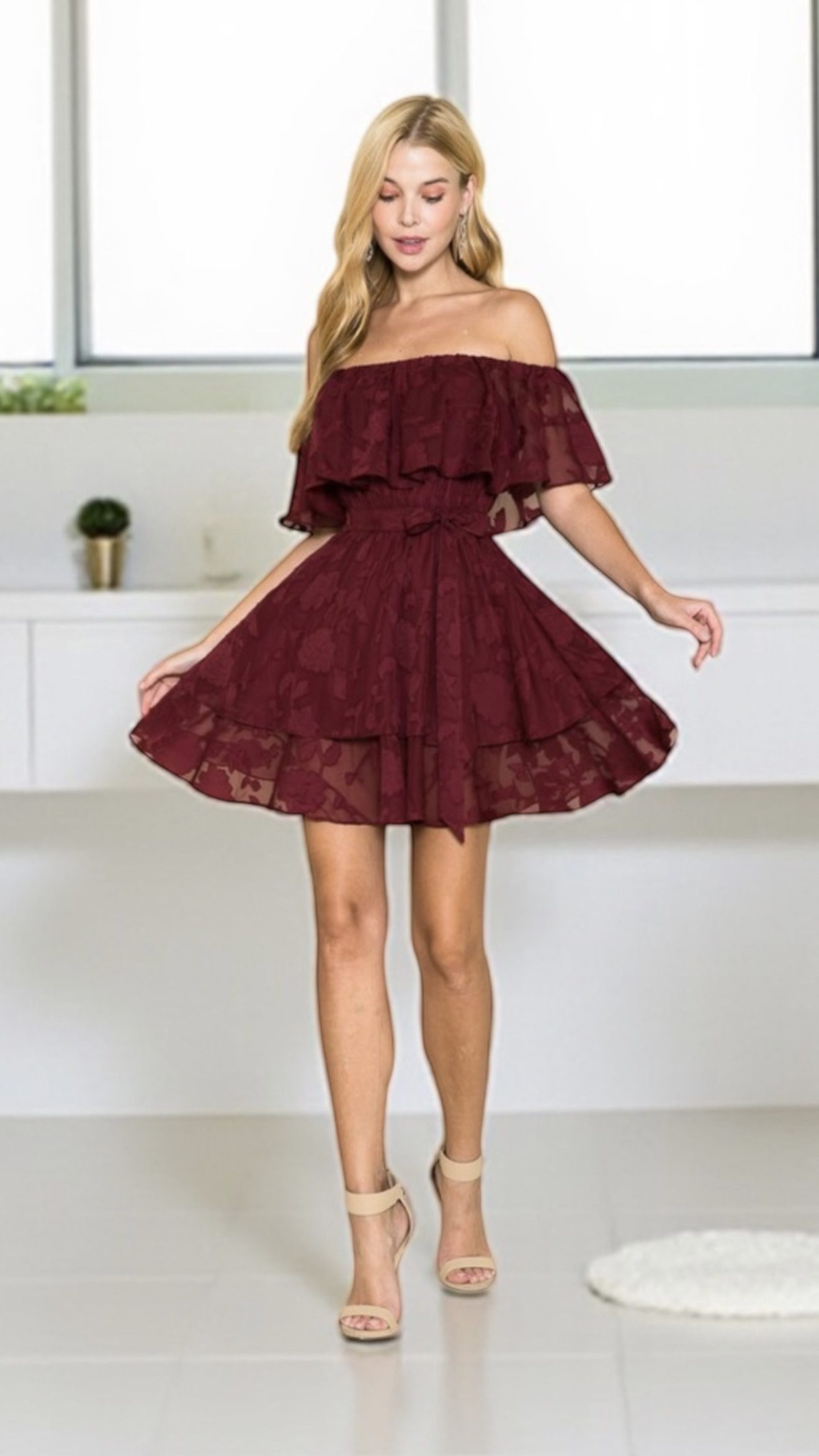 Vestido corto en tono vino con escote tipo off shoulder y doble volante que enmarca el busto con un aire romántico. Su falda con vuelo y encaje aporta movimiento y feminidad. Ideal para fiestas, cenas o eventos donde busques un look coqueto y elegante.