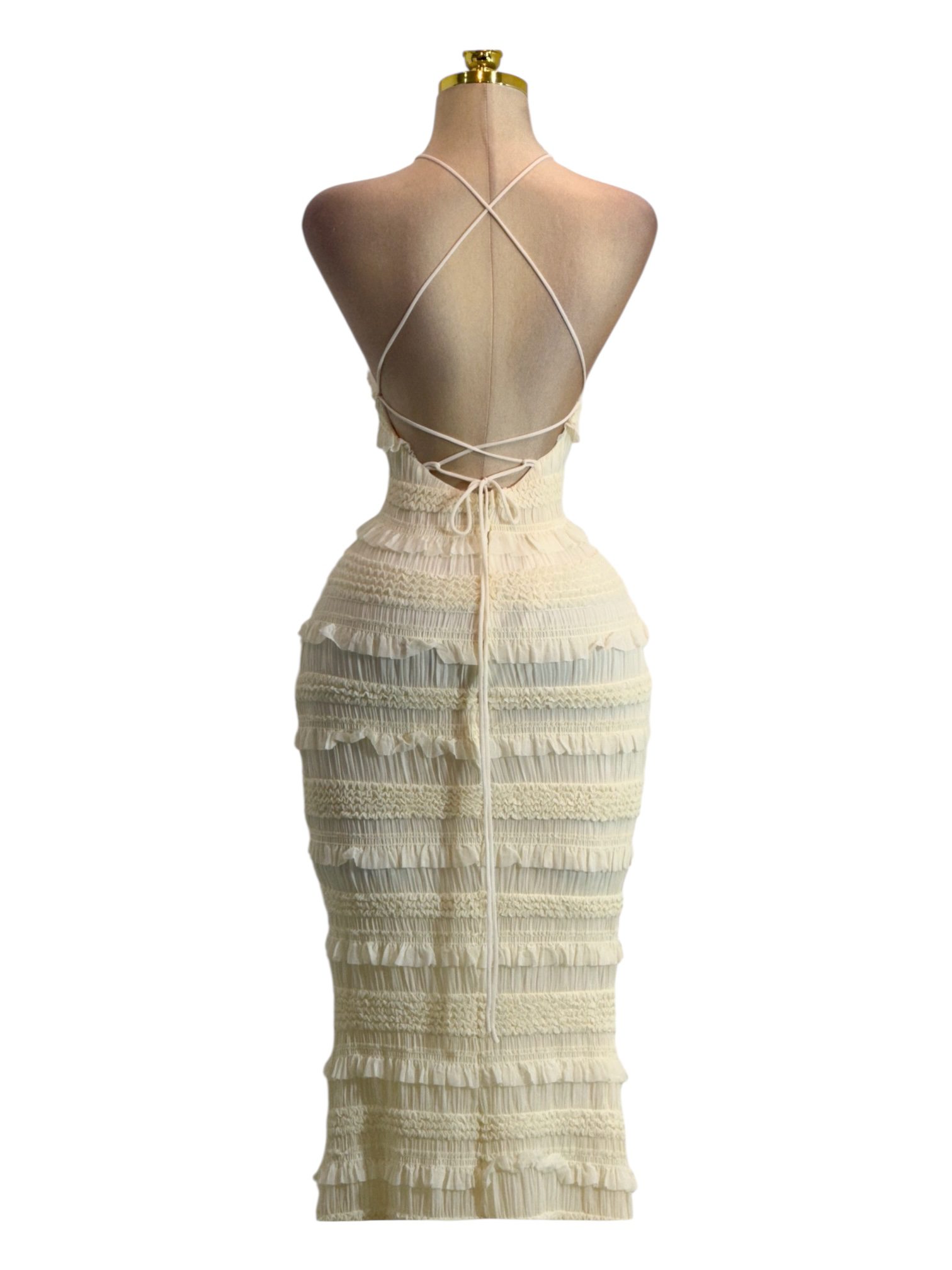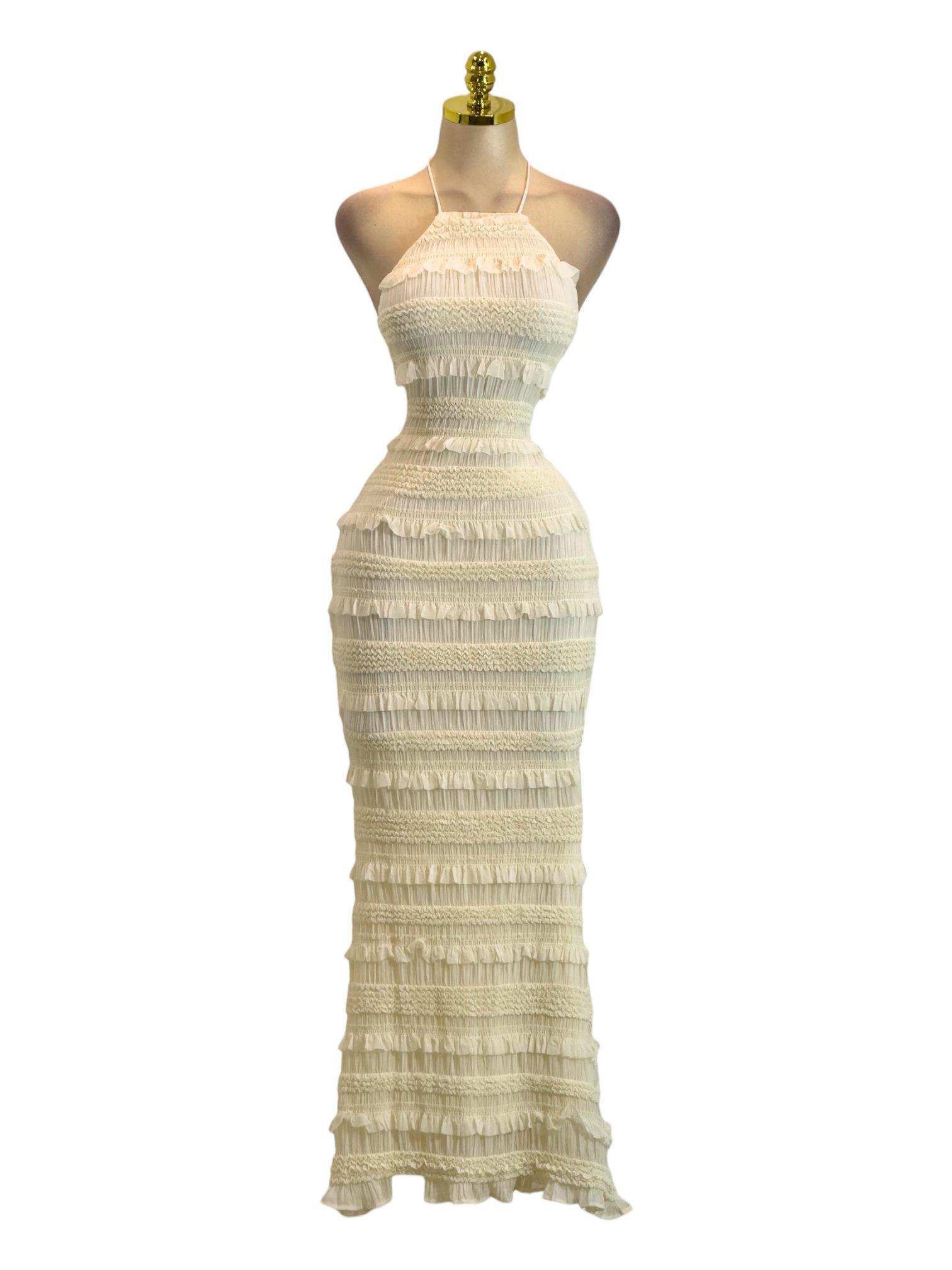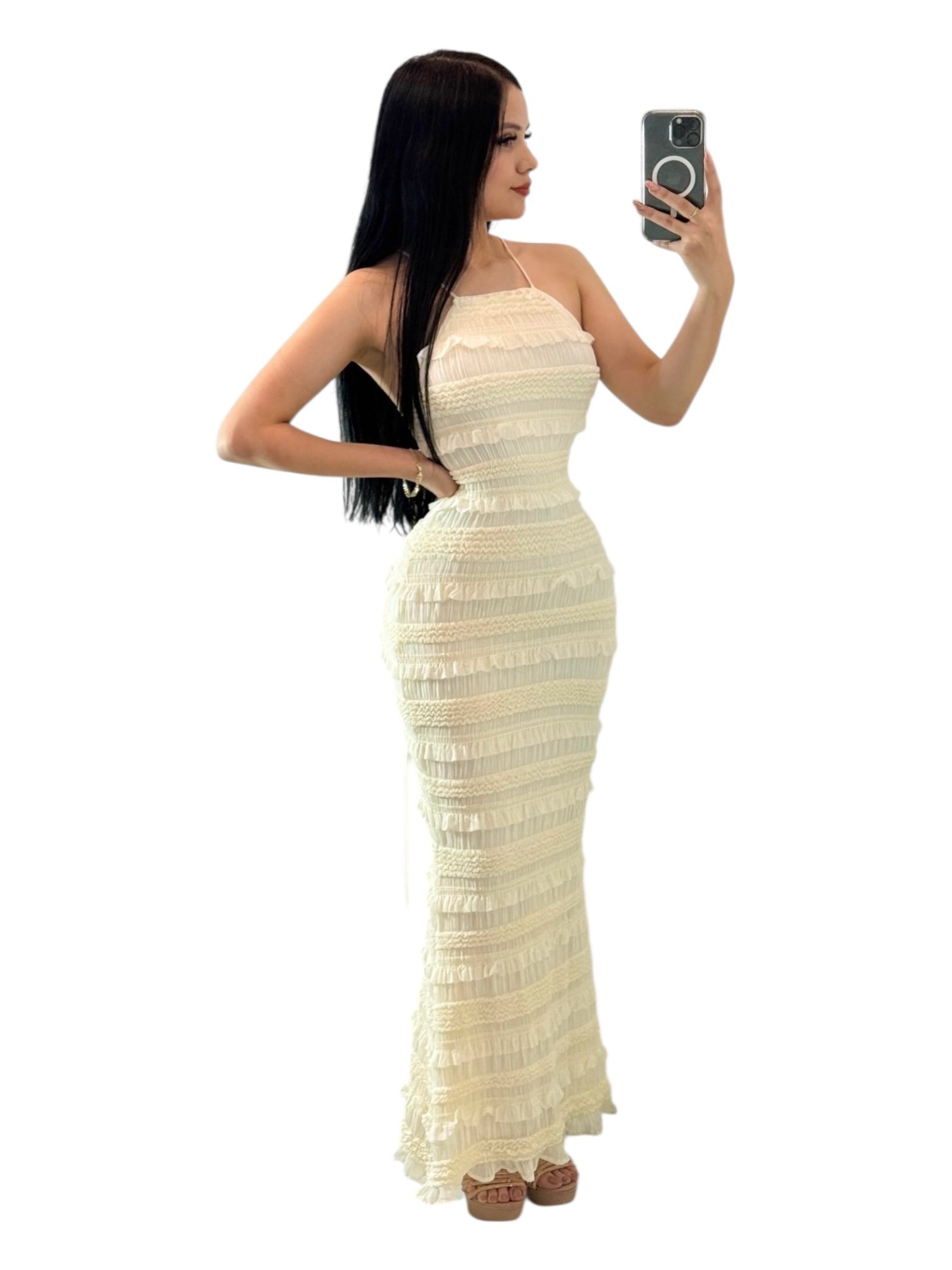 Vestido largo en tono crema con escote halter y tirantes delgados. Diseño ajustado con delicados volantes y fruncidos horizontales que realzan la silueta. Femenino y elegante, ideal para eventos especiales y celebraciones.