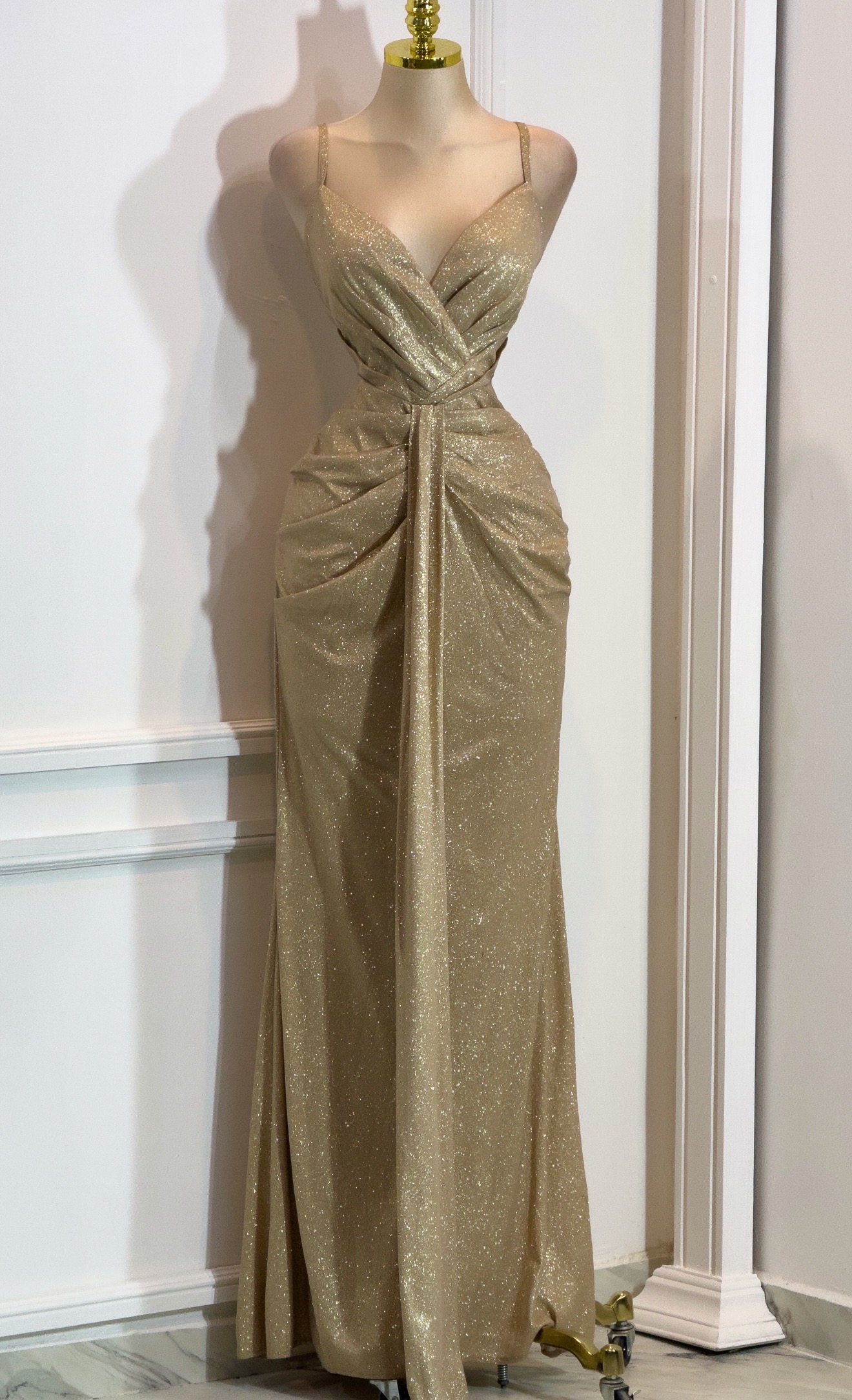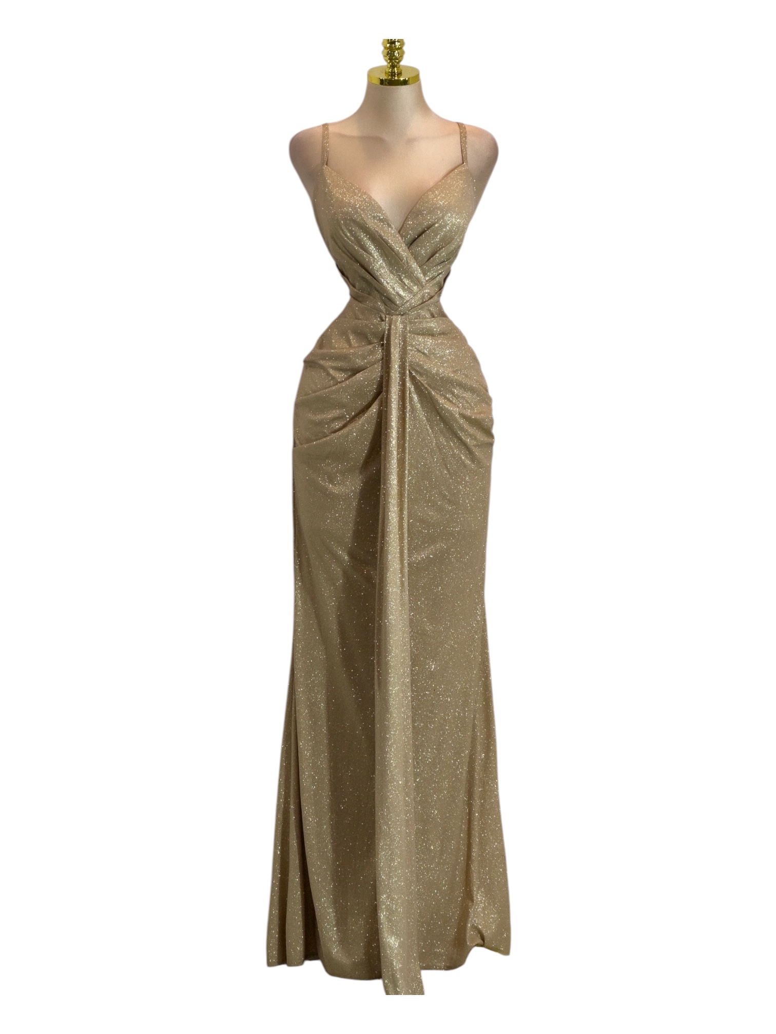 Vestido largo en tono dorado con destellos brillantes que aportan un acabado luminoso y sofisticado. Presenta escote cruzado en “V” que realza el busto con elegancia, acompañado de tirantes delgados que estilizan los hombros. El drapeado central define la cintura y crea un efecto favorecedor que acentúa la silueta. La falda larga de caída fluida añade movimiento y un toque refinado. Ideal para galas, eventos de noche o celebraciones especiales donde busques un look glamuroso, distinguido y lleno de presencia.