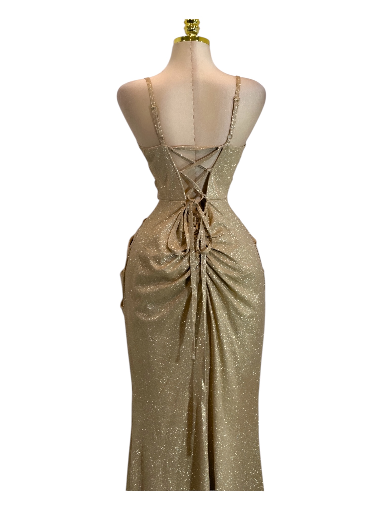 VESTIDO: LARGO DORADO CON BRILLO, ESCOTE CRUZADO Y DRAPEADO CENTRAL