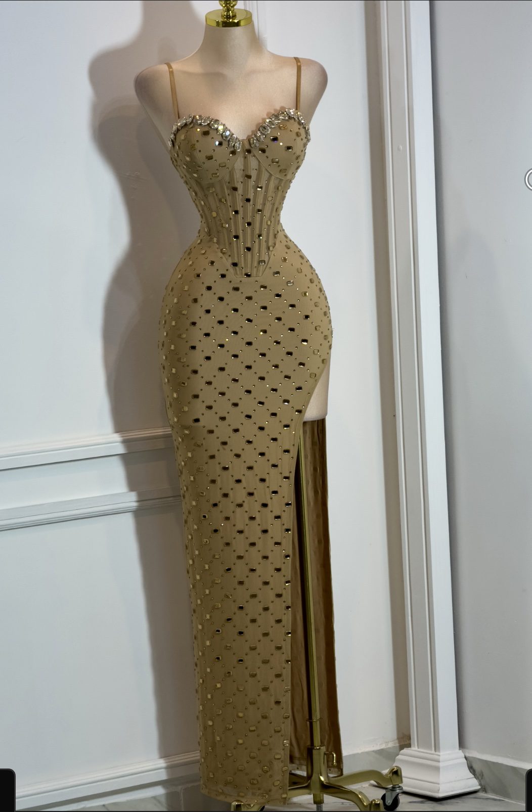 Vestido largo en tono dorado confeccionado en tejido elástico adornado con piedras brillantes que reflejan la luz con elegancia. Presenta escote en forma de corazón con varillas tipo corset que realzan el busto y definen la silueta. Los tirantes finos añaden un toque delicado, mientras que la abertura lateral en la falda aporta sensualidad y movimiento. Ideal para galas, cenas o eventos de noche donde busques un look glamuroso, sofisticado y lleno de distinción.