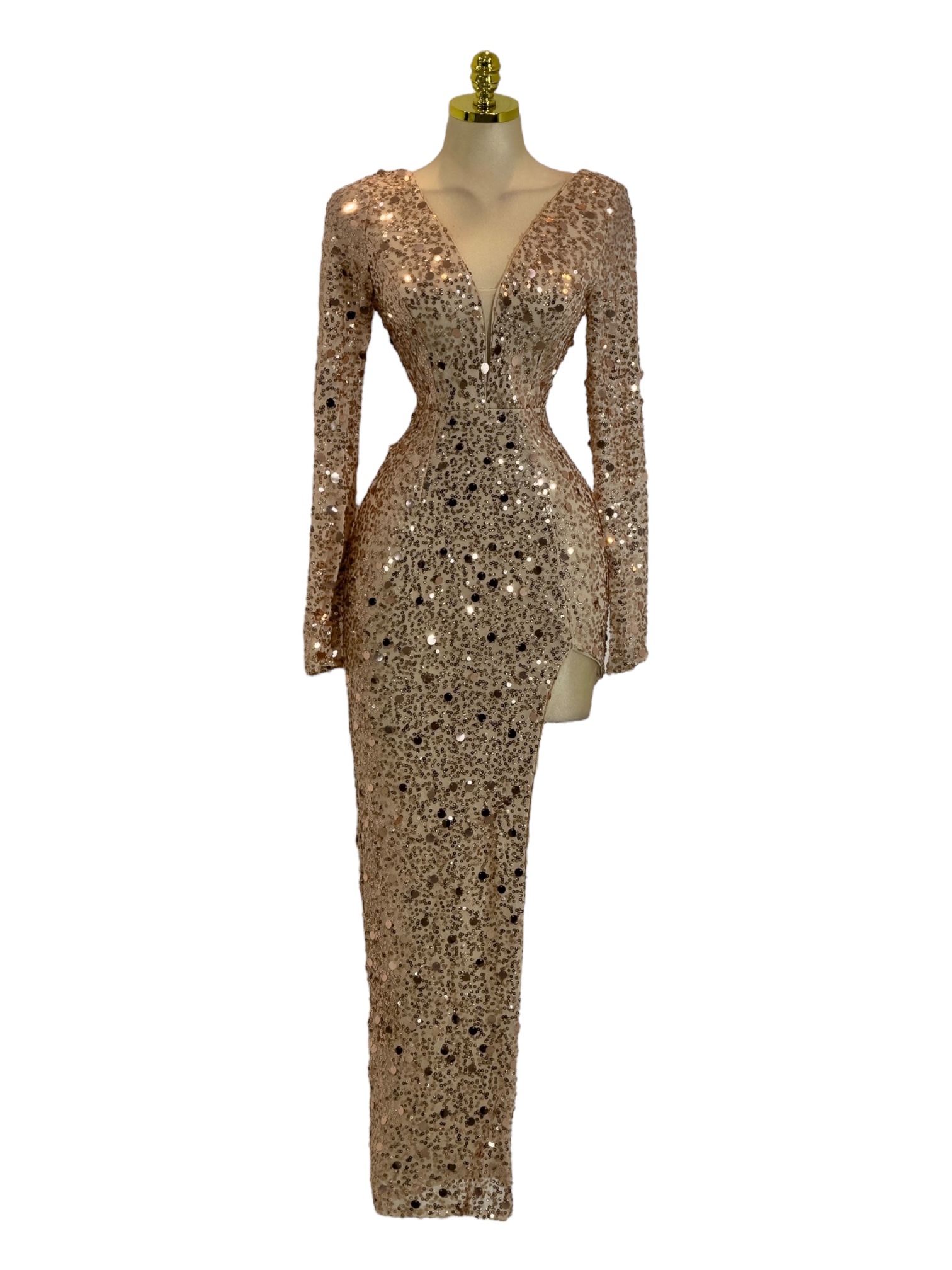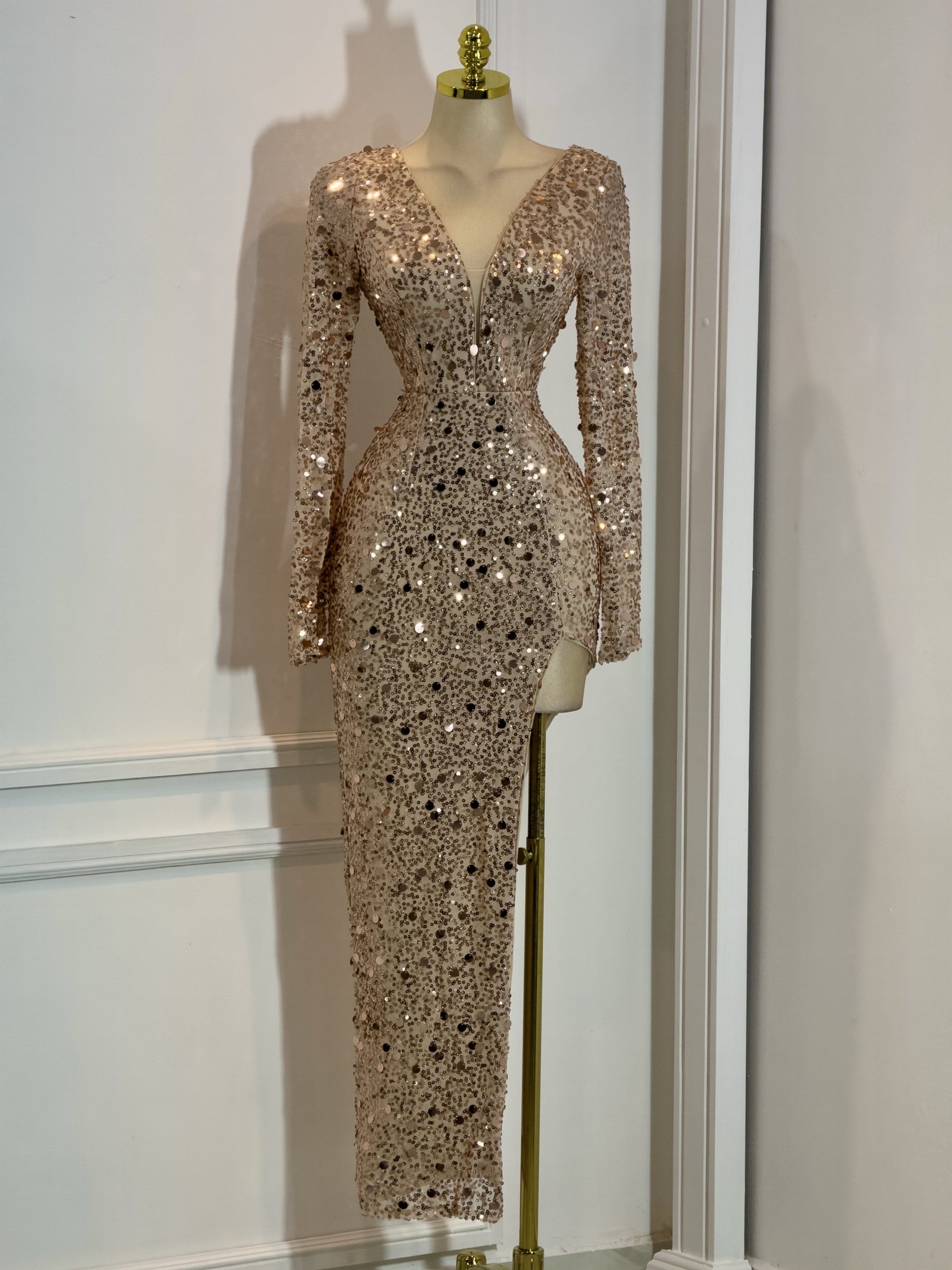 Vestido largo en tono dorado confeccionado en tejido elástico cubierto de lentejuelas que reflejan la luz con elegancia y sofisticación. Presenta escote profundo en “V” que realza el busto con distinción, acompañado de mangas largas que aportan equilibrio al diseño. El corte ajustado abraza la silueta y estiliza la figura, creando un efecto glamuroso y refinado. Ideal para galas, eventos formales o celebraciones nocturnas donde busques un look brillante, elegante y lleno de presencia.