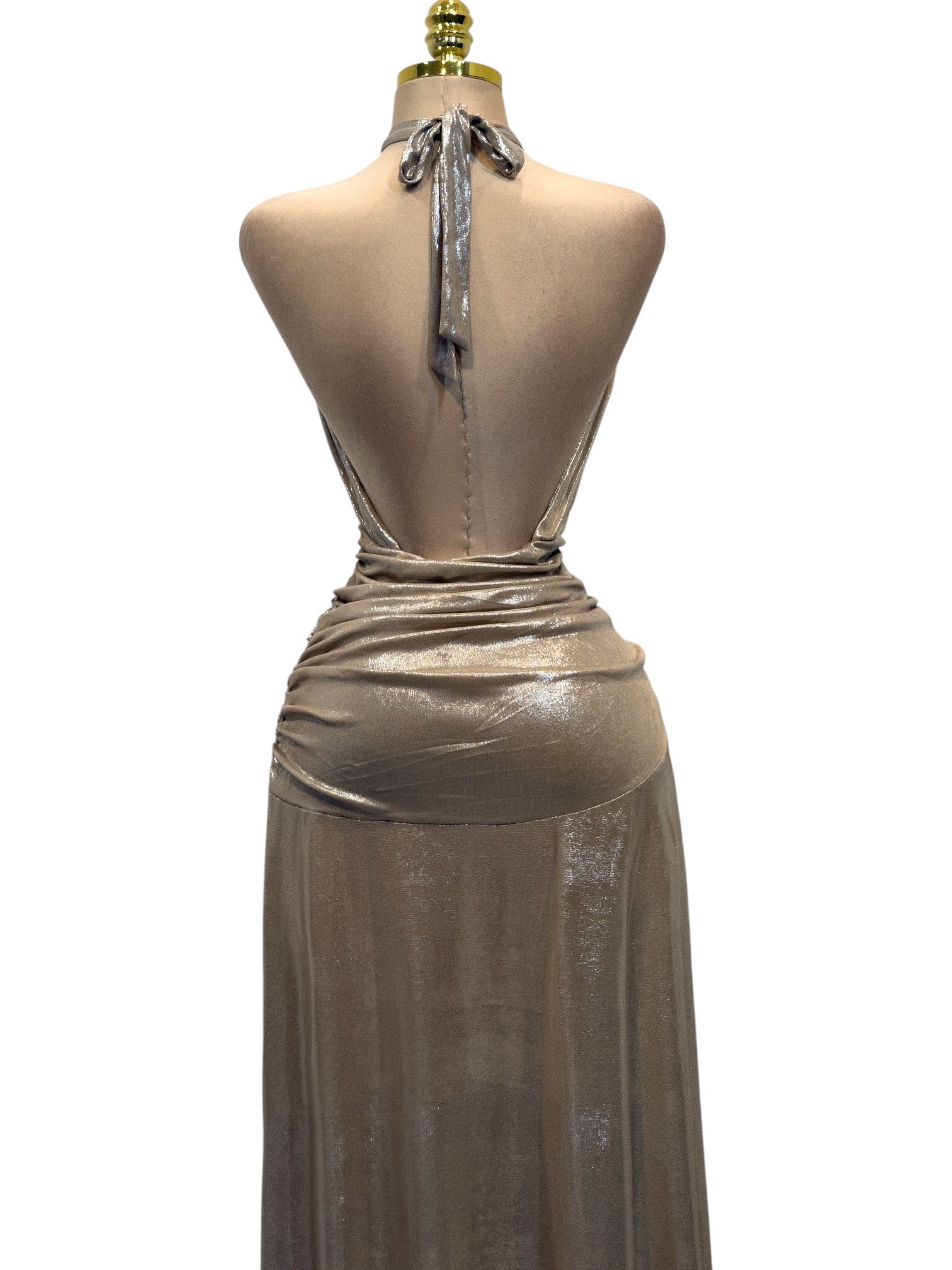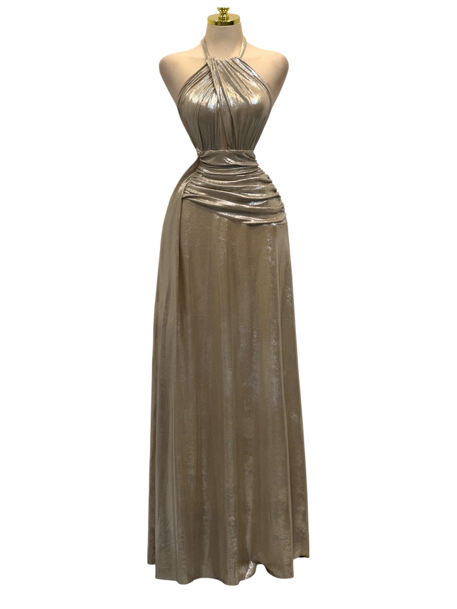 Vestido largo en tono dorado con acabado metalizado. Diseño halter con escote fruncido y cintura drapeada que estiliza la silueta, acompañado de falda fluida con caída elegante. Sofisticado y llamativo, ideal para eventos de noche o celebraciones especiales.