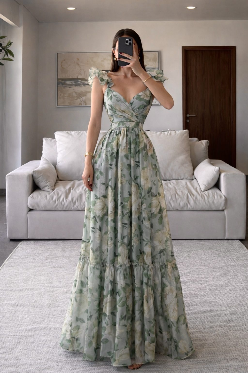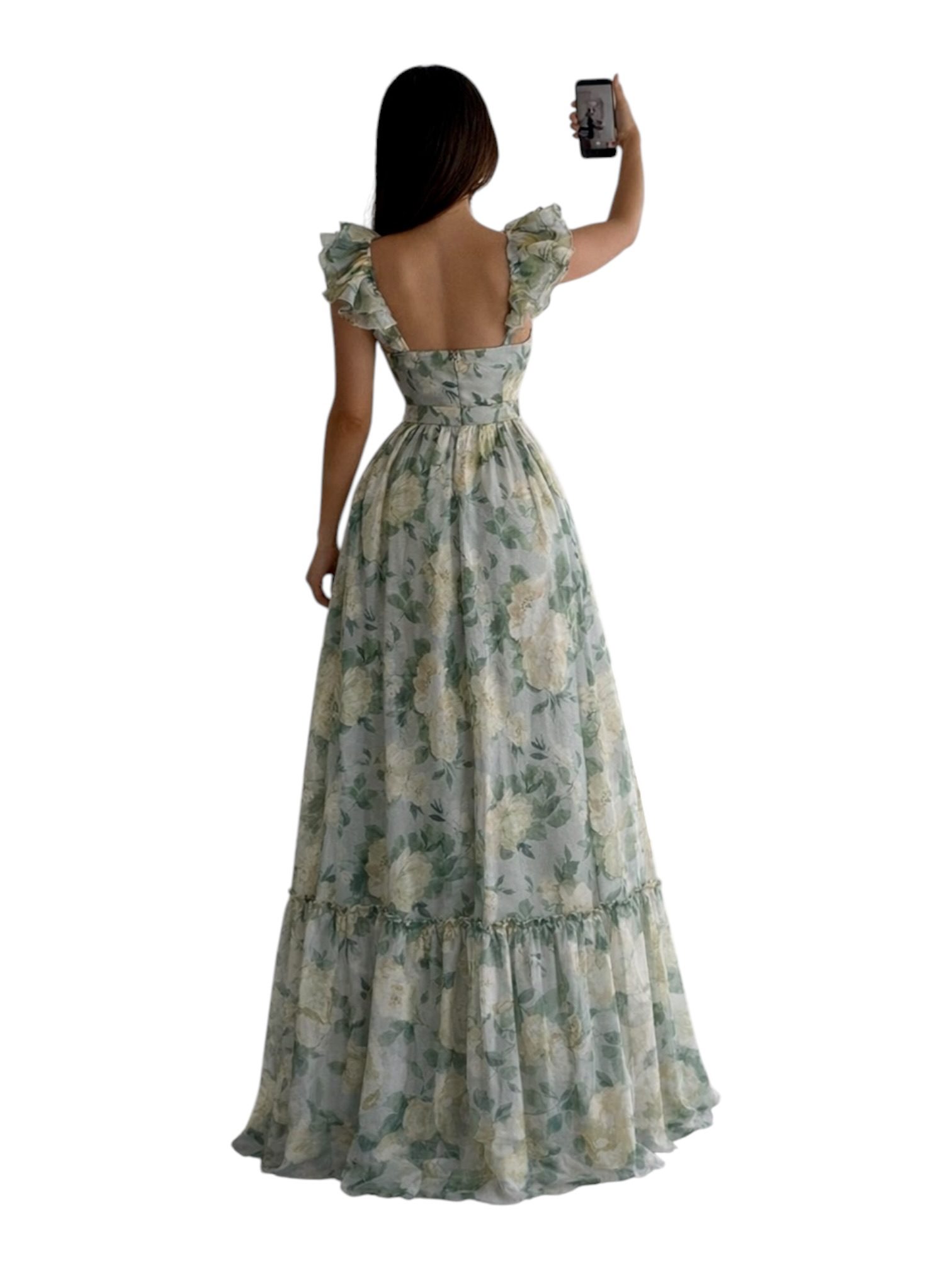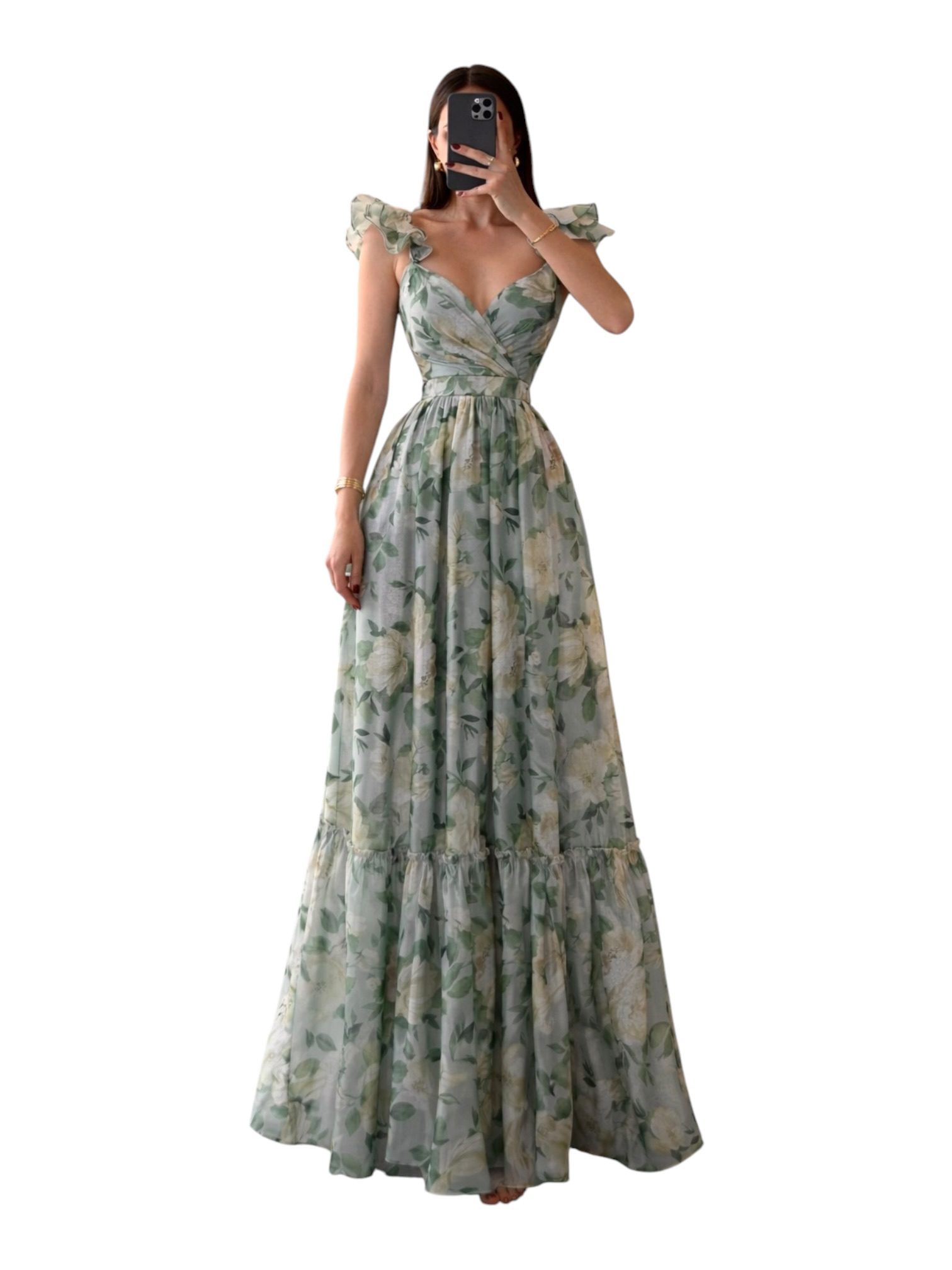 Vestido largo con estampado floral en tonos suaves, escote corazón cruzado y tirantes con olanes. Cintura marcada y falda amplia con caída fluida y ligero vuelo. Ideal para eventos de día, bodas o ocasiones especiales.