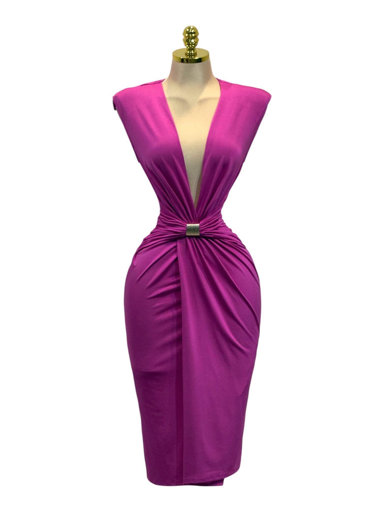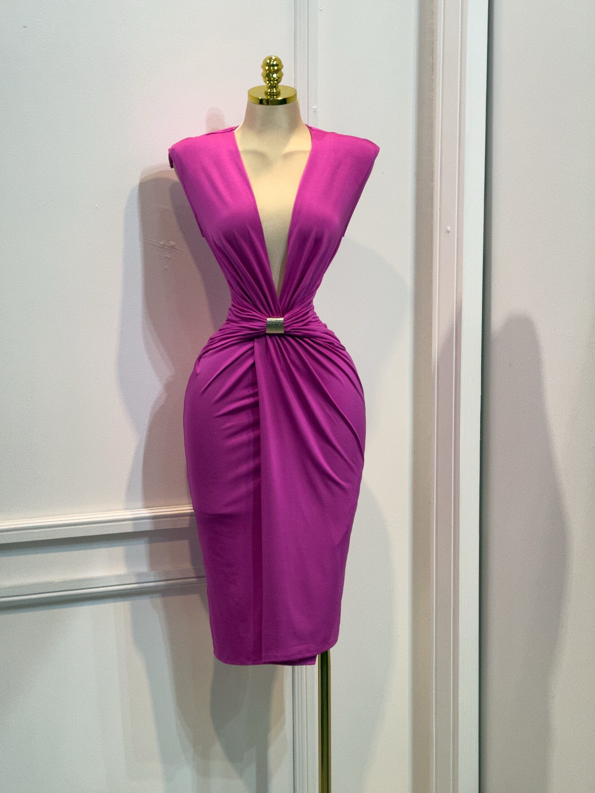 Vestido midi en tono fucsia con escote en V profundo y hombros estructurados. Diseño ajustado con drapeado en cintura y detalle metálico al frente que estiliza la silueta. Ideal para eventos, cenas o celebraciones especiales.