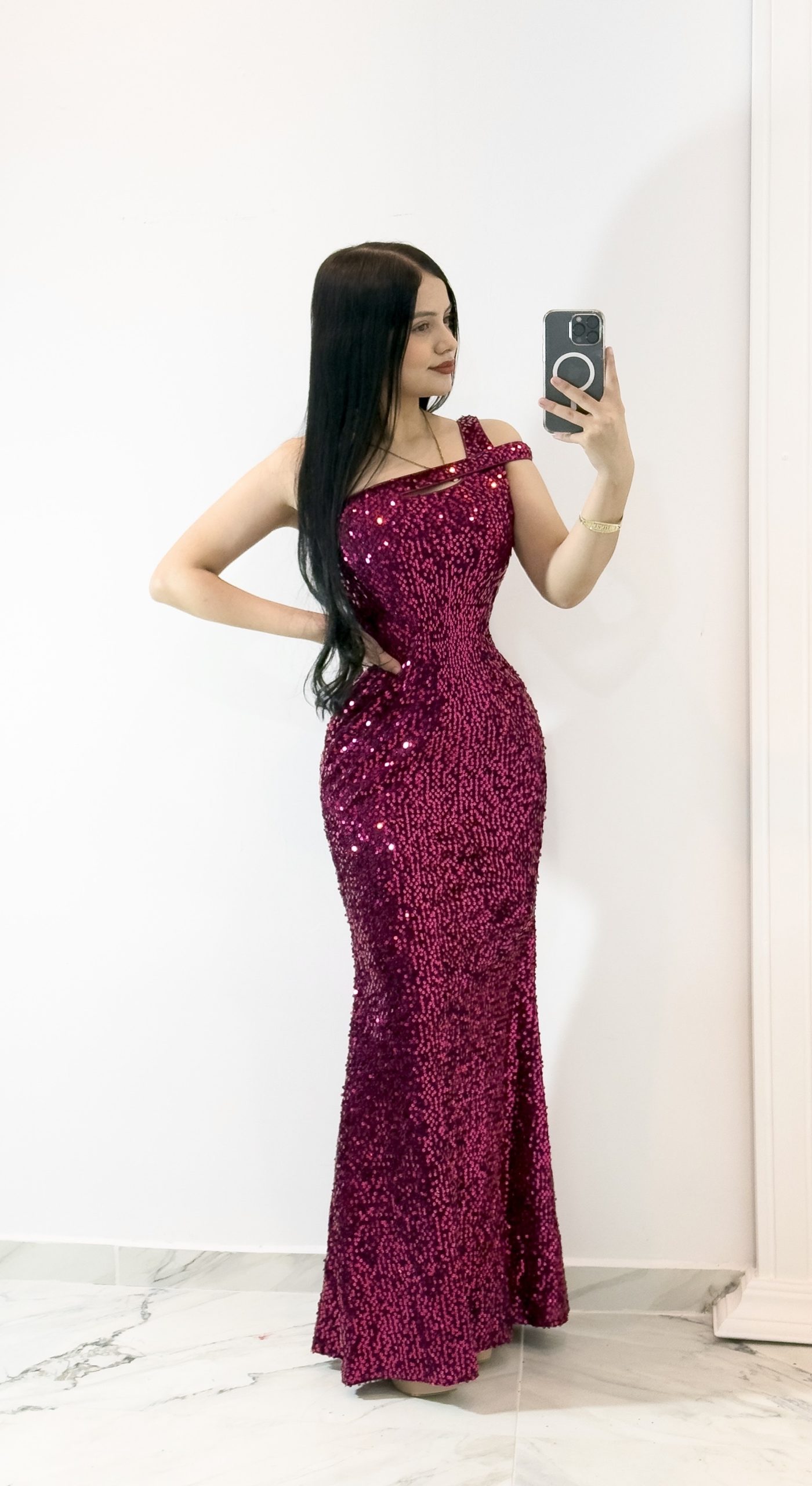 Vestido largo en tono fucsia cubierto de lentejuelas que reflejan la luz con un brillo deslumbrante. Presenta escote asimétrico con un tirante delicado que añade un toque moderno y elegante, mientras que el corte entallado realza la silueta con sofisticación. La falda de línea sirena aporta movimiento y equilibrio al diseño. Ideal para galas, eventos de noche o celebraciones donde busques un look glamuroso, impactante y lleno de distinción.