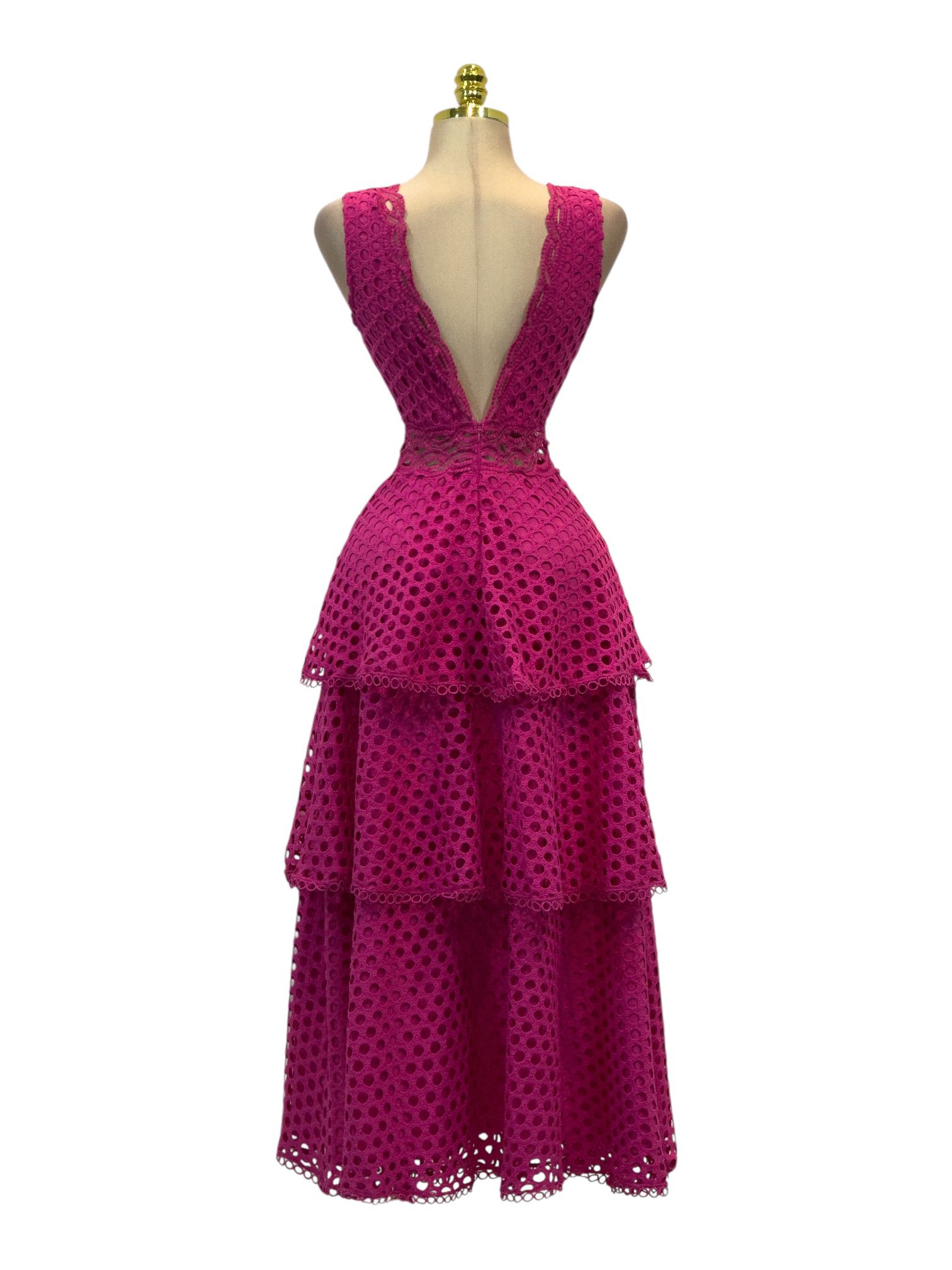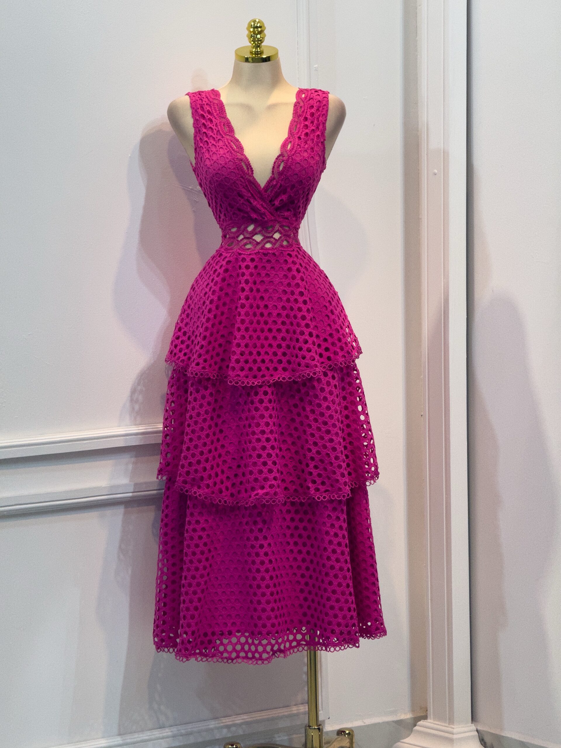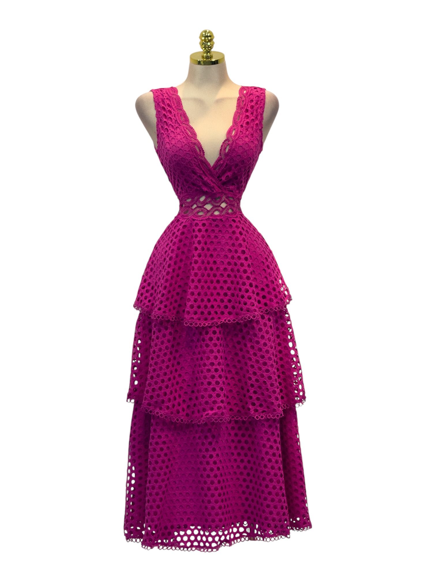 Vestido midi en tono fucsia con diseño de encaje calado. Escote en V cruzado y cintura con detalle abierto que estiliza la silueta. Falda con capas en caída ligera que aporta movimiento. Femenino y llamativo, ideal para eventos especiales.