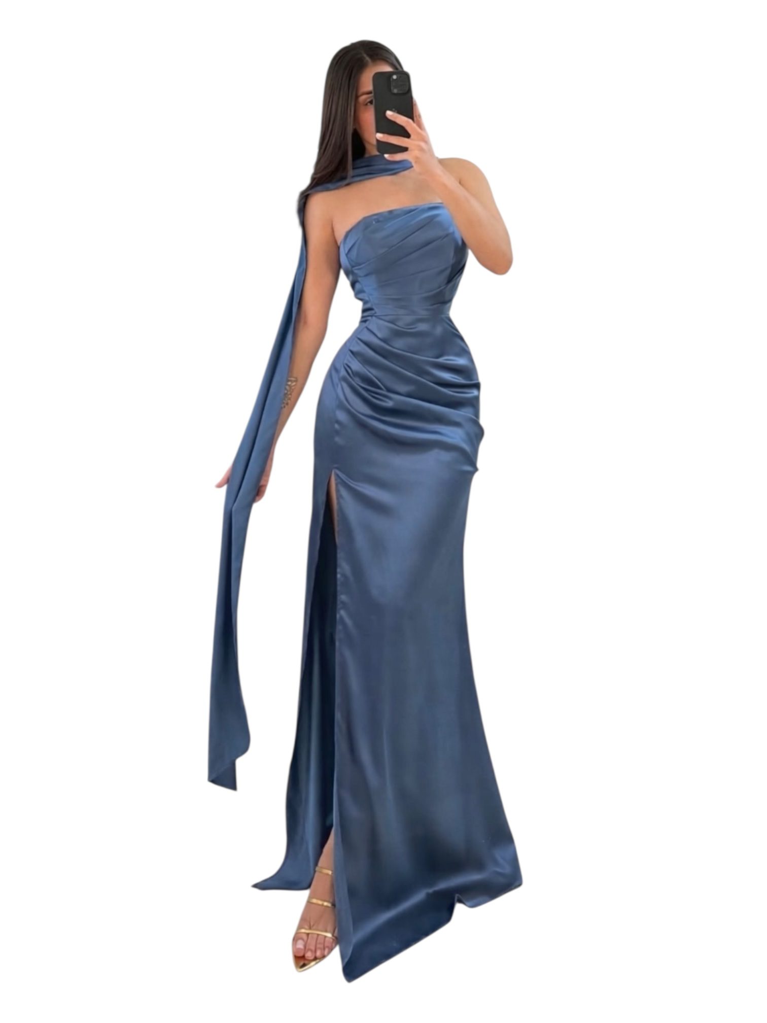 Vestido largo en tono azul con diseño elegante y sofisticado. Presenta escote strapless recto con drapeado suave en el busto que define la cintura y estiliza la silueta. Incorpora detalle tipo capa o banda larga integrada al escote que cae sobre el hombro, aportando un efecto distintivo y refinado. La falda larga de caída fluida incluye abertura frontal que añade movimiento y un toque sensual. Ideal para eventos formales, galas, bodas y ocasiones especiales de noche.