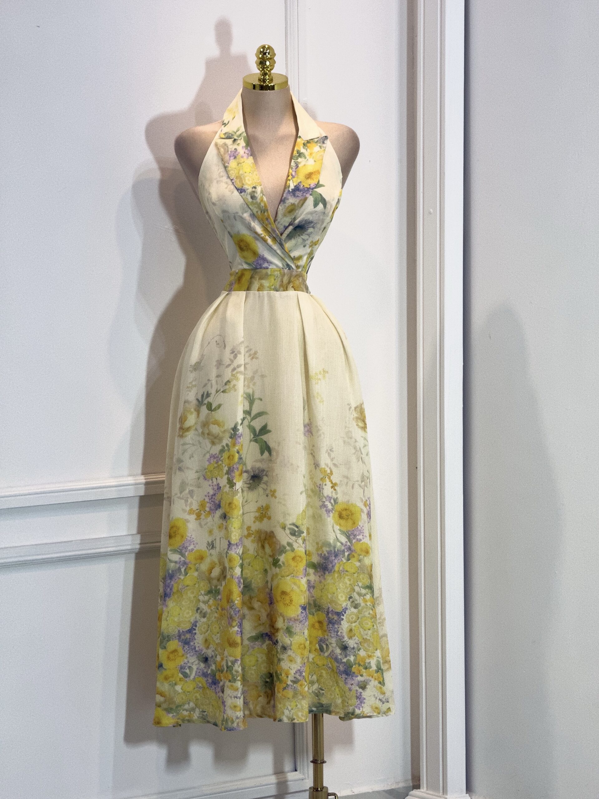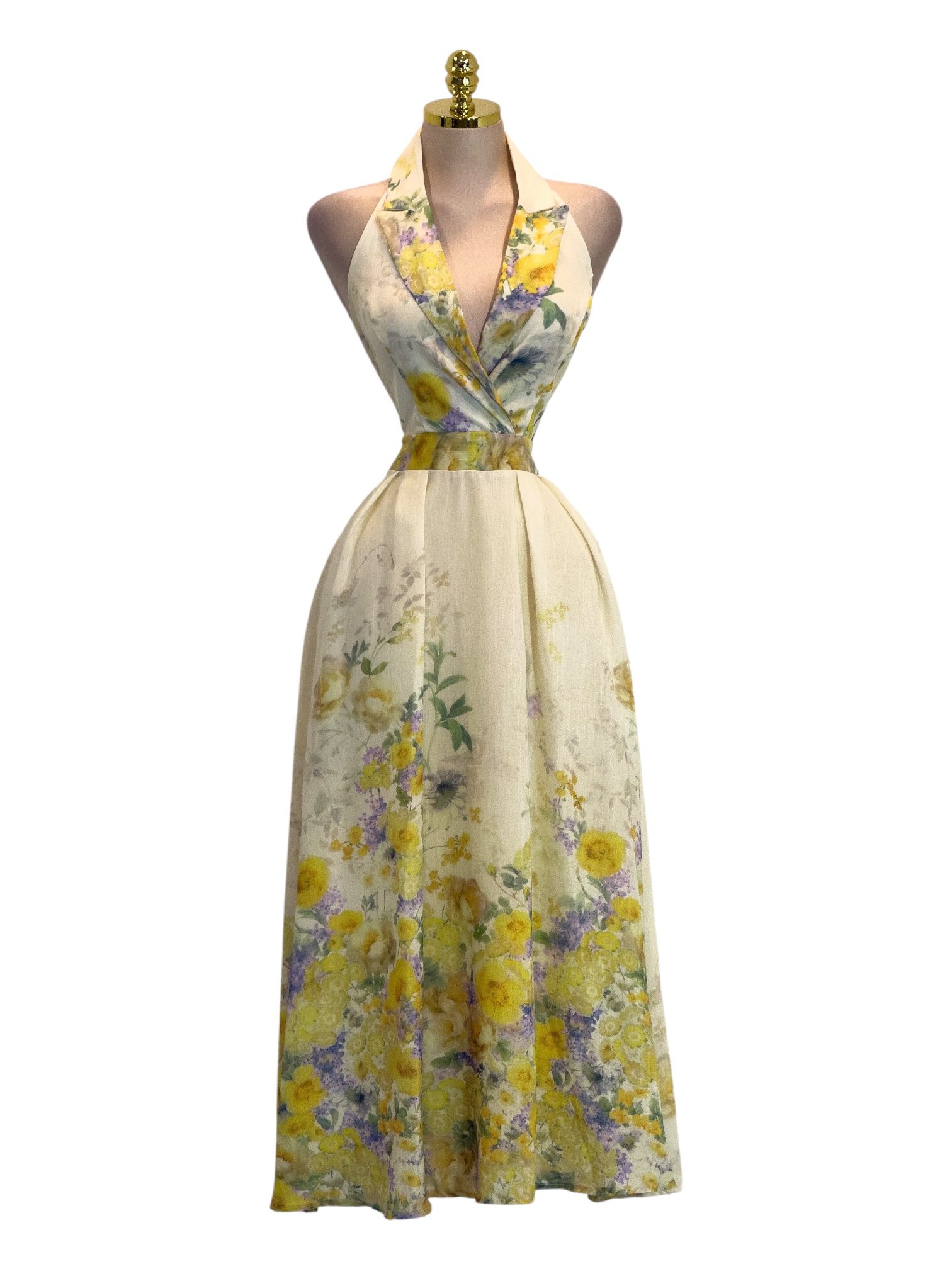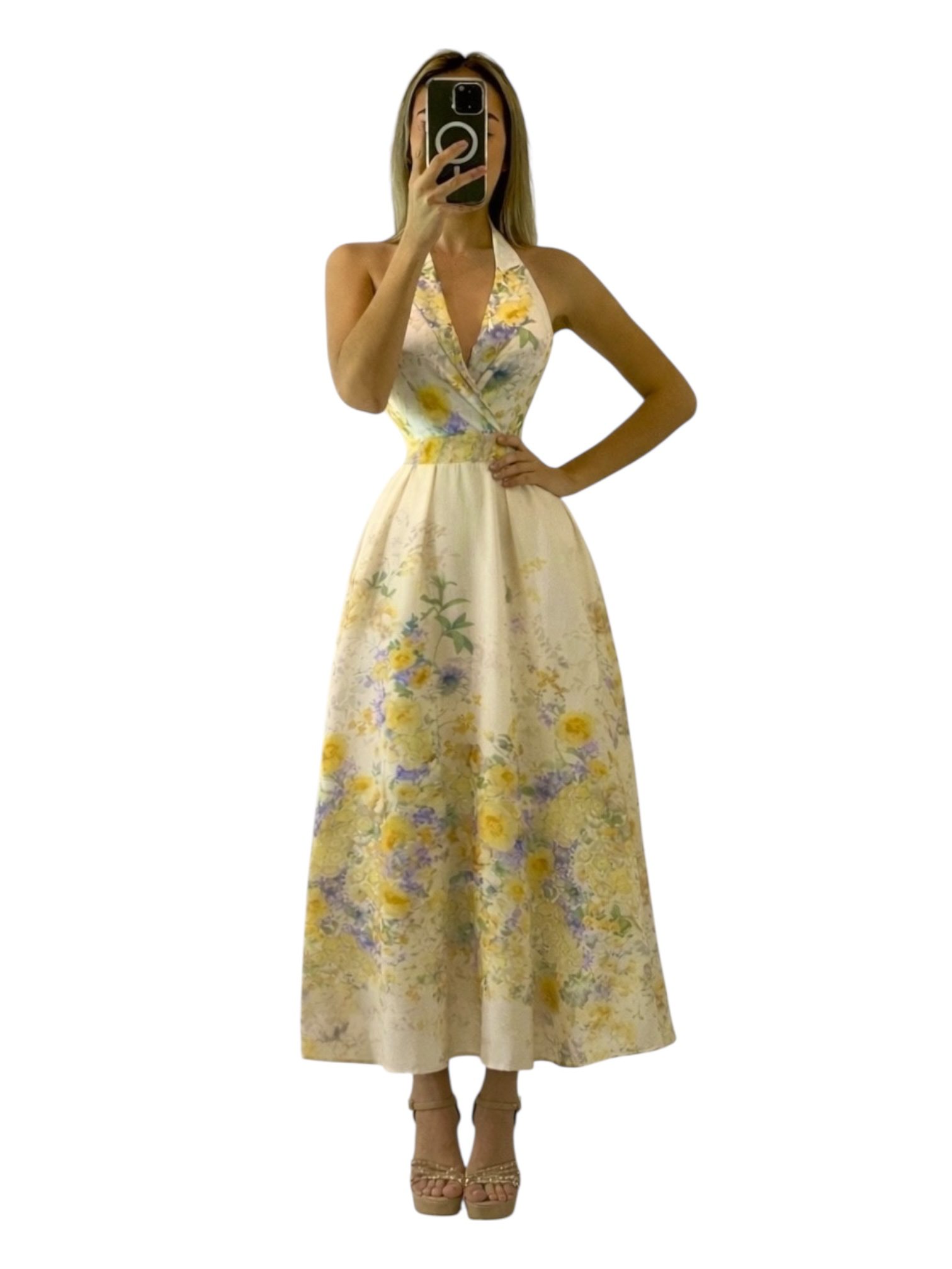 Vestido largo en delicado tono beige con elegante estampado floral en suaves matices amarillos, lilas y verdes. Presenta escote profundo tipo halter que estiliza el cuello y realza el busto de forma femenina y sofisticada. El cuerpo entallado define la cintura de manera favorecedora, mientras que la falda larga de caída fluida y plisada aporta movimiento, ligereza y un acabado etéreo. Confeccionado en tejido ligero y vaporoso que brinda frescura y comodidad. Ideal para eventos de día, bodas al aire libre, celebraciones especiales y ocasiones donde se busca un look elegante, romántico y refinado