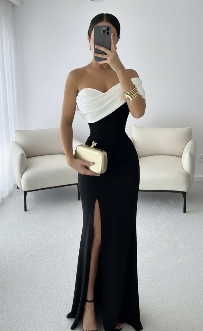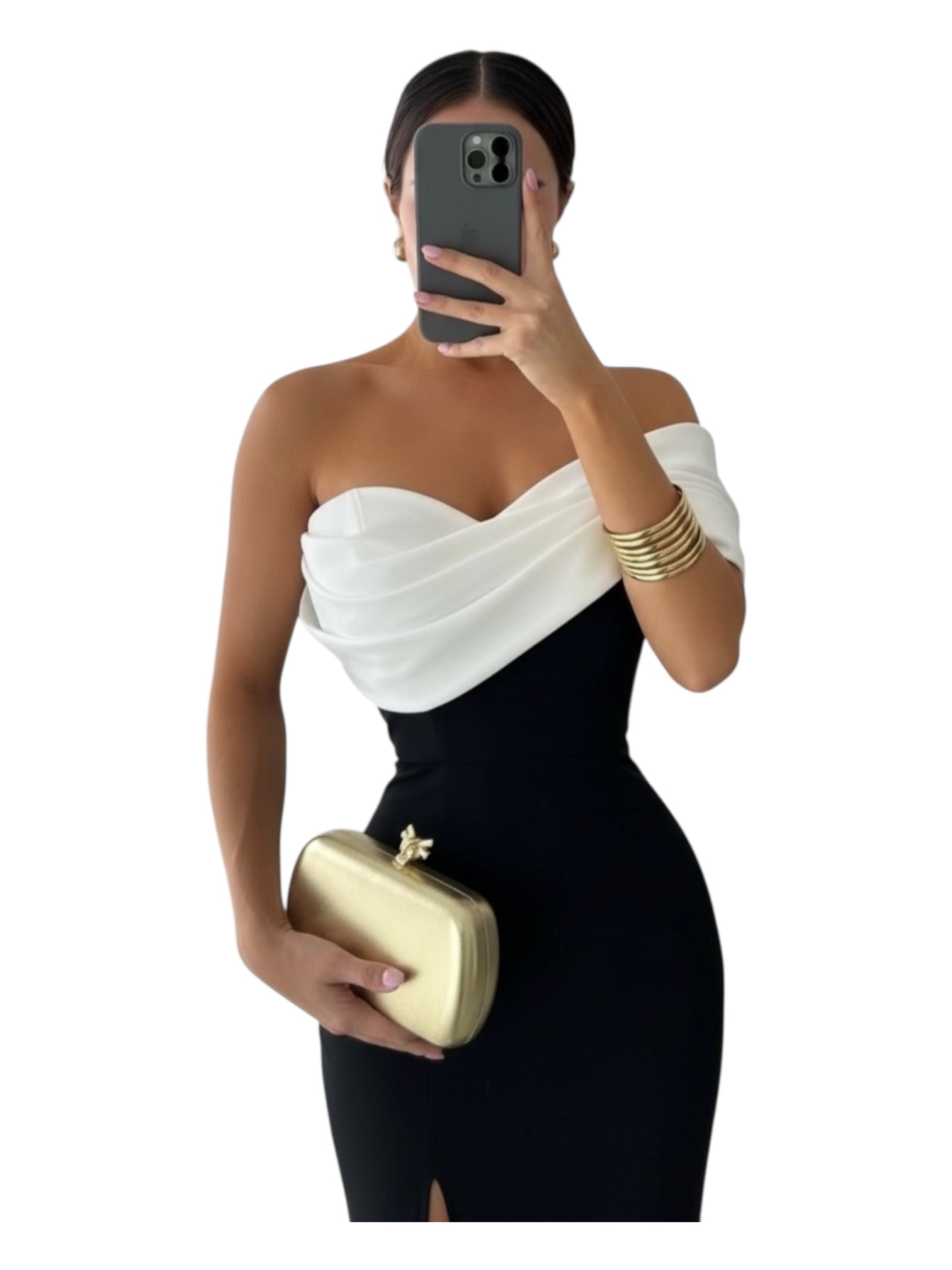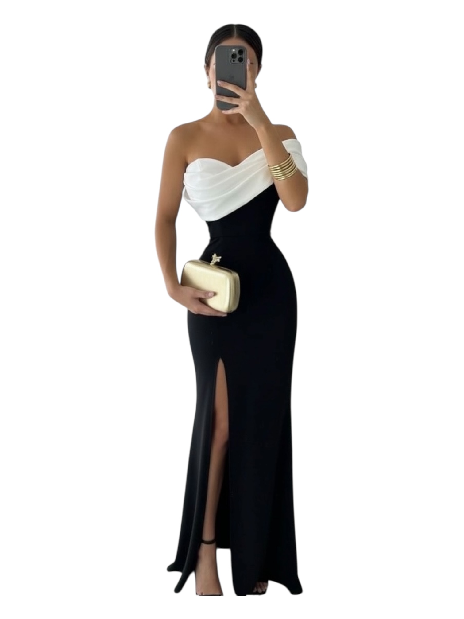 Vestido largo bicolor con un diseño elegante, moderno y altamente sofisticado. Presenta un escote asimétrico tipo palabra de honor con drapeado en tono blanco que cruza el busto, creando un contraste refinado y muy favorecedor. El cuerpo en color negro se ajusta perfectamente a la silueta, marcando la cintura y estilizando la figura de manera impecable. Incorpora una abertura frontal en la falda que aporta sensualidad y movimiento, alargando visualmente las piernas y elevando el impacto del diseño.