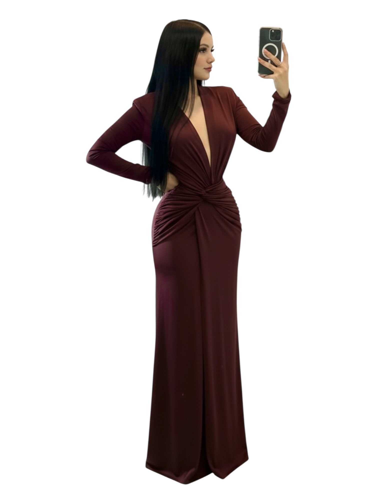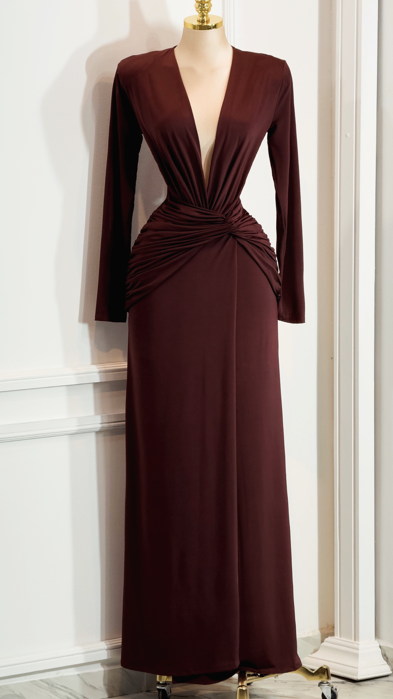 Vestido Largo Cafe Con Escote Profundo Drapeado