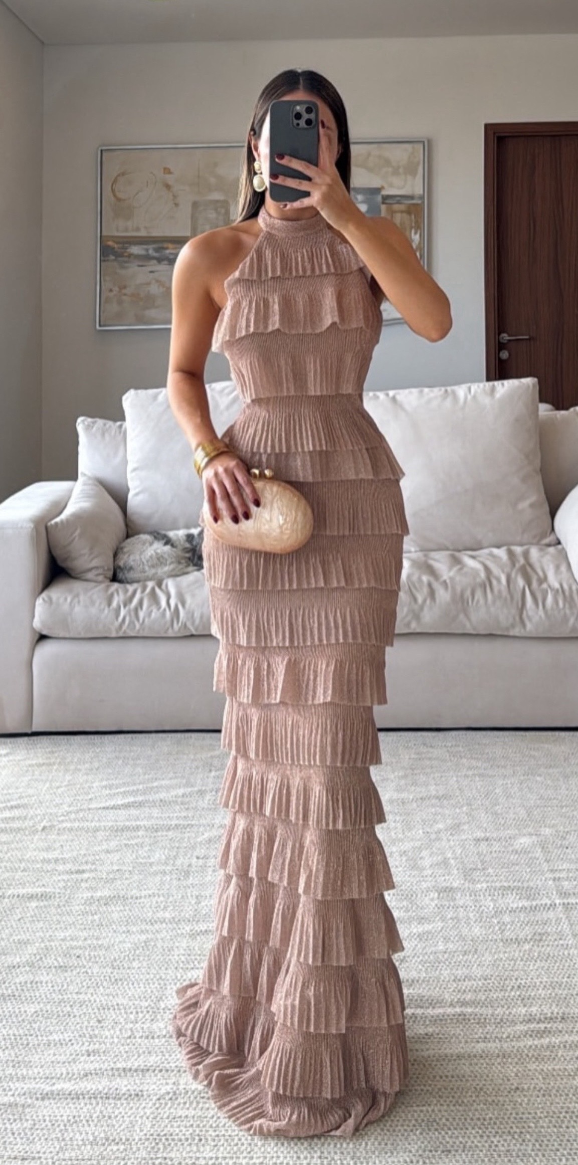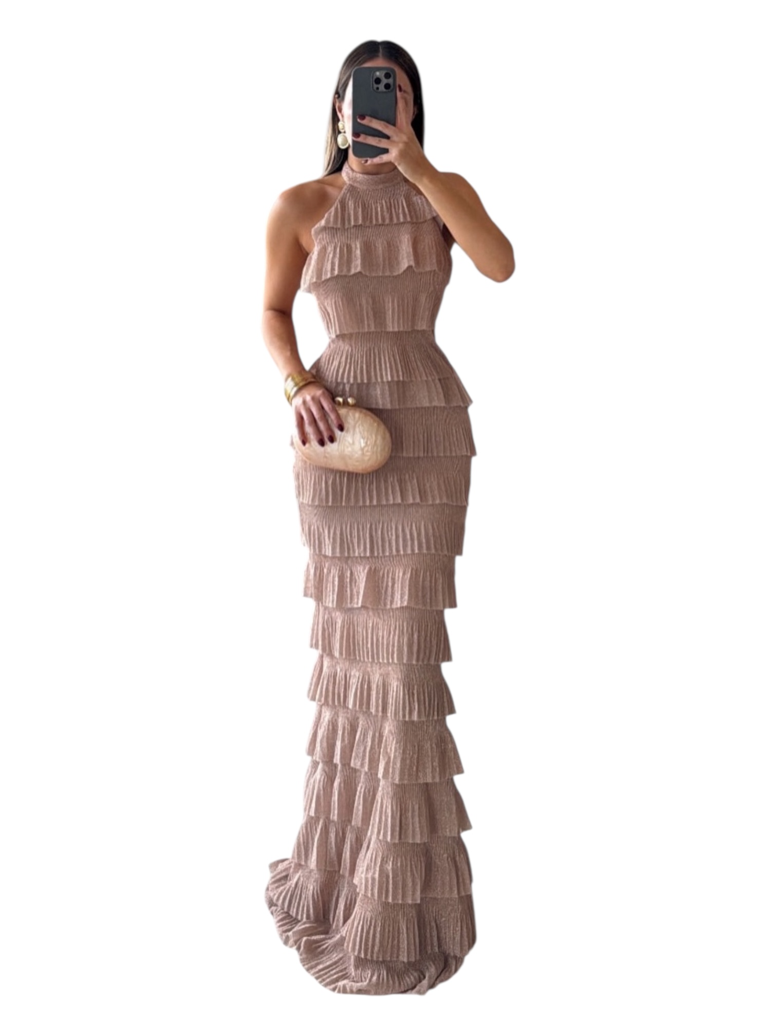 VESTIDO: LARGO NUDE CON CUELLO HALTER Y VOLANTES PLISADOS EN CAPAS
