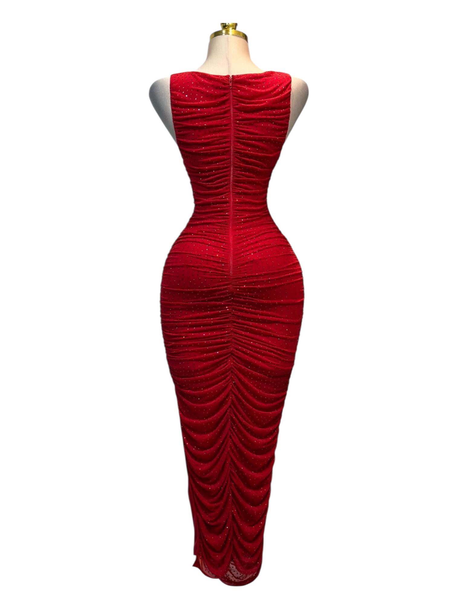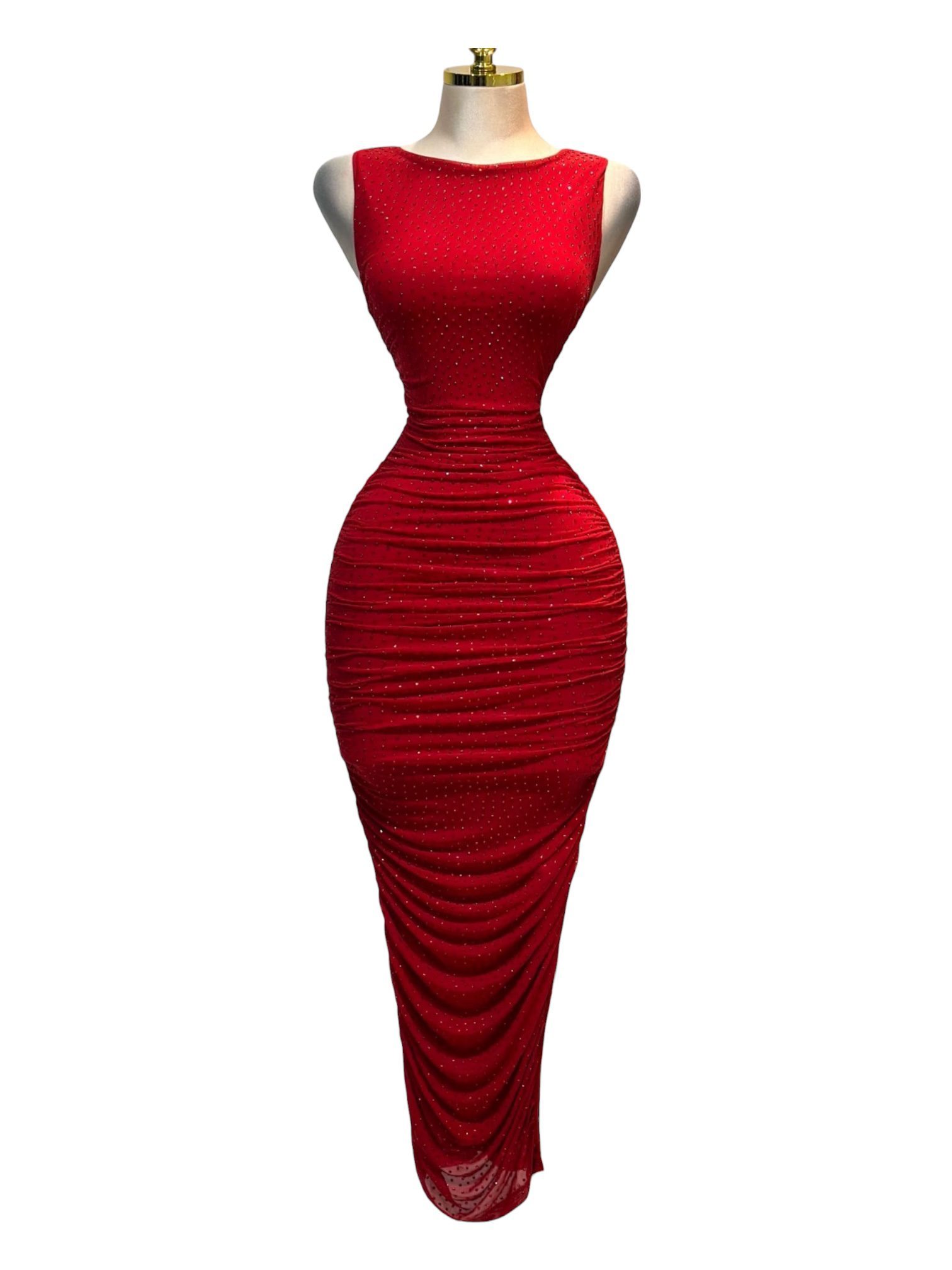 Vestido largo en tono rojo, confeccionado en malla con delicada pedrería distribuida en todo el diseño. Presenta escote redondo, diseño sin mangas y corte ajustado tipo bodycon. Incorpora drapeado horizontal en la cintura, cadera y falda que estiliza la silueta y aporta un efecto elegante y sofisticado. Ideal para eventos formales, fiestas nocturnas y ocasiones especiales.