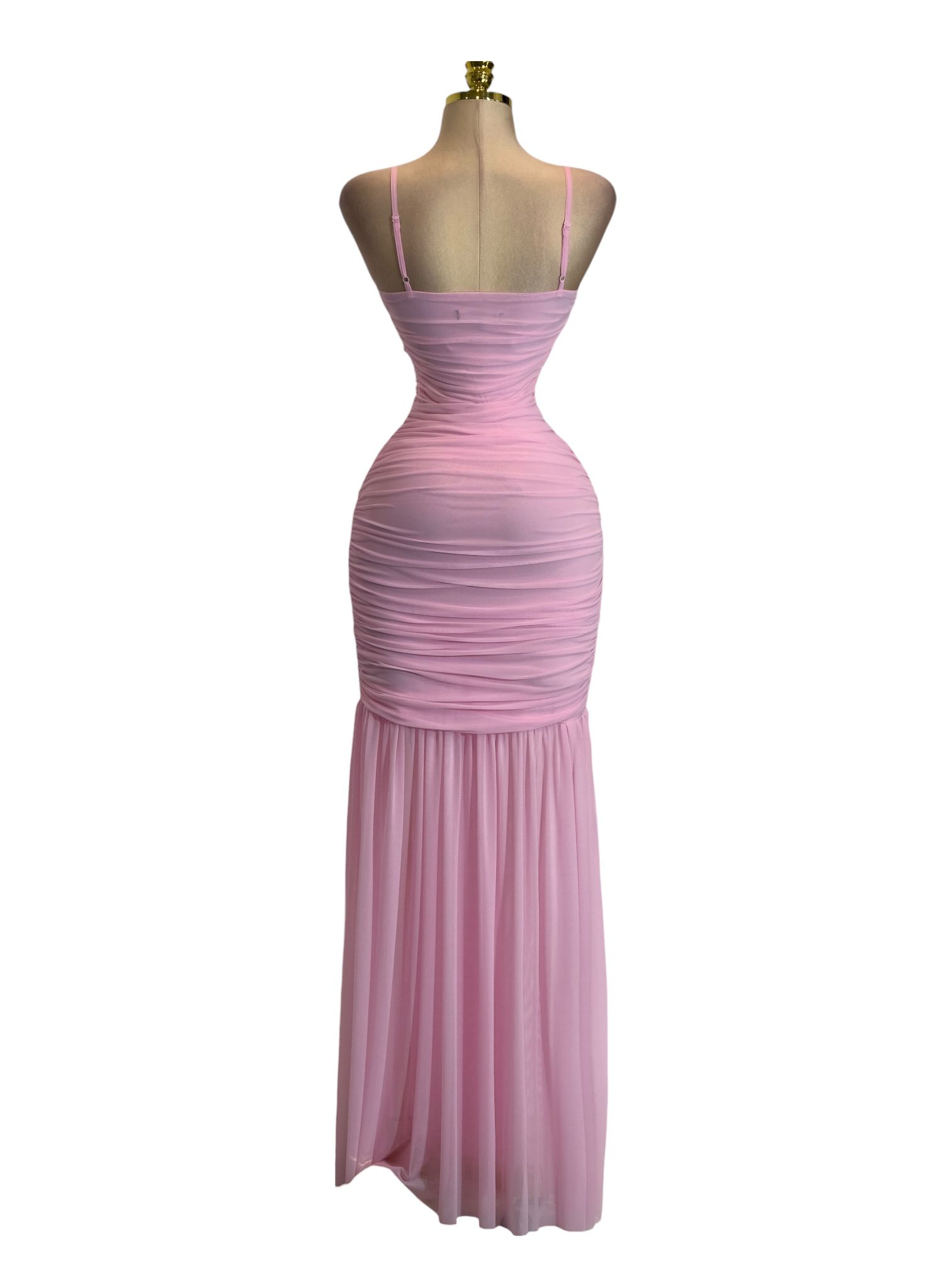 Vestido largo en tono rosa suave con diseño elegante y romántico que realza la silueta de manera delicada y sofisticada. Presenta tirantes delgados que enmarcan los hombros con sutileza y un escote fruncido tipo corset con drapeado cruzado en el busto, que aporta un efecto envolvente y femenino.