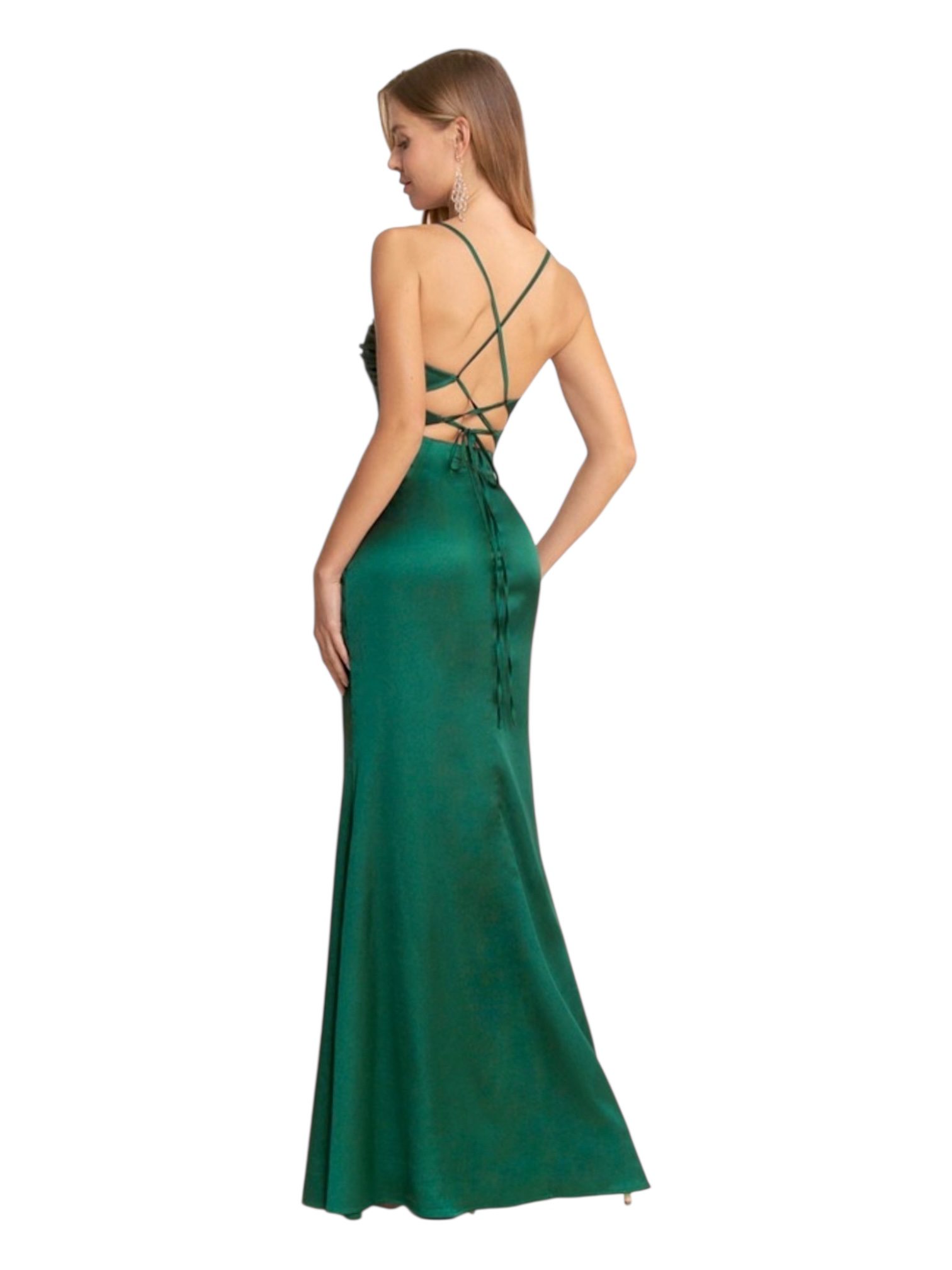 VESTIDO: LARGO VERDE ESMERALDA CON ESCOTE CORAZÓN Y ABERTURA FRONTAL