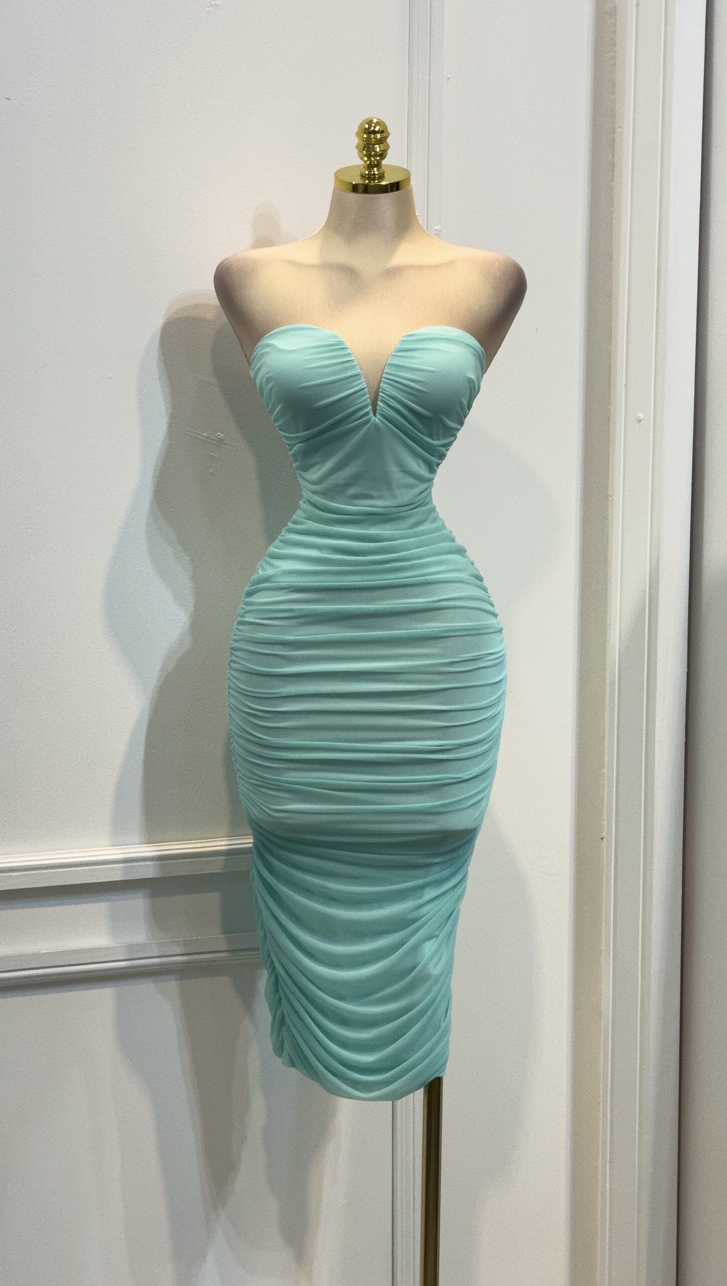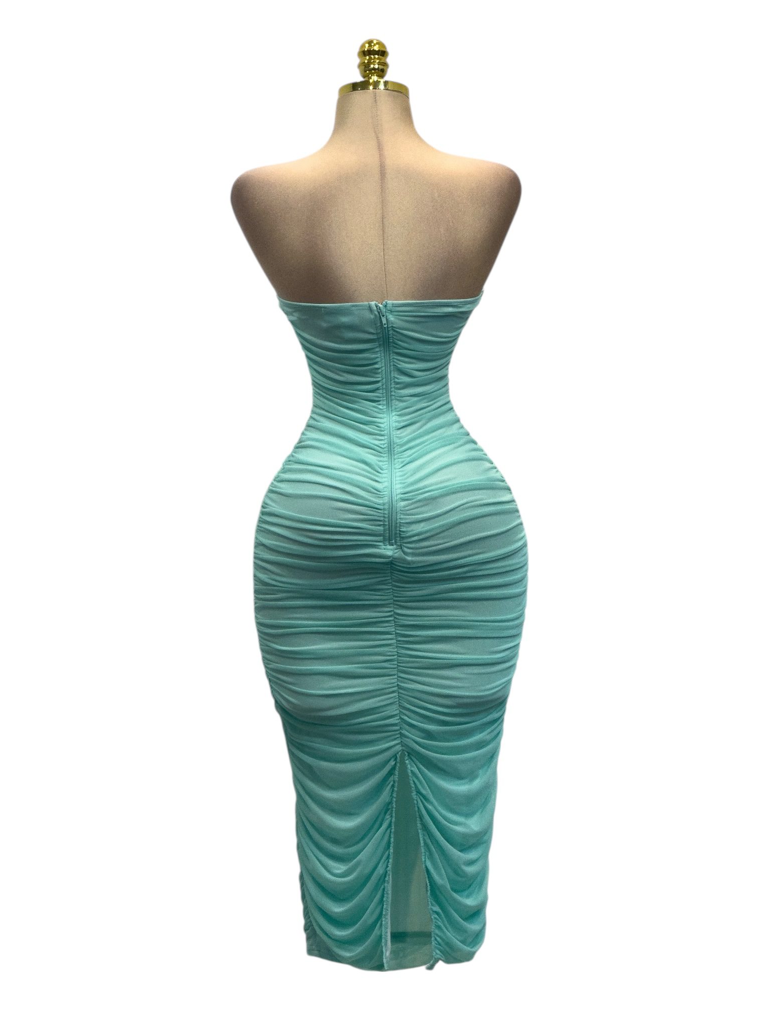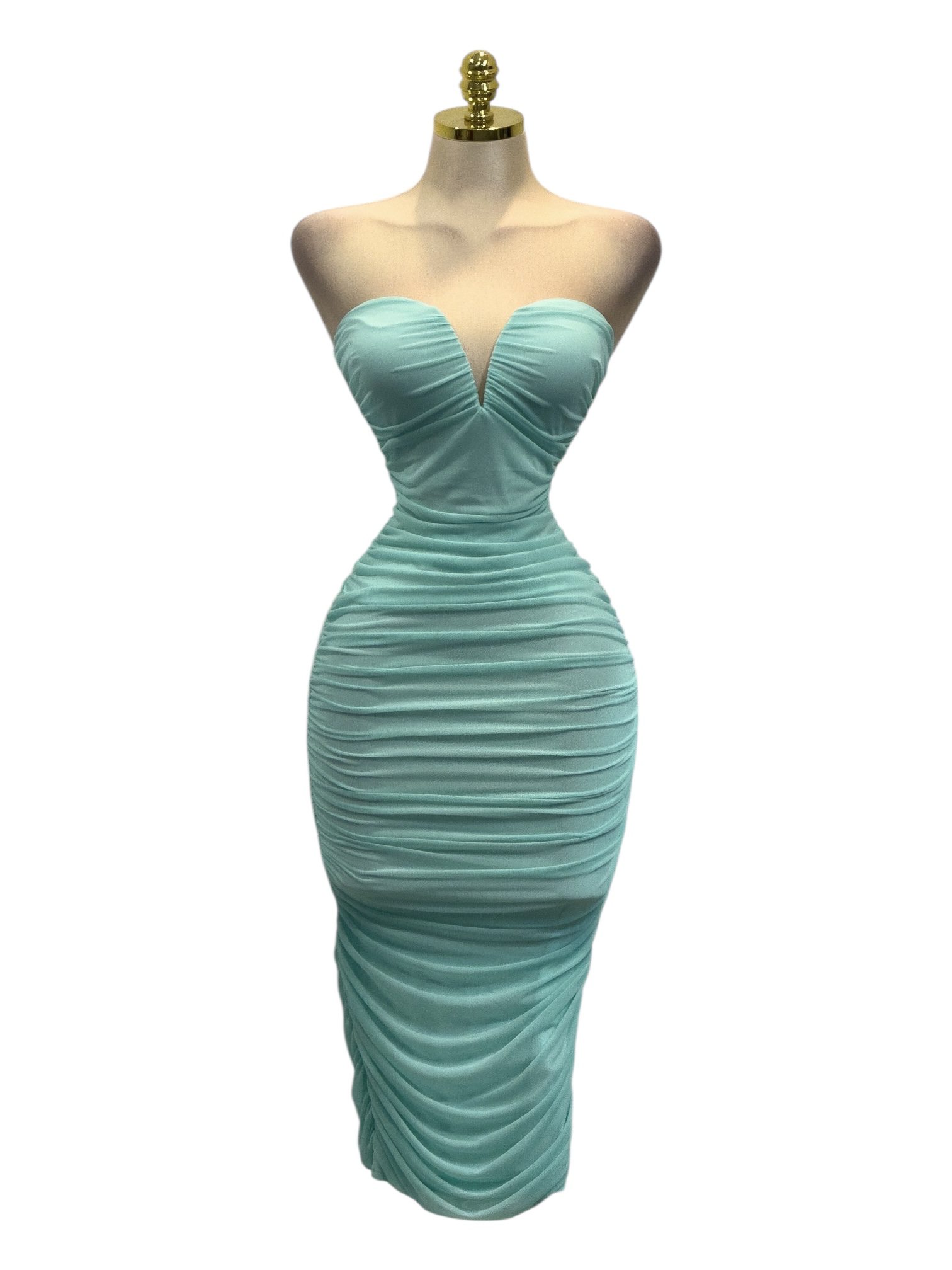 Vestido largo strapless en tono verde, de corte ajustado tipo bodycon. Presenta escote en V suave y drapeado continuo que estiliza la silueta. Ideal para eventos formales y ocasiones especiales.