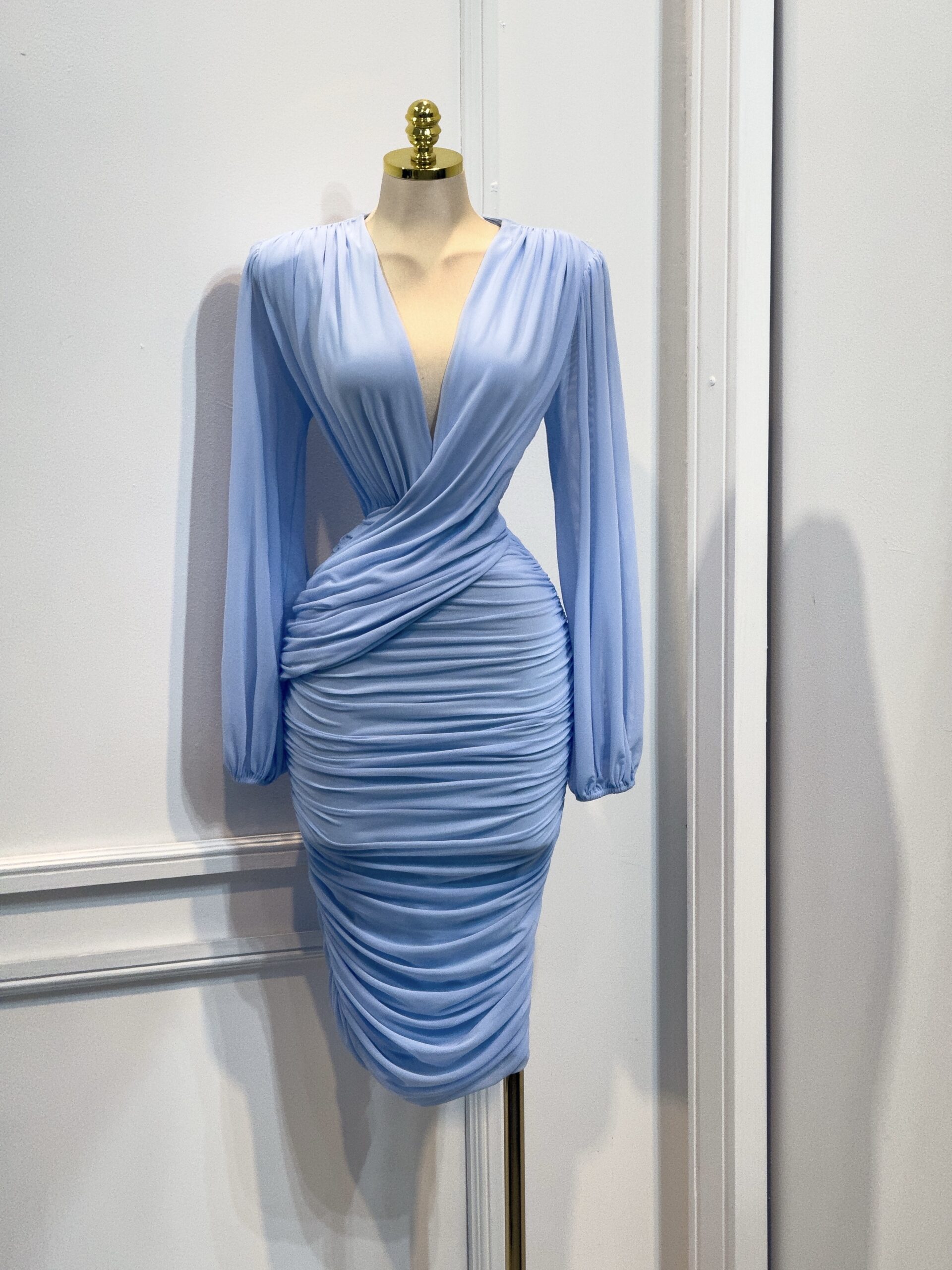 Vestido midi en tono azul con escote en V profundo y manga larga. Diseño ajustado con efecto cruzado y drapeado frontal que estiliza la silueta. Elegante y sofisticado, ideal para eventos de noche o celebraciones especiales.