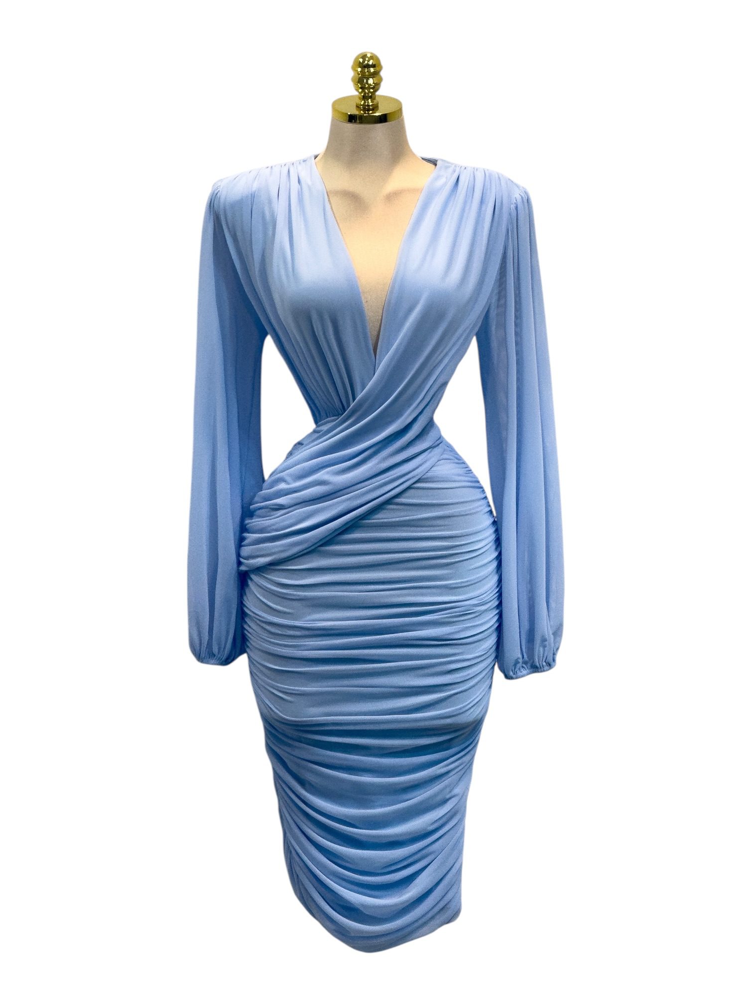Vestido Midi Azul Drapeado Con Escote Profundo Y Mangas Largas