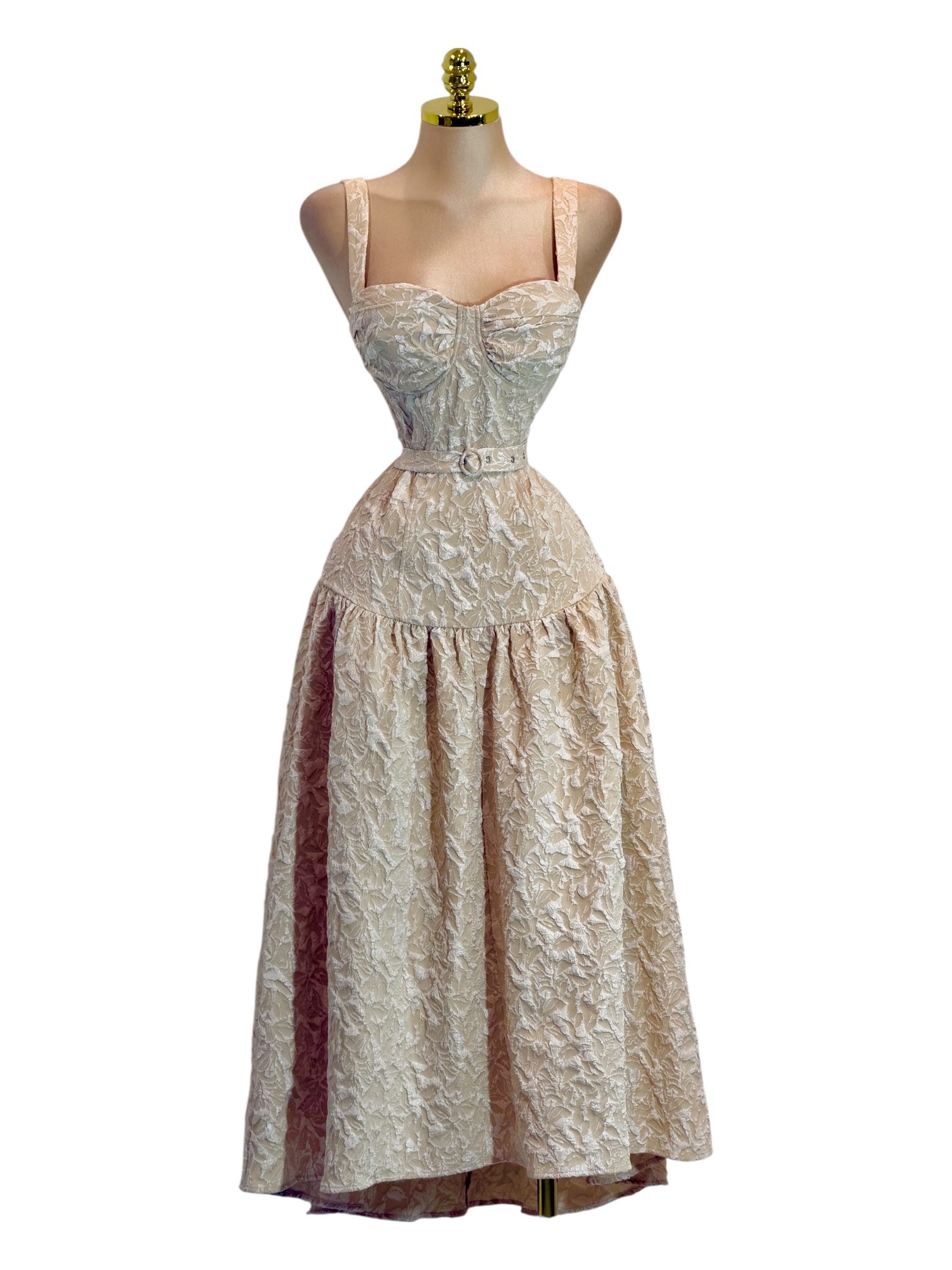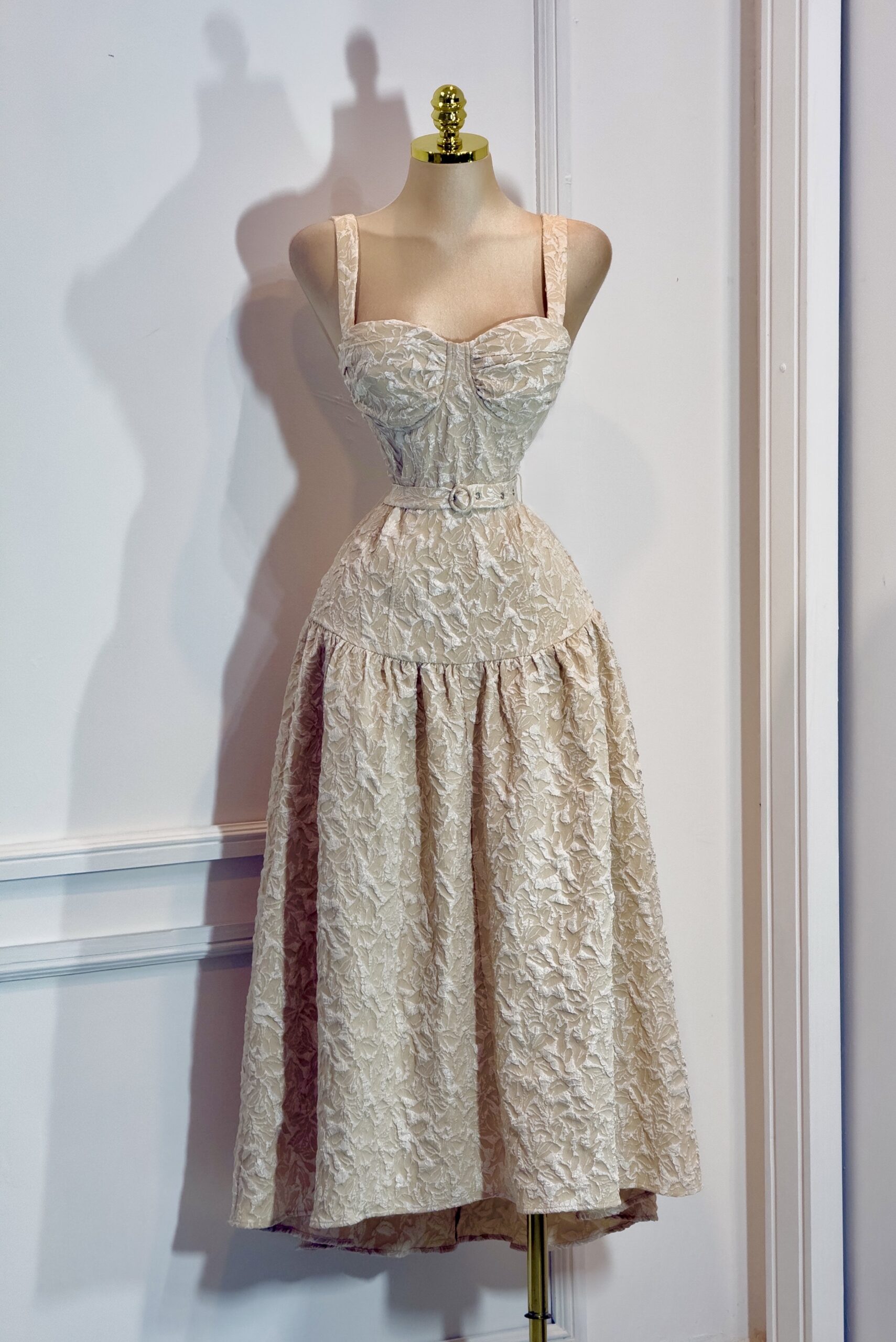 Vestido midi en tono beige con acabado texturizado. Diseño con escote corazón, tirantes anchos y cinturón al tono que define la cintura. Falda con volumen y caída elegante. Ideal para eventos de día, celebraciones y ocasiones especiales.