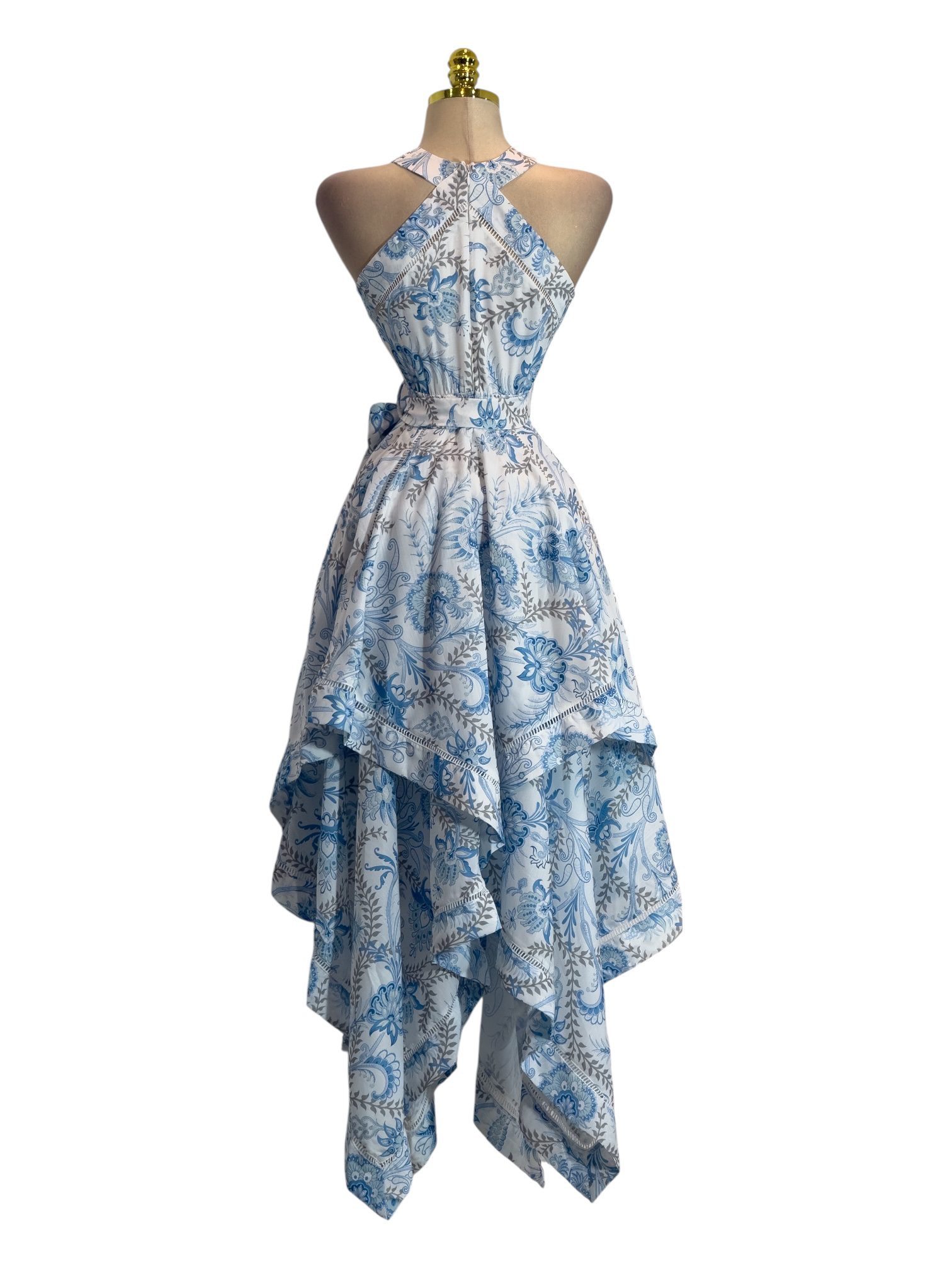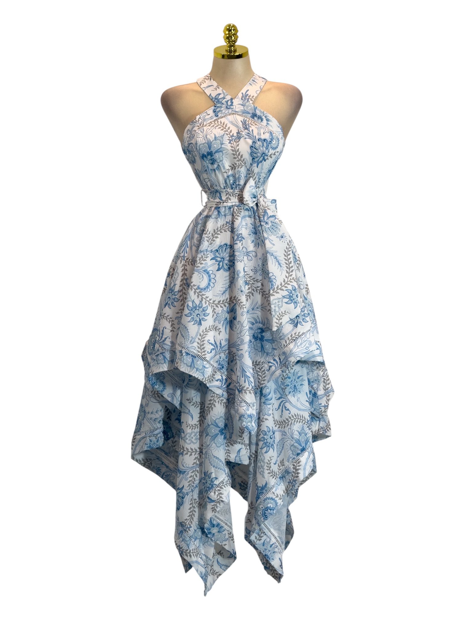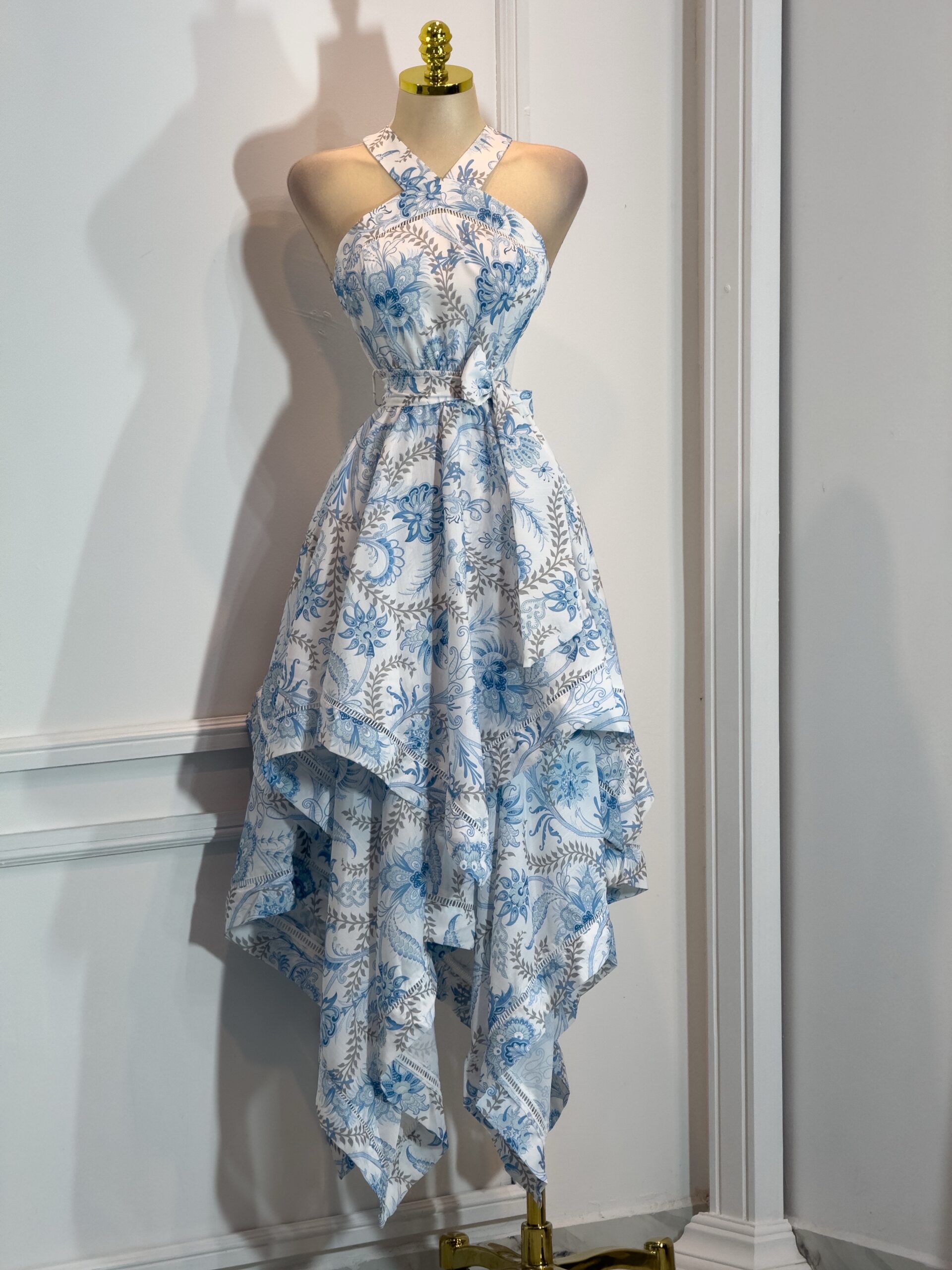 Vestido midi en tono blanco con estampado floral azul. Diseño halter cruzado al cuello y cinturón que define la cintura. La falda con capas y corte asimétrico aporta movimiento y un acabado sofisticado. Ideal para eventos de día, bodas y ocasiones especiales.