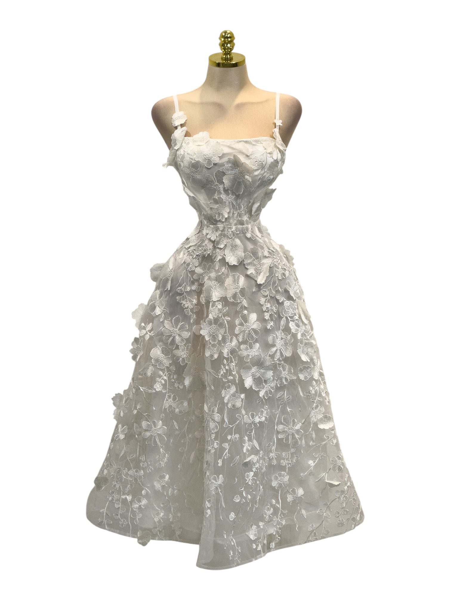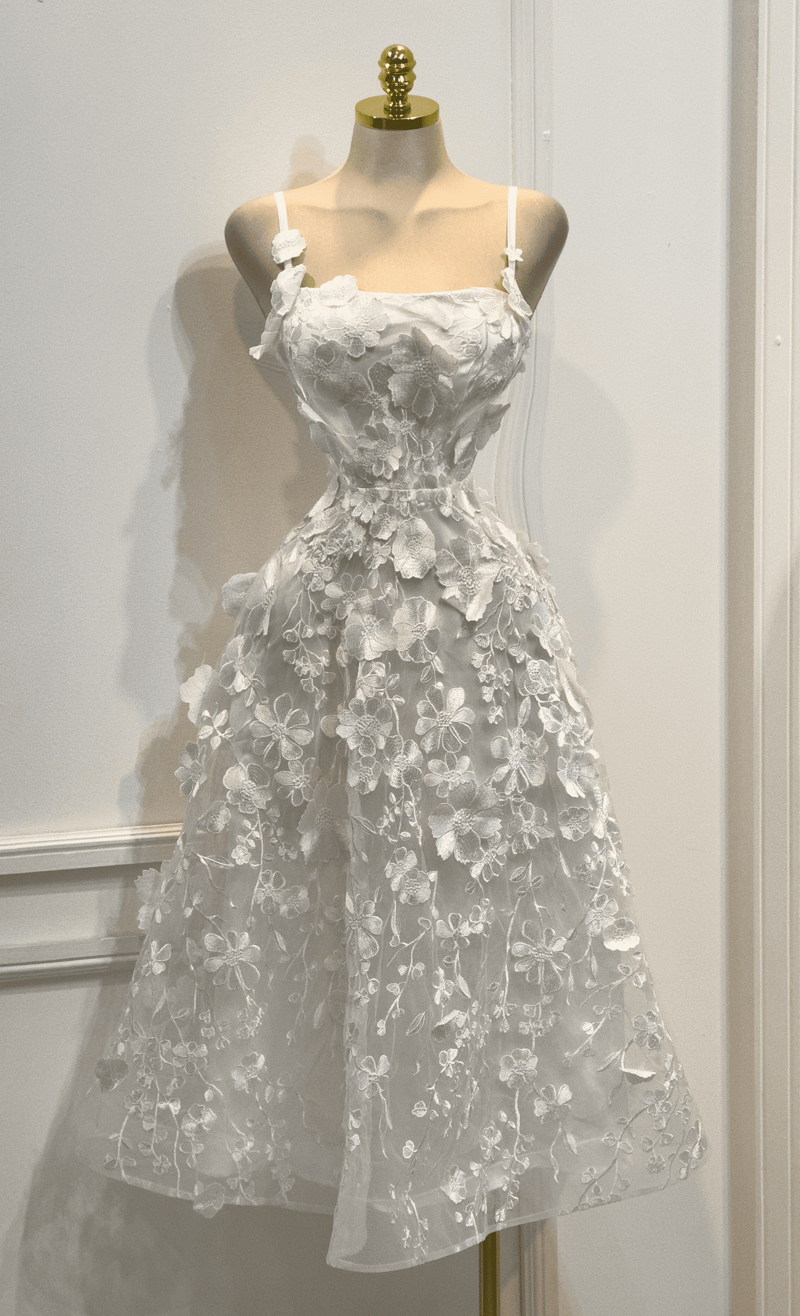 Vestido corto en tono blanco con delicadas aplicaciones florales en relieve. Tirantes delgados y escote recto que aportan un toque romántico. Falda con ligero volumen y caída suave, ideal para eventos especiales o celebraciones elegantes.