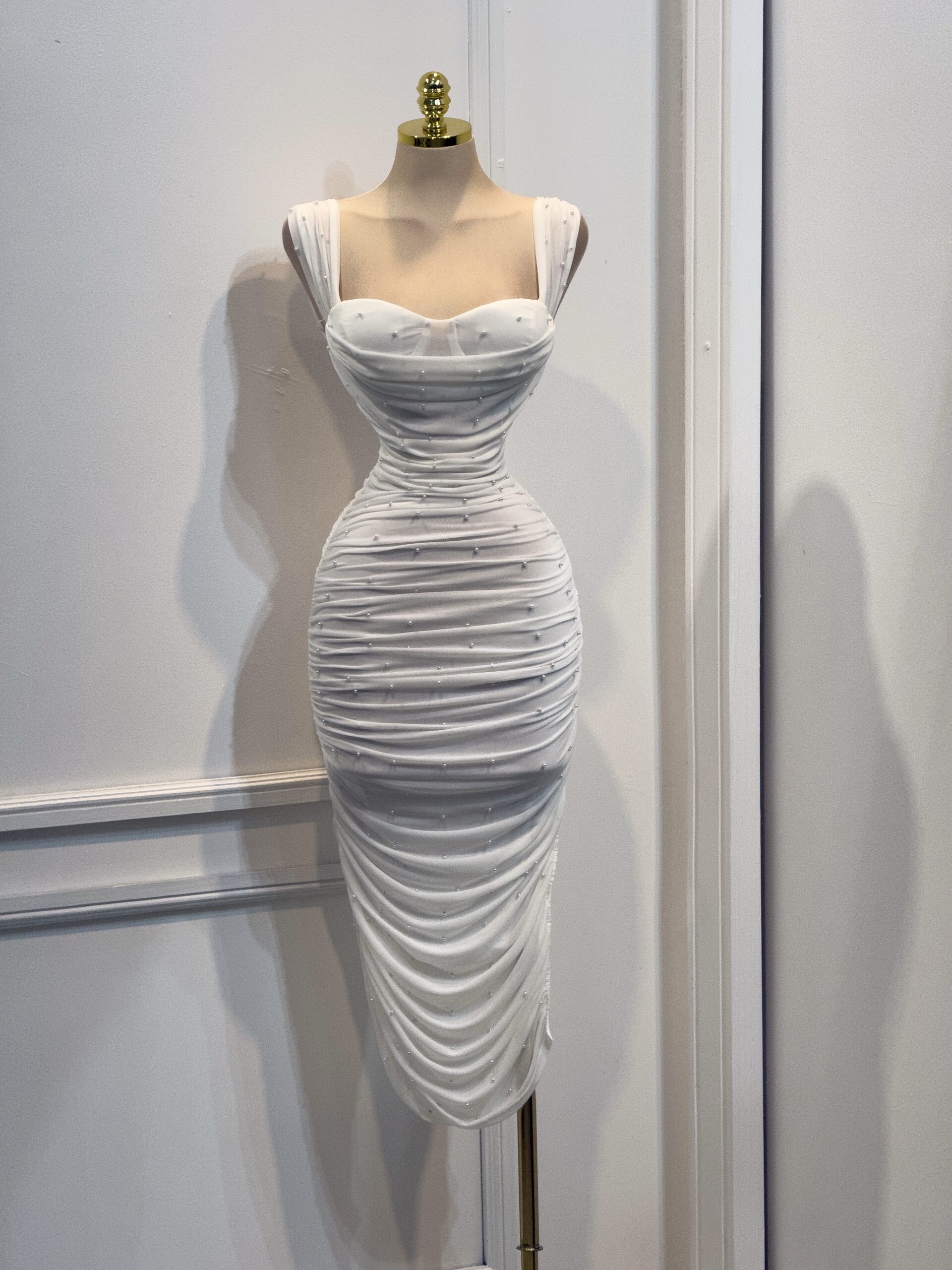 Vestido Midi Blanco Con Perlas Y Drapeado Elegante